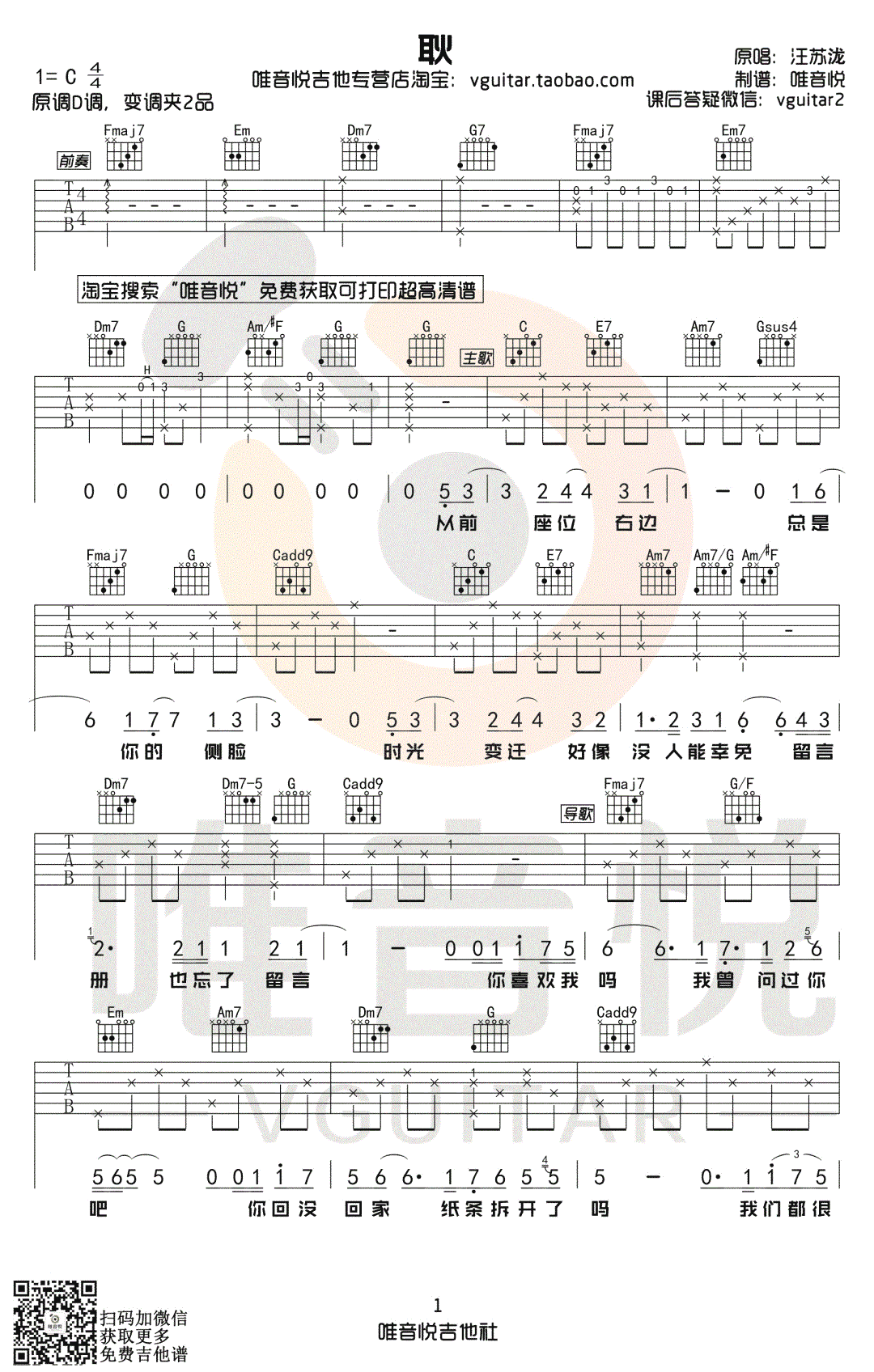 耿吉他谱_汪苏泷_C调简单版_带前奏间奏_图片谱 时间:2019-06-14 来源:唯音悦 点击:次 汪苏泷《耿》吉他谱,原调D,选调C,变调夹夹第二品,耿六线谱,带前奏间奏编配,这个简单版本在保证了原曲的感觉的前提下简化了指法,小伙伴们可以试试看哦。感谢唯音悦出品,易唱网更新分享。 《耿》是情歌小王子汪苏泷为电影《最好的我们》所演唱的毕业季主题曲,唱出关于爱情与成长的故事,带给人温暖中略显悲伤的听觉感受。