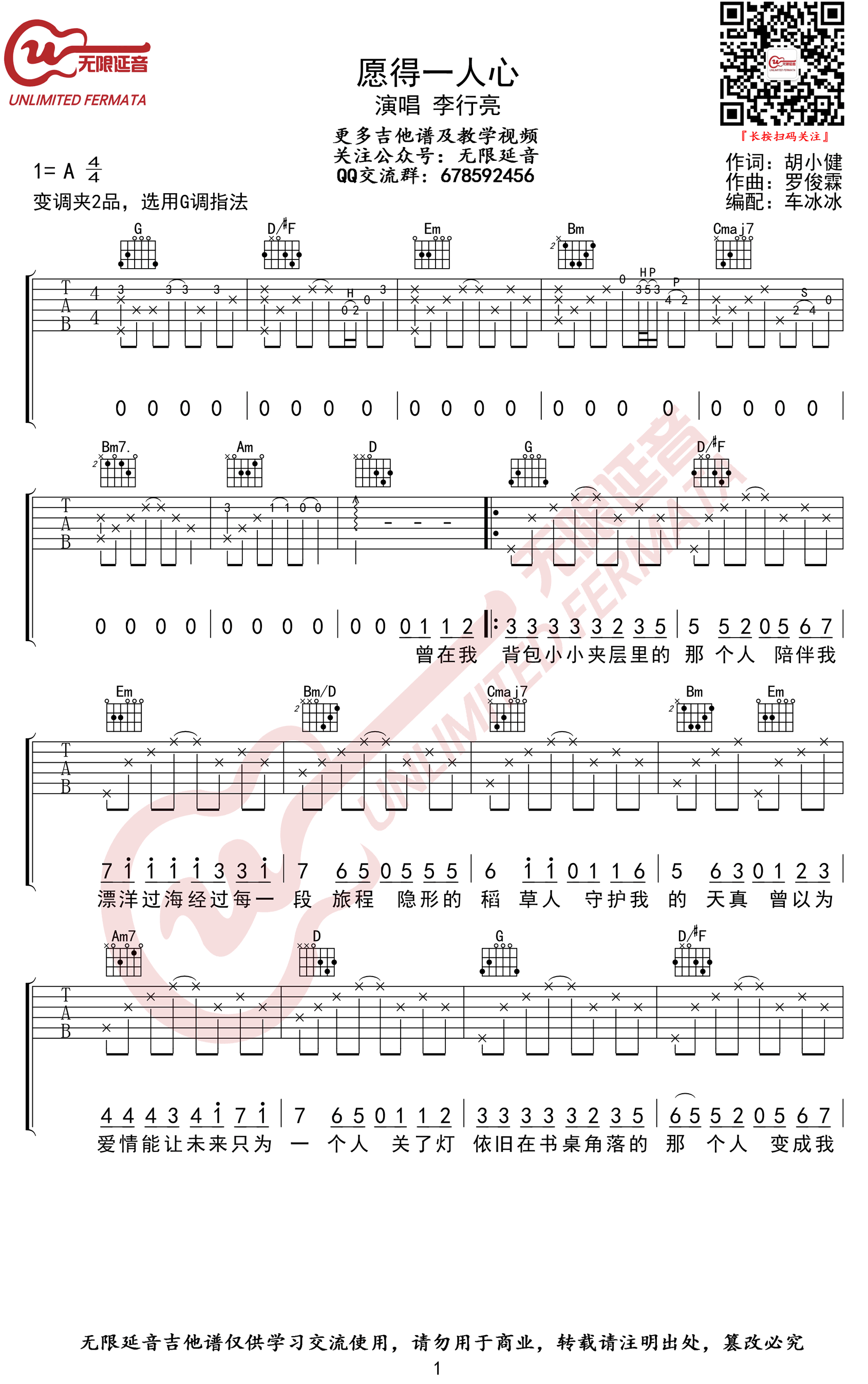愿得一人心吉他谱_李行亮_G调指法_高清弹唱谱 时间:2019-06-24 来源:无限延音 点击:次 行亮《愿得一人心》吉他谱,原调A,变调夹夹第二品,选用G调指法,连续剧《最美的时光》主题曲,愿得一人心六线谱,三张图片谱高清版,无限延音编配出品,易唱网更新上传。 只愿得一人心,白首不分离。一首暖心情歌,让人安静的歌声唱出一段温婉缠绵的故事,将一生所爱的情怀表达的淋漓尽致。