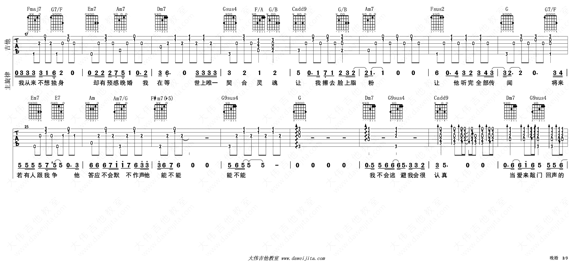 晚婚吉他谱_李宗盛/谭维维_C调弹唱谱_图片谱 时间:2019-07-02 来源:大伟吉他 点击:次 《晚婚》吉他谱,李宗盛演唱,男生调曲谱,指法音高C调,变调夹夹一品,实际音高#C调。女生推荐变调夹夹五品。晚婚六线谱,三张高清图片谱,感谢大伟吉他编配出品,易唱网上传分享。 总有那么一首歌,唱的是你过去;总有那么一句歌词,写的是你的现在;曲终人散,歌和歌词还牵绊着你的未来,让你时常想起,内心复杂,滋味万千。