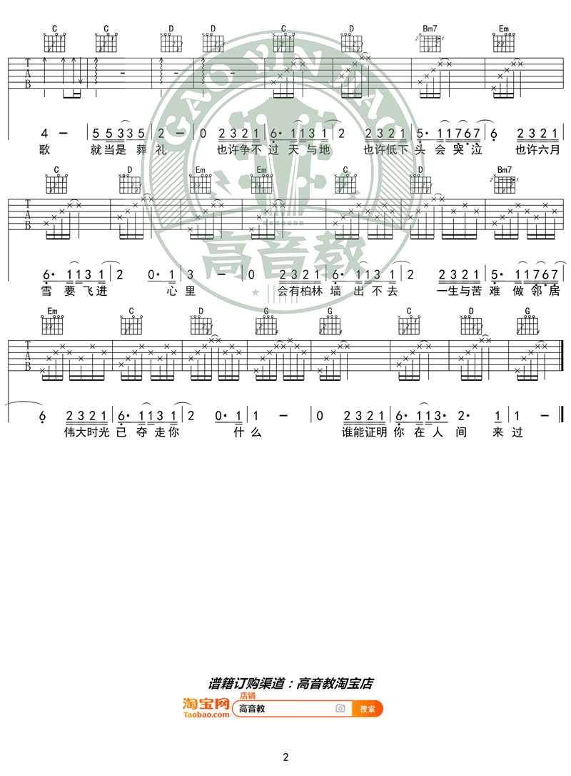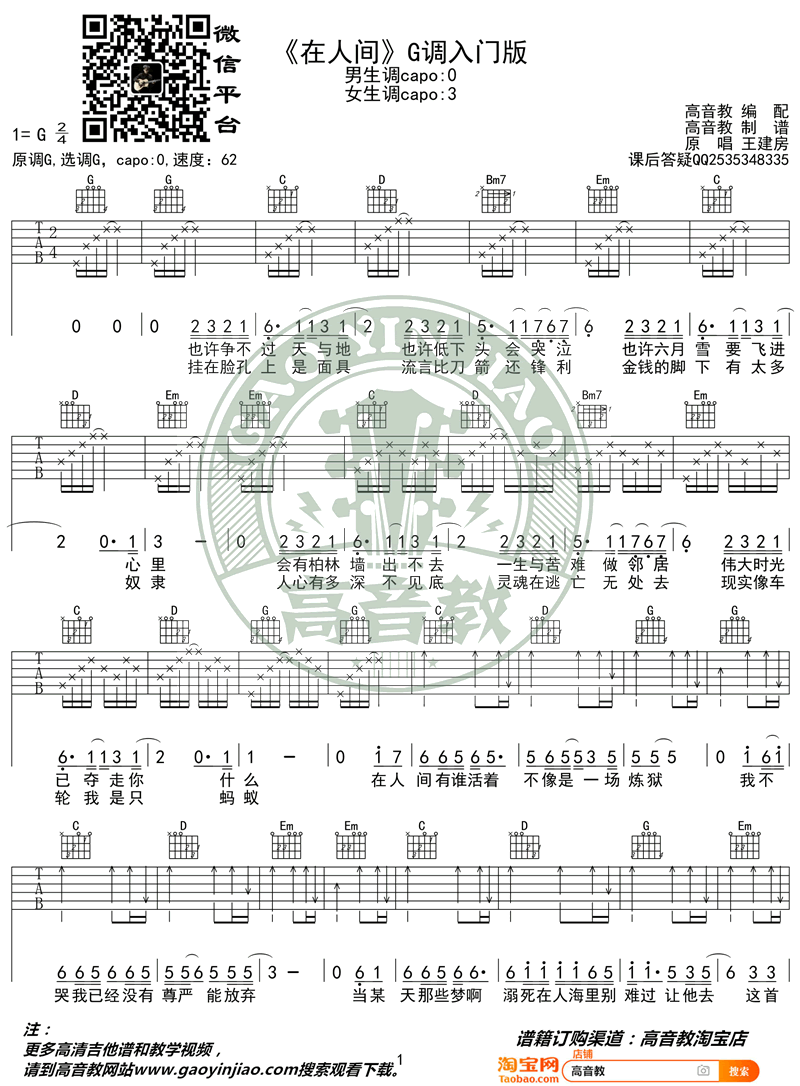 在人间吉他谱_G调简单版_王建房_吉他教学视频 时间:2019-07-08 来源:高音教 点击:次 在人间吉他谱,王建房翻唱英文歌曲《What Are Words》,歌曲的原唱是Chris Medina,在人间六线谱,G调指法入门版,女生调可以变调夹夹三品,高音教编配制谱,易唱网整理分享。随谱附上配套吉他弹唱教学视频,琴友们跟随张小迪老师的讲解示范练习。 中文版显得苍茫大气,脱离了原唱爱情的细腻悲伤,悲凉沉重的怒吼将爱放大到整个人世间。人生命运的艰难和不屈,每一句歌词都冲击感染着我们。