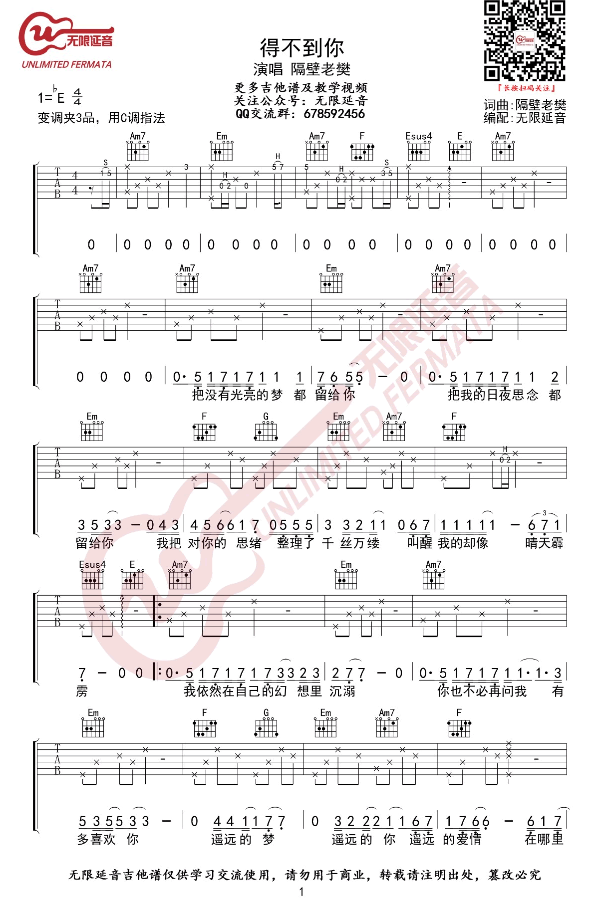 得不到你吉他谱C调_隔壁老樊_弹唱六线谱 时间:2019-07-10 来源:无限延音 点击:次 得不到你吉他谱,隔壁老樊治愈且轻柔的一首创作歌曲,得不到你六线谱,原调bE,变调夹夹三品,用C调指法,无限延音编配分享,易唱网整理上传。 隔壁老樊把这首歌唱出了一种别致的沧桑感,得不到你,你却在我心里,因为遥不可及的你,才让这爱情变得惆怅与彷徨。生命中某个人些,那段情,终将成了我们年少时最难忘怀的梦。
