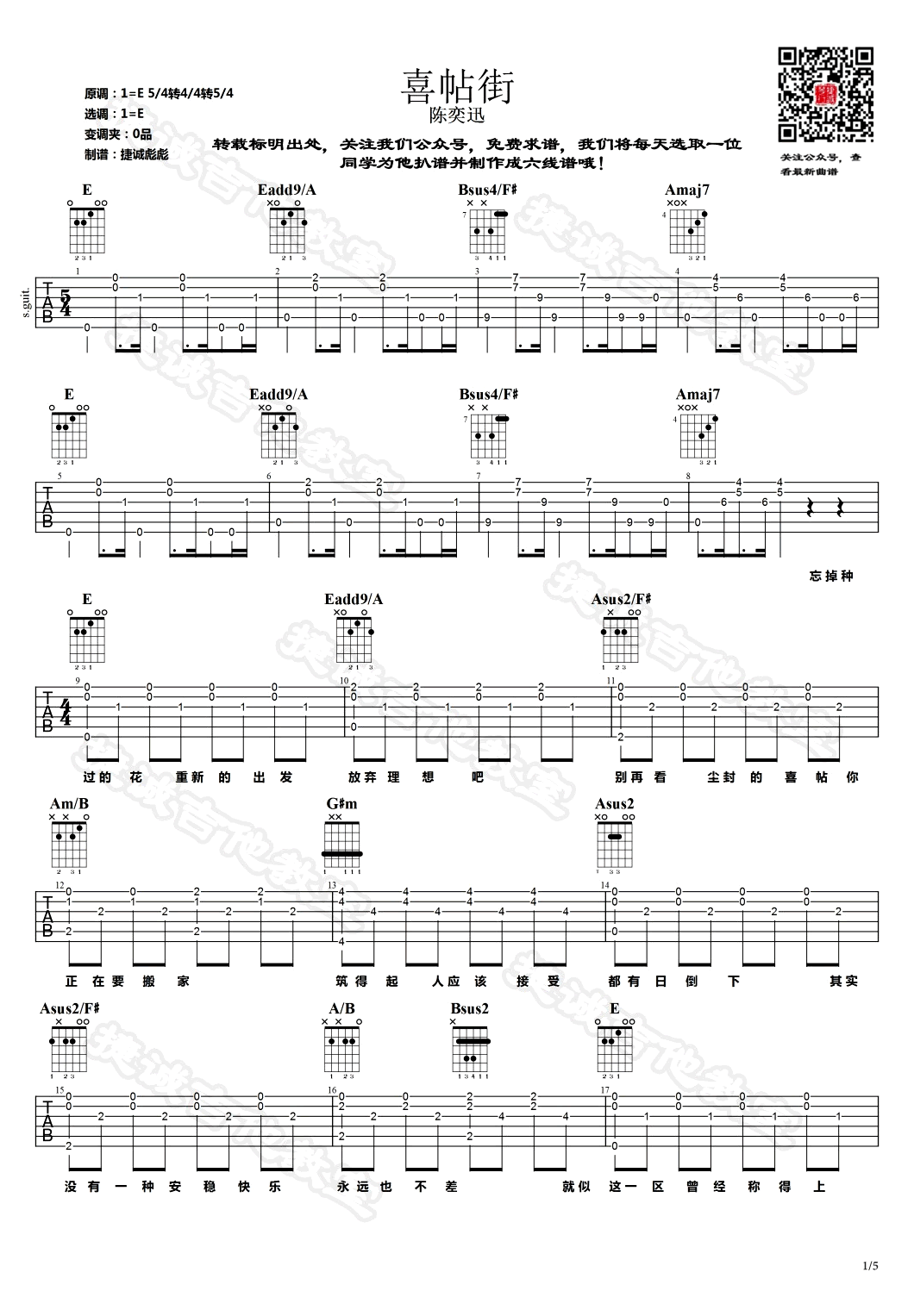 喜帖街吉他谱_陈奕迅_E调弹唱谱_图片谱 时间:2019-07-11 来源:捷诚吉他教室 点击:次 《喜帖街》吉他谱,陈奕迅演唱的一首粤语歌曲,女生版原唱是谢安琪,喜帖街六线谱,E调编配,完整版共五张弹唱图片谱。捷诚吉他教室制谱出品,易唱网整理分享。 《喜帖街》代表了一种怀旧,一份被现代文明下的老城情结。我们那回不去的,是承载着几代人记忆的街道巷口,到不了的,是转瞬即逝的的美丽旧年华。