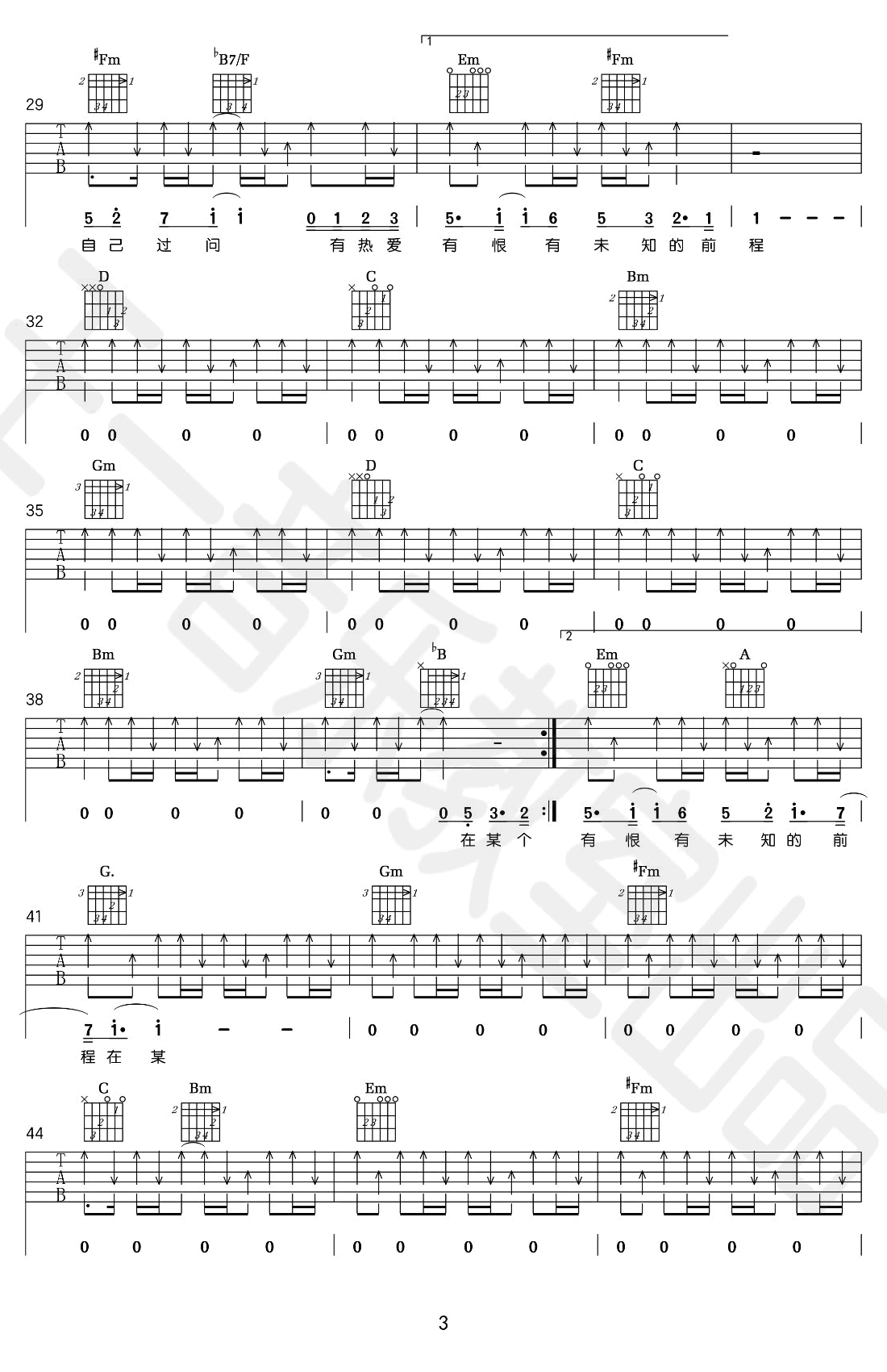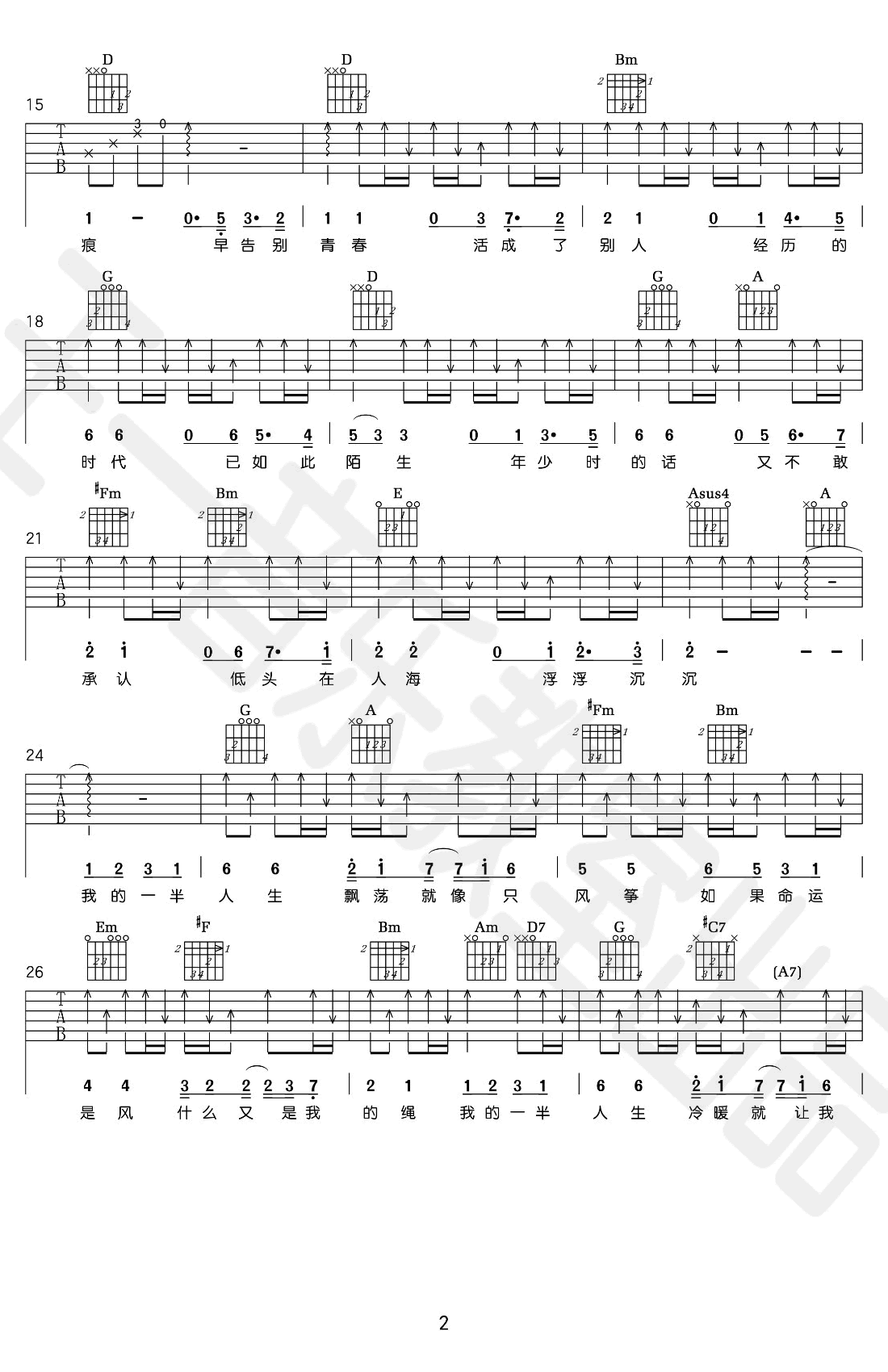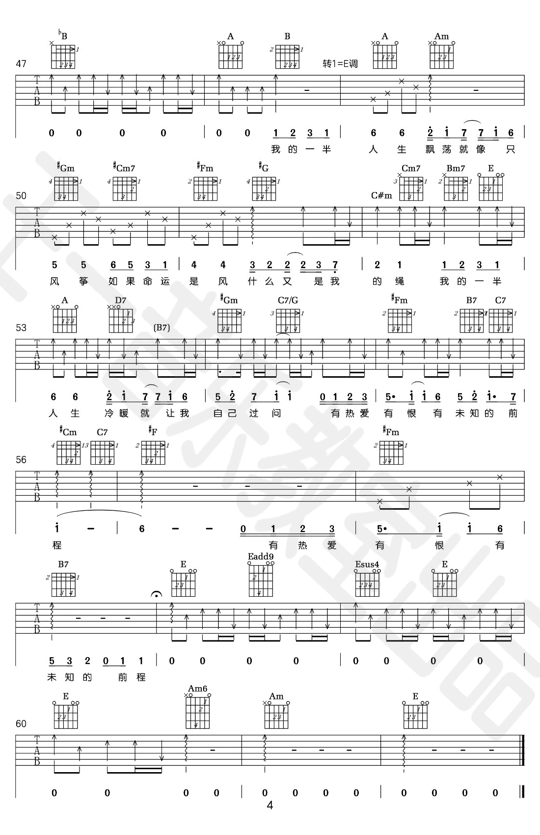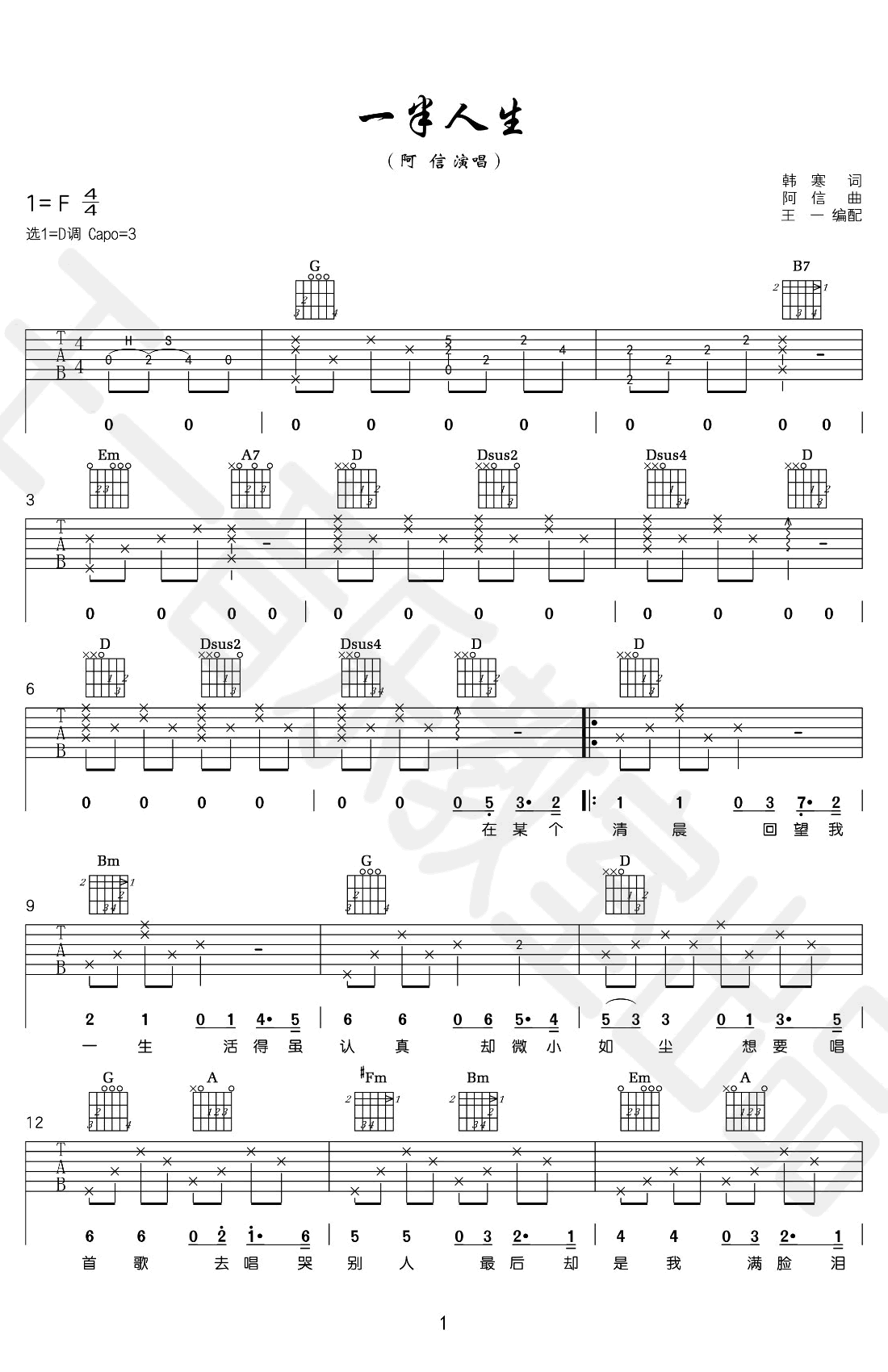 一半人生吉他谱_五月天阿信_D调指法_弹唱教学视频 时间:2019-07-17 来源:王一 点击:次 一半人生吉他谱,五月天阿信为韩寒电影《飞驰人生》献唱主题曲,原调F,选用D调指法,capo夹三品。一半人生六线谱,四张图片谱,感谢王一老师编配分享,易唱网整理上传。随谱附上《一半人生》吉他弹唱教学视频,琴友们参照示范讲解学习。 每个人都有过梦想,或许你正在追逐的路上,真挚的歌词,细腻的旋律,撩拨每一个人心中的不甘与执着。把这首《一半人生》唱给自己,唱给他人,唱给一路与你同行的那个Ta。