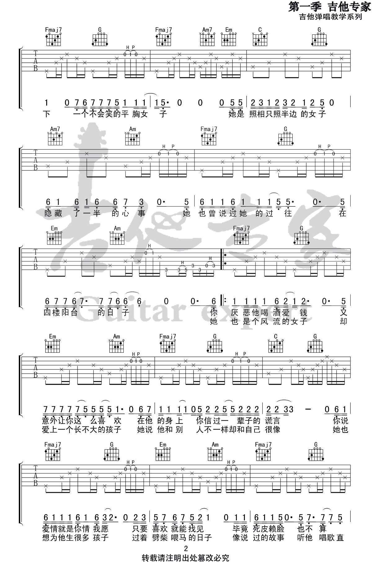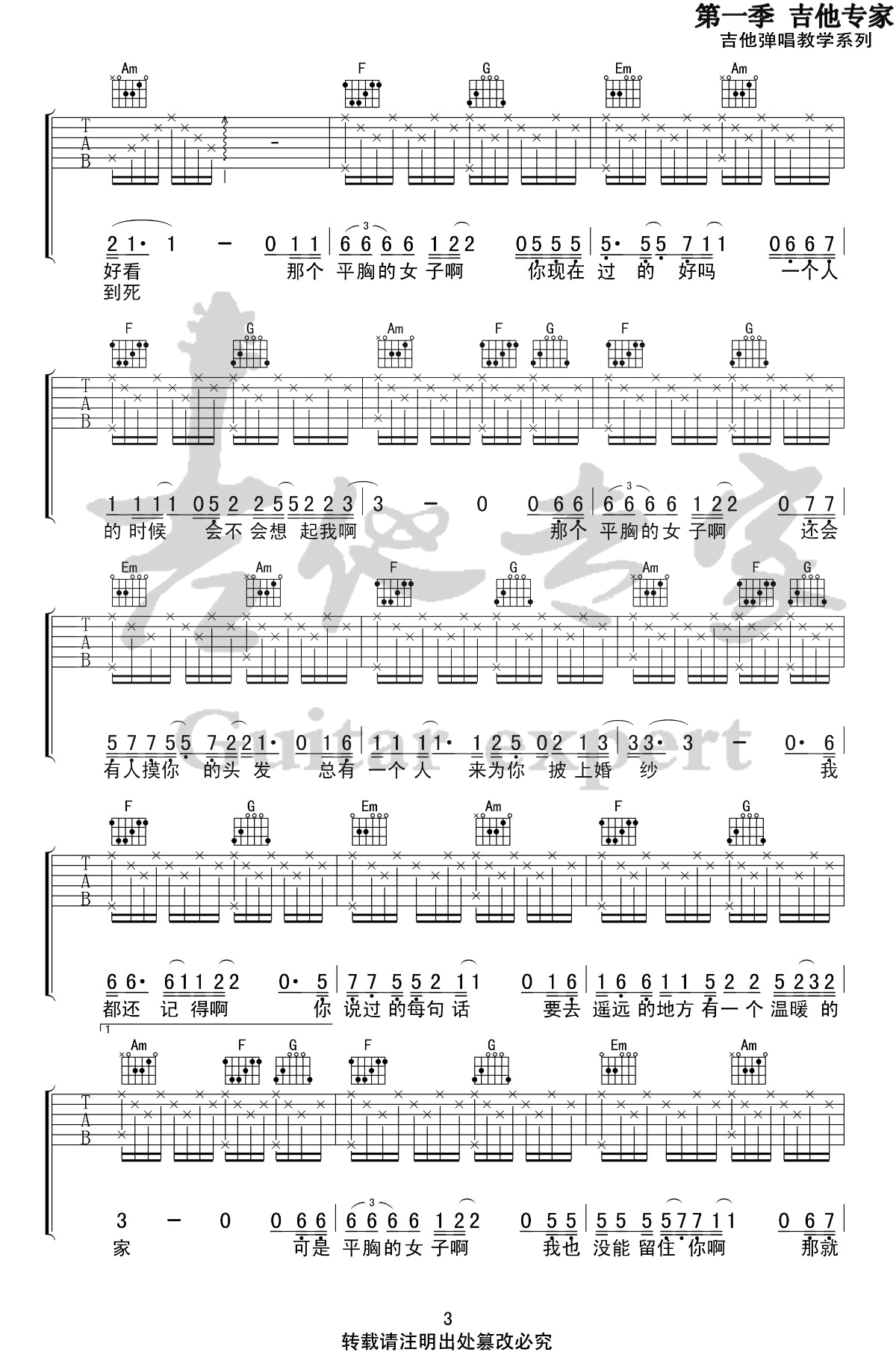 平胸女子吉他谱_枯木逢春_C调_弹唱六线谱 时间:2019-07-18 来源:吉他专家 点击:次 《平胸女子》吉他谱,枯木逢春词曲演唱的一首好听的民谣歌曲,平胸女子六线谱,原调#F,选用C调指法编配,吉他专家制谱分享,易唱网整理上传。枯木逢春很低调,一直以来微博上的个人图片也很少,这首平胸女子是小编最喜欢的歌曲之一。 枯木逢春的歌似乎永远带有一丝对世事的看破,借以自己的理解在歌曲中表现出来。这首《平胸女子》也一样是讲述了爱情上的惋惜,平淡又庸俗的故事,纪念着悄无声息走散的人!