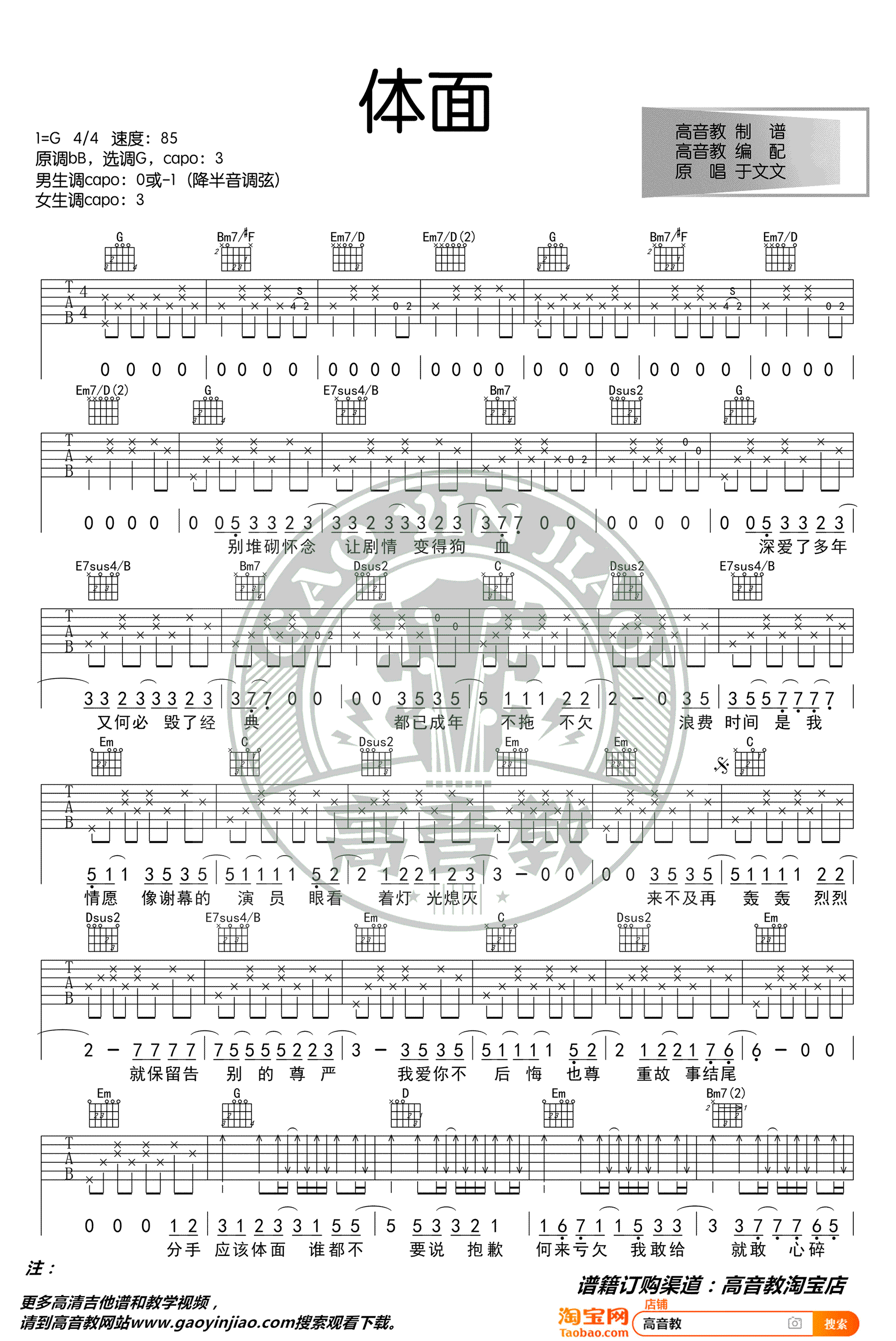爱游戏体育app-手机APP下载-易唱网echangwang.com 时间:2019-07-19 来源:高音教 点击:次 《体面》吉他谱,于文文献唱大热电影《前任三》主题曲,体面六线谱,原调降B,选调G,女生调capo夹三品,男生调不夹或降半音调弦。高音教编配制谱,易唱网整理分享。 一首刷屏爆红的伤感情歌,淋漓尽致诠释出爱情离散分手的无奈和纠结心痛,分手应该也有尊严,洒脱放手,别让执念毁了我们曾经付出过的昨天。再见,不负遇见。