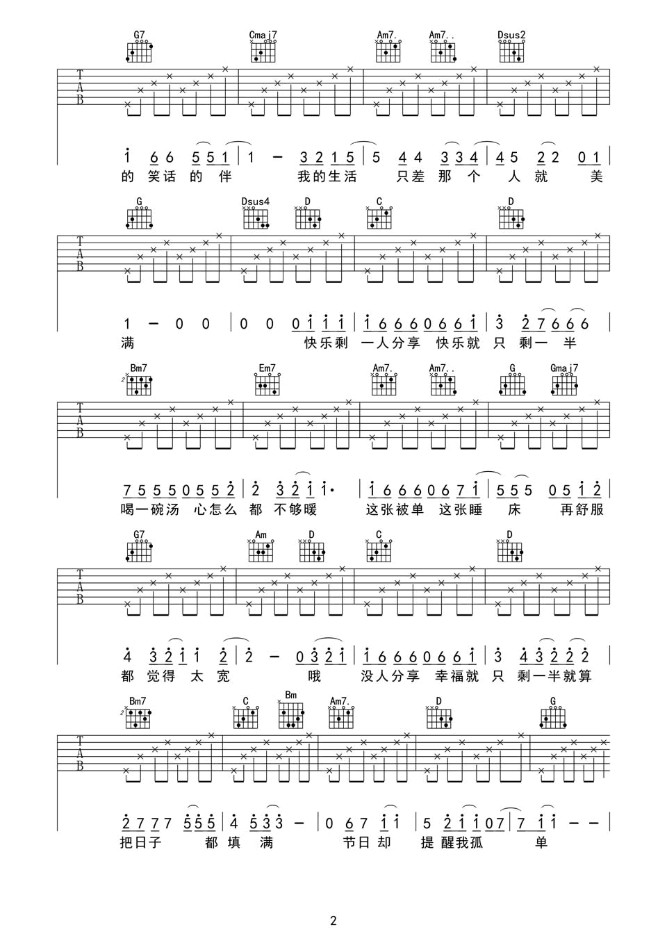 一半吉他谱_丁当_G调弹唱谱_高清六线谱 时间:2018-08-29 来源:心动吉他 点击:次 一半吉他谱,丁当演唱,六线谱编配,歌曲收录在丁当《未来的情人》专辑,丁当六线谱,曲谱选用G调弹奏,变调夹夹第一品。右手弹的根音曲琴友们自己找。感谢心动吉他编配,易唱网更新分享。 歌曲挖掘出女性感情里最敏感、最脆弱的一面,丁当清澈的声线将单身女子孤单寂寞的心境完美诠释。