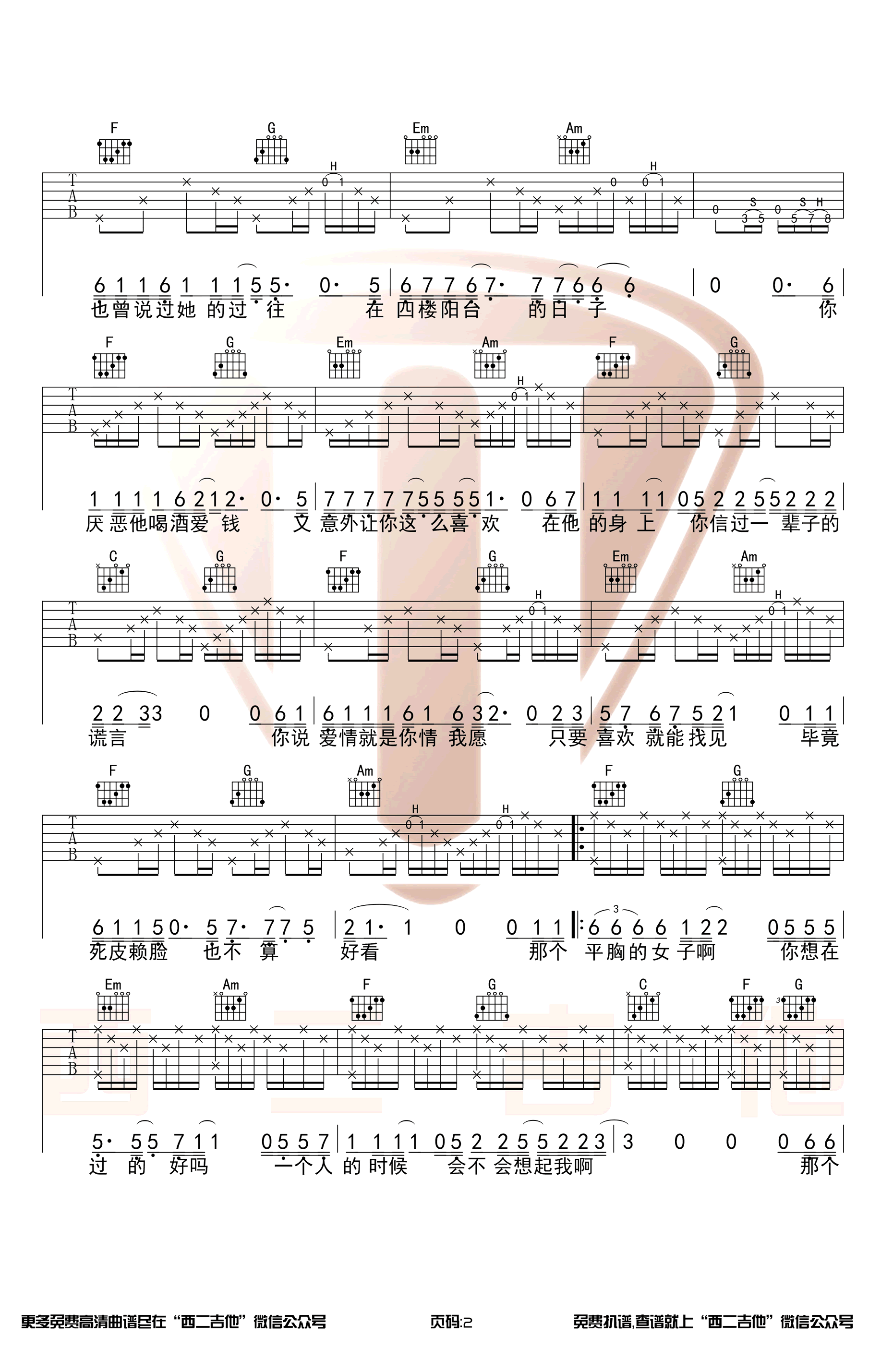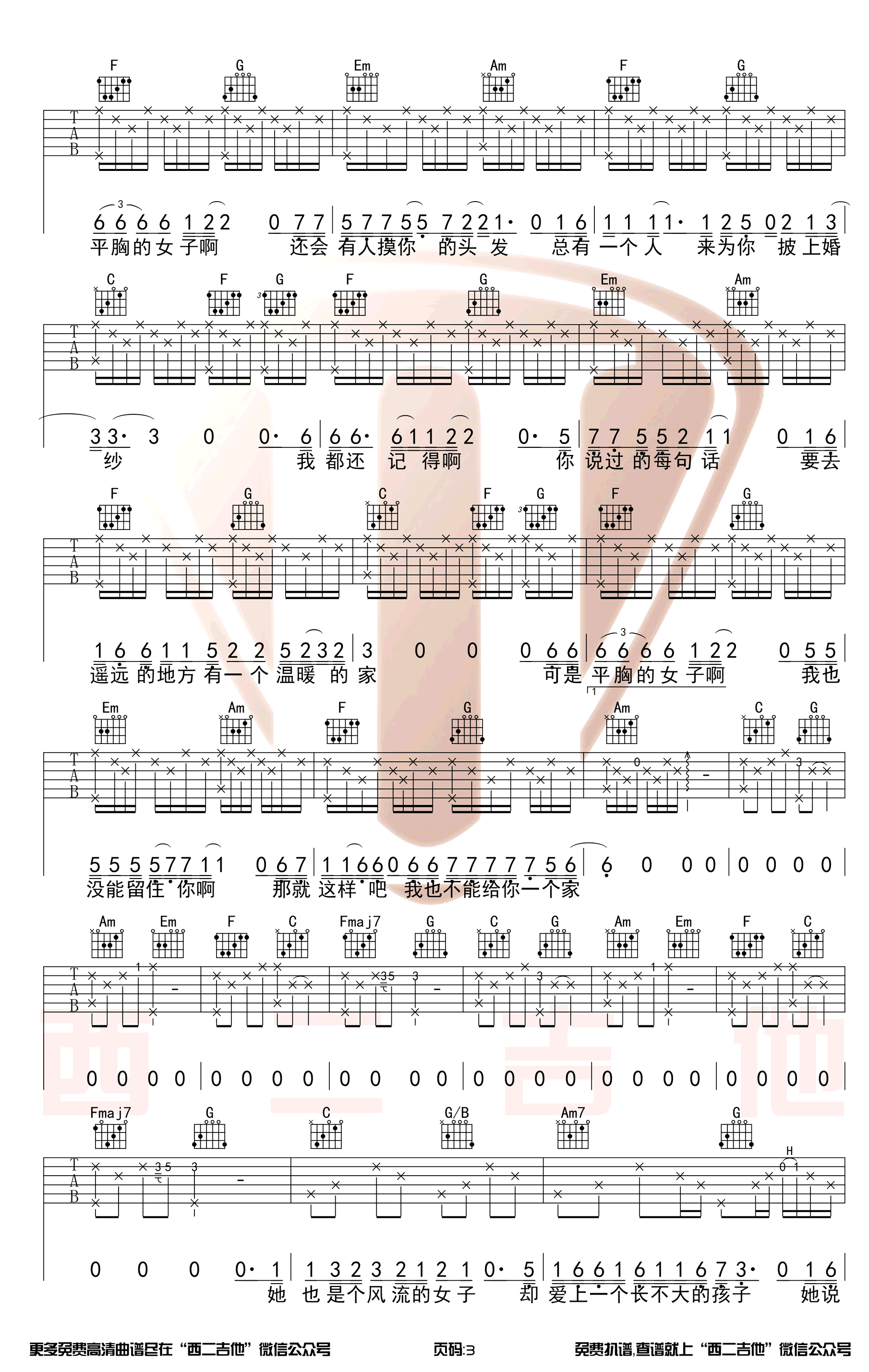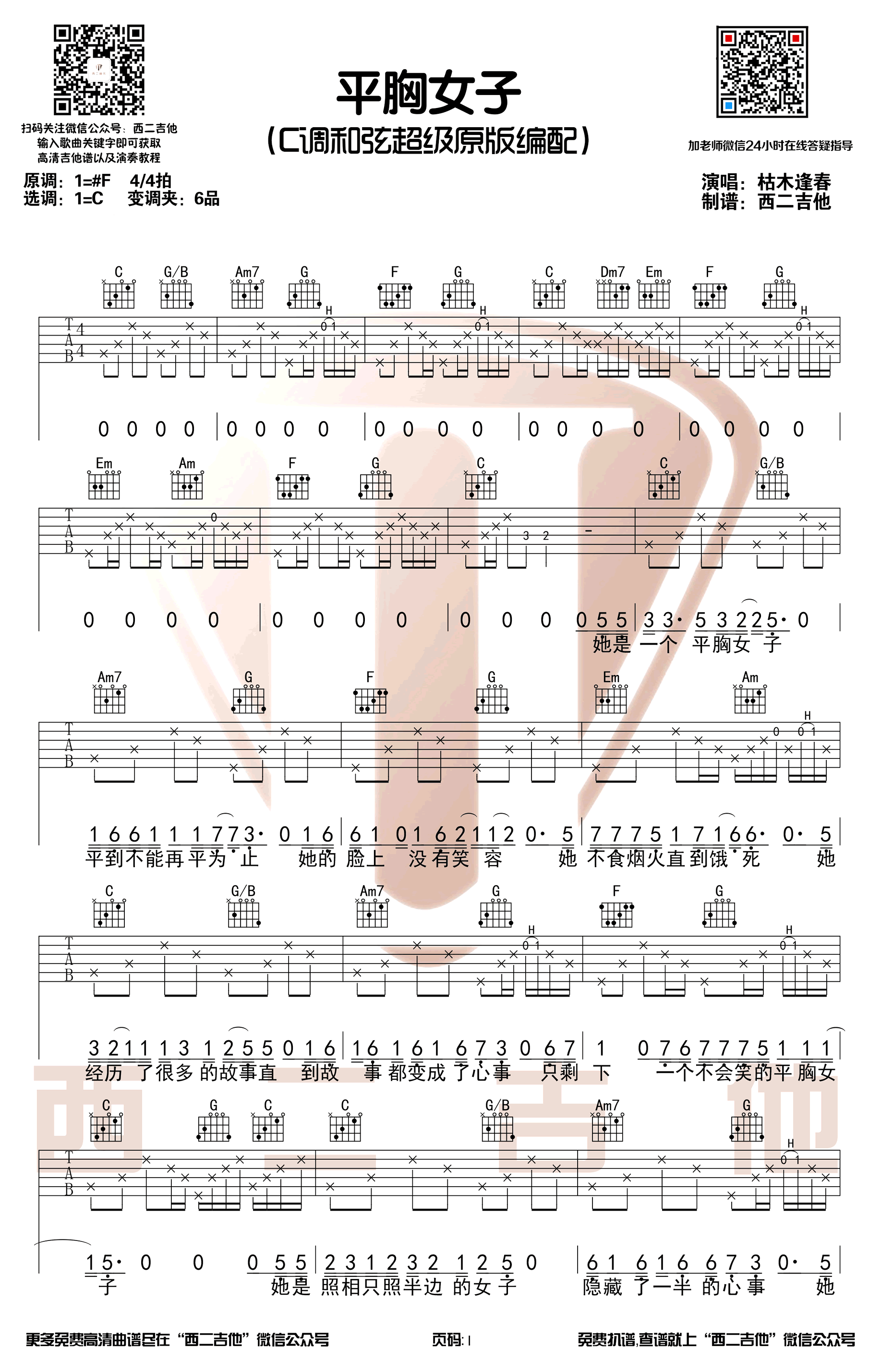 平胸女子吉他谱_枯木逢春_C调原版_弹唱演示视频 时间:2019-08-07 来源:西二吉他 点击:次 《平胸女子》吉他谱,枯木逢春词曲演唱,原调#F,选用C调指法超级原版编配,变调夹夹六品。平胸女子六线谱,完整弹唱谱共四张高清图片,西二吉他出品,易唱网整理分享。随谱附上火山老师带来的《平胸女子》吉他弹唱视频,琴友们参照示范演示练习。 一首很平淡却充满故事的民谣歌曲,唱出对于某个女孩的想念。让我们一起去听一听枯木逢春的爱情故事吧!