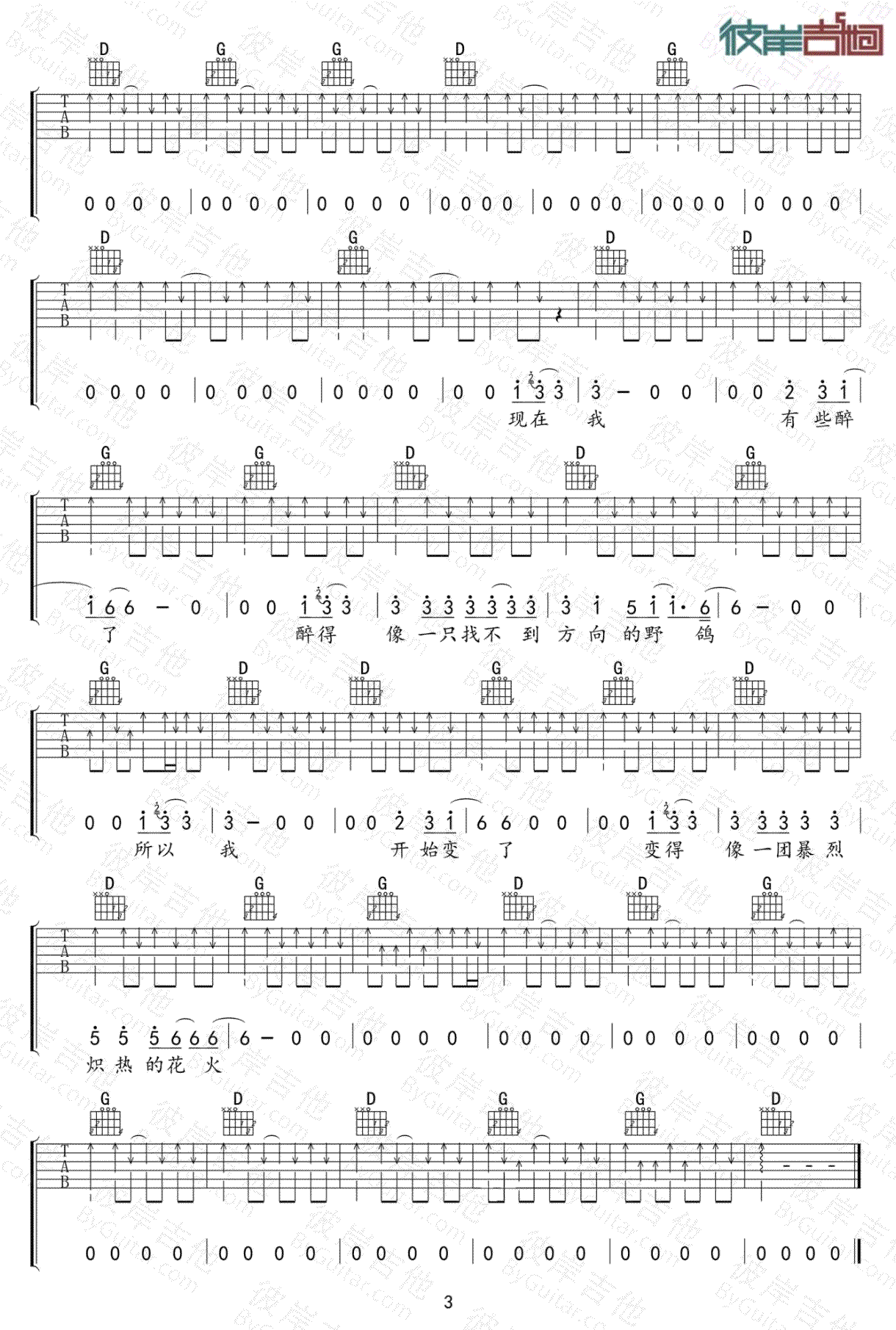 花火吉他谱_新裤子乐队《乐队的夏天》原版_弹唱六线谱 时间:2019-08-08 来源:小宁 点击:次 《花火》吉他谱,新裤子乐队在《乐队的夏天》节目中,激情绽放爆发式演绎汪峰的一首摇滚歌曲。花火六线谱,D调原版(高音略猛),三张图片谱,彼岸吉他小宁编配,易唱网上传更新。 这首《花火》改得确实蛮燃的,让人涌起一种热血上头的激动。 主唱彭磊又丧又酷,他的每一声嘶吼,都让我眼泪蹦出。一种爆发式的能量,摧毁了现实,让人心醉。青春不老!热血无限!让我们看到一种生命的力量!