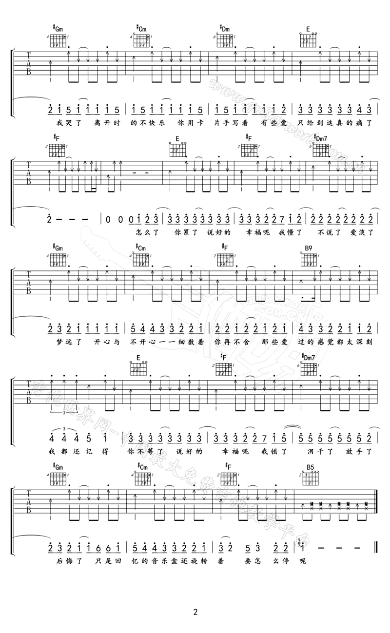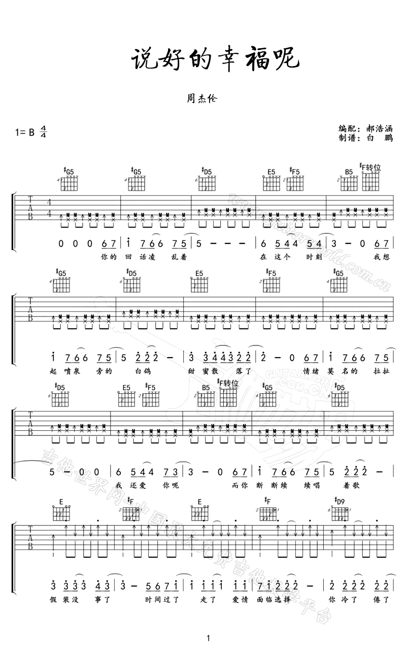 说好的幸福呢吉他谱_周杰伦_郝浩涵吉他弹教学视频 时间:2016-09-01 来源:郝浩涵 点击:次 周杰伦的《说好的幸福呢》吉他谱,方文山和周杰伦的经典合作,一首让人回忆落泪的伤感情歌。说好的幸福呢六线谱,B调编配,高清图片谱。郝浩涵吉他编配,易唱网琴友上传更新分享。本曲谱五和弦按法多,编配小调风格,右手节奏型参考本页最下方的吉他视频教学。