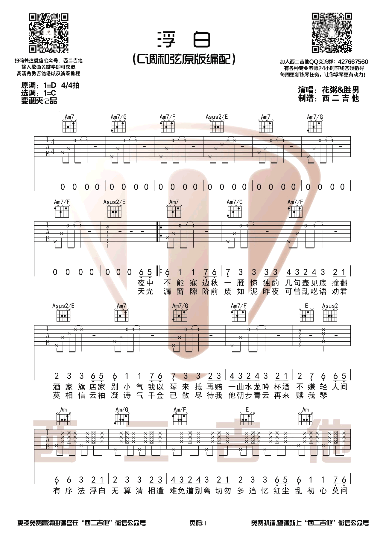 浮白吉他谱_花粥&胜娚_C调原版_吉他教学视频 时间:2019-08-16 来源:西二吉他 点击:次 《浮白》吉他谱,花粥&胜娚演唱,原调D,C调和弦原版编配,变调夹夹二品。西二吉他扒谱出品,随谱附上《浮白》吉他弹唱教学视频,易唱谱更新上传。 一首古风古韵的歌曲让人回味无穷,唱出人生磨难困苦中,终得看破世事,选择与自己和解,于坦荡天地间浮一大白的洒脱。