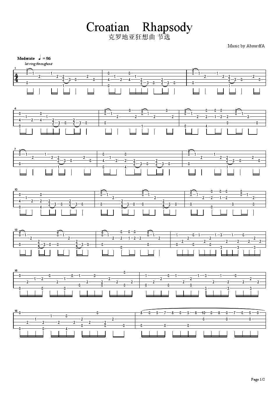 克罗地亚狂想曲指弹谱_Croatian Rhapsody_吉他独奏谱 时间:2019-09-28 来源:网络 点击:次 克罗地亚狂想曲指弹谱,本曲谱为节选编配,Croatian Rhapsody吉他独奏谱,由作曲家Tonci Huljic(赫吉克)谱写。《克罗地亚狂想曲》音乐用明快的节奏描述了饱受战火洗礼后克罗地亚灰烬中的残垣断壁,夕阳倒映在血泪和尘埃之中的悲惨的画面。此曲旋律激昂高亢,是21世纪新兴名曲,为马克西姆的代表之作。 这首曲子也充分展现曲作者神奇魔幻的诠演才华,让音乐充满的无限的惊喜。在曲子中可以感受到大漠飞沙,沧桑变化,吉他乐音声中,聆听一段古老故事的生命力。眼前好像在拼绘出一幅幅生动的画面。