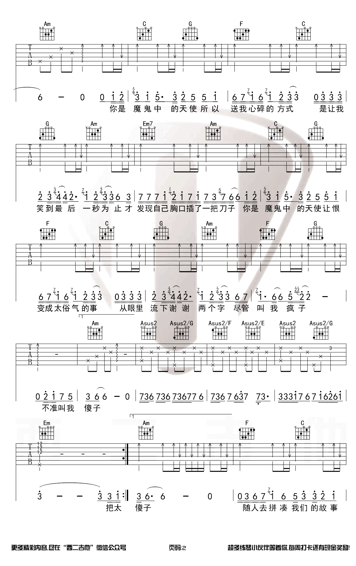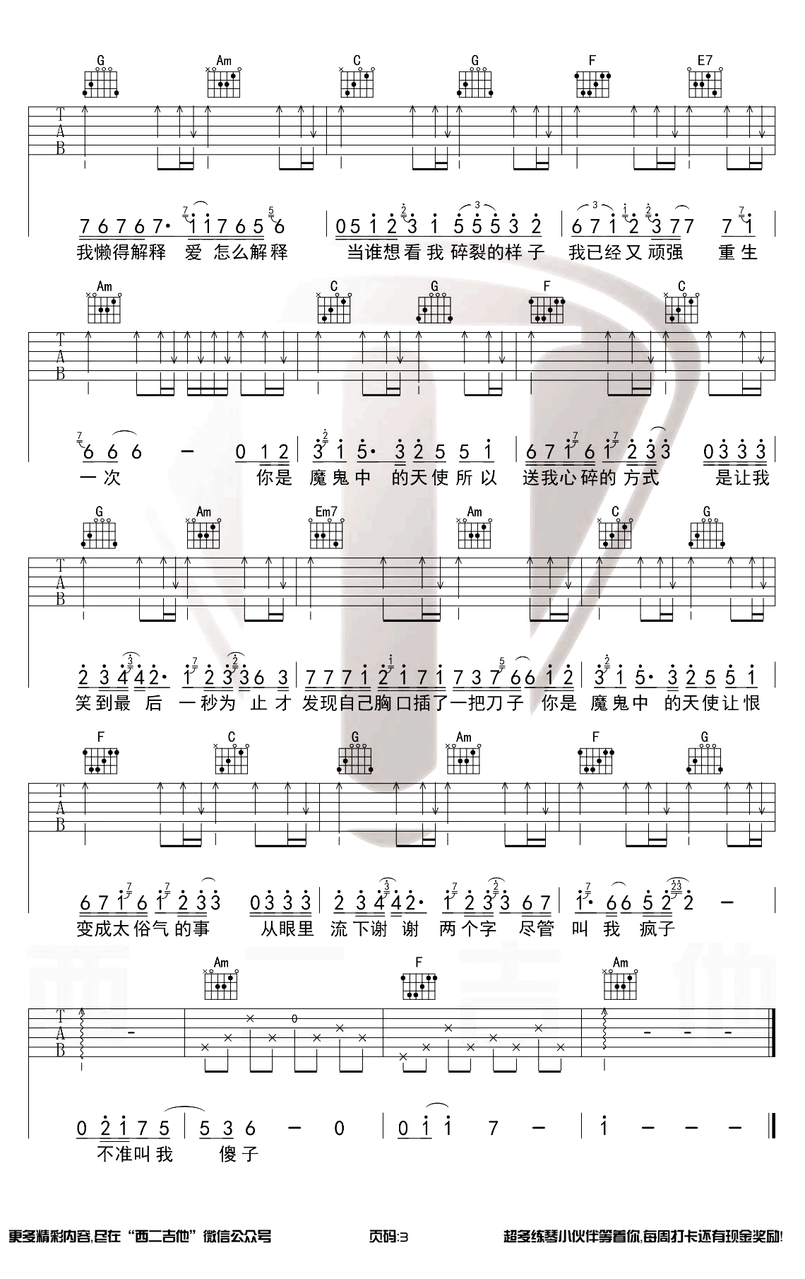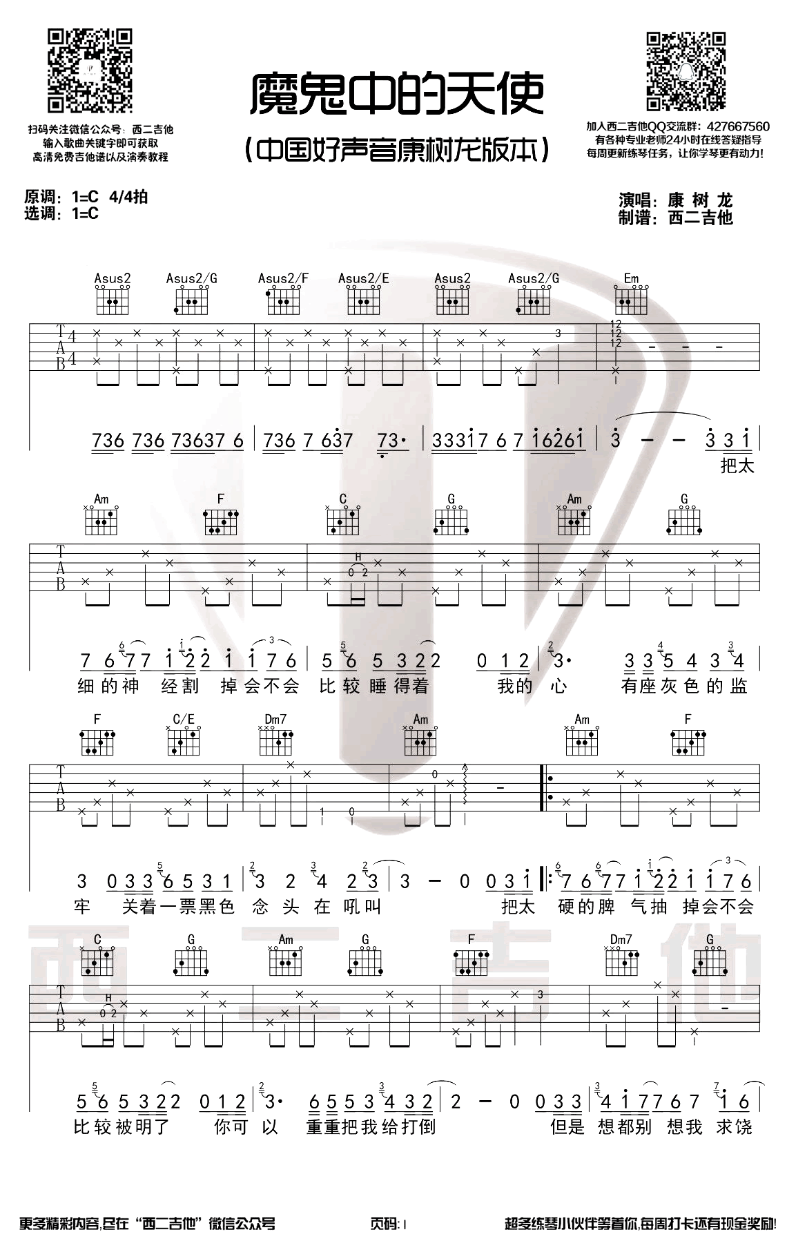 魔鬼中的天使吉他谱_康树龙版本_C调_弹唱教学视频 时间:2019-10-23 来源:西二吉他 点击:次 魔鬼中的天使吉他谱,康树龙版本,田馥甄原唱的一首情歌,魔鬼中的天使六线谱,原调C调,西二吉他编配出品,易唱网整理上传。 这首歌是由Hebe于2011年发布,经过简弘亦的翻唱之后开始被越来越多的听众所熟知,歌词讲述的是在恋爱中的两人明明互相深爱,却又互相伤害,有时身边人仿佛最美的天使,有时却因为没有控制好情绪而变为可怕的魔鬼,爱情讲究的还是相濡以沫,假如互不认输最后伤害的还是自己。我们一起来看看火山老师为大家带来的免费教学吧!