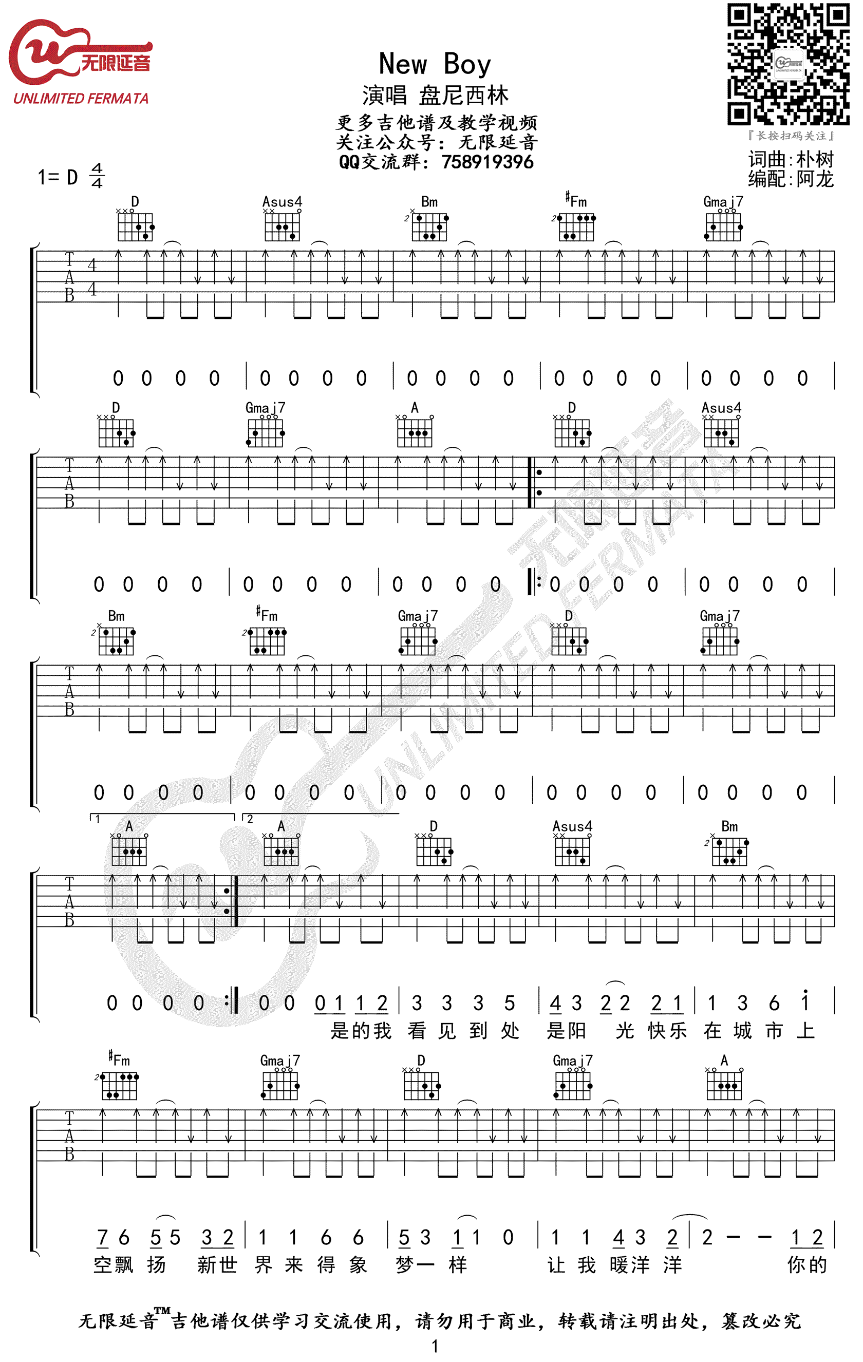 New Boy吉他谱_盘尼西林_D调弹唱谱_乐队的夏天 时间:2019-10-26 来源:无限延音 点击:次 《New Boy》吉他谱,盘尼西林演唱,D调指法,New Boy六线谱,完整版共四张弹唱图片谱。无限延音编配,易唱网吉他谱上传分享。 没有复杂的技术,没有绚丽的program,盘尼用手风琴和简单的和弦托着张哲轩(小乐)的嗓音,让歌曲轻快洋溢起来,那个词和那个曲调、律动就应该是他那样的人来唱,就像二十年前的朴树那样,如果你还年轻,来听听这首《New Boy》,因为年轻真好;如果你已经老了,也来听听这首《New Boy》,因为看着他们年轻,真好。