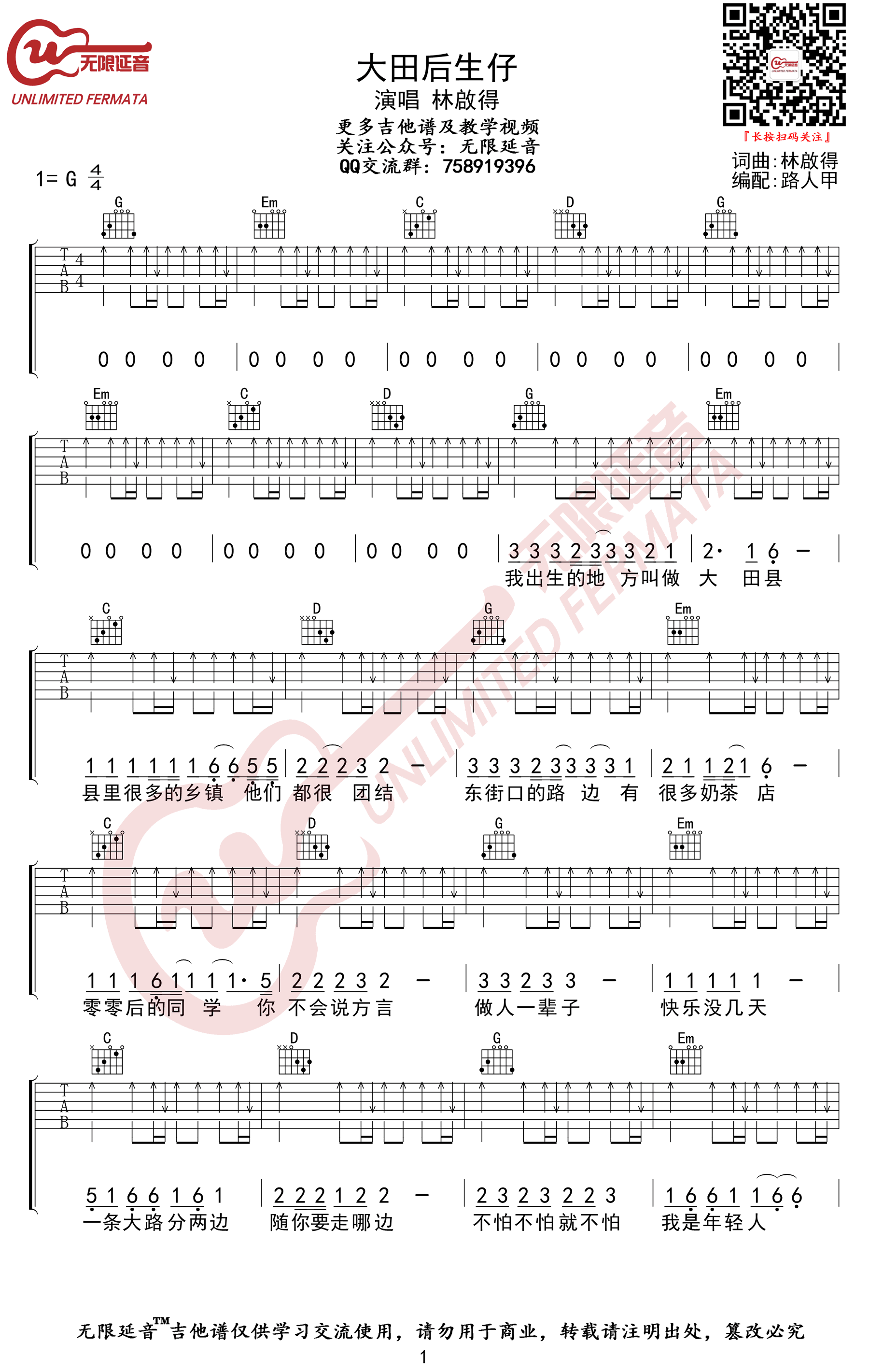 万博manbetx官方首页-手机APP下载-易唱网echangwang.com 时间:2019-11-02 来源:无限延音 点击:次 大田后生仔吉他谱,林启得词曲创作的一首闽南语歌曲,也成为当前网络最火的翻唱神曲。大田后生仔六线谱,G调指法,三张弹唱图片谱,无限延音编配出品,易唱网更新上传。 平实而饶有意趣的歌词,轻快悦耳的曲风,云起雪飞般动听的闽南语,无一不让人听的过瘾。这首歌是作者写给自己家乡大田县的歌,质朴的歌声里,温侬的话语中,诉说的是太阳下打拼的父辈和那些年轻闯荡的心。