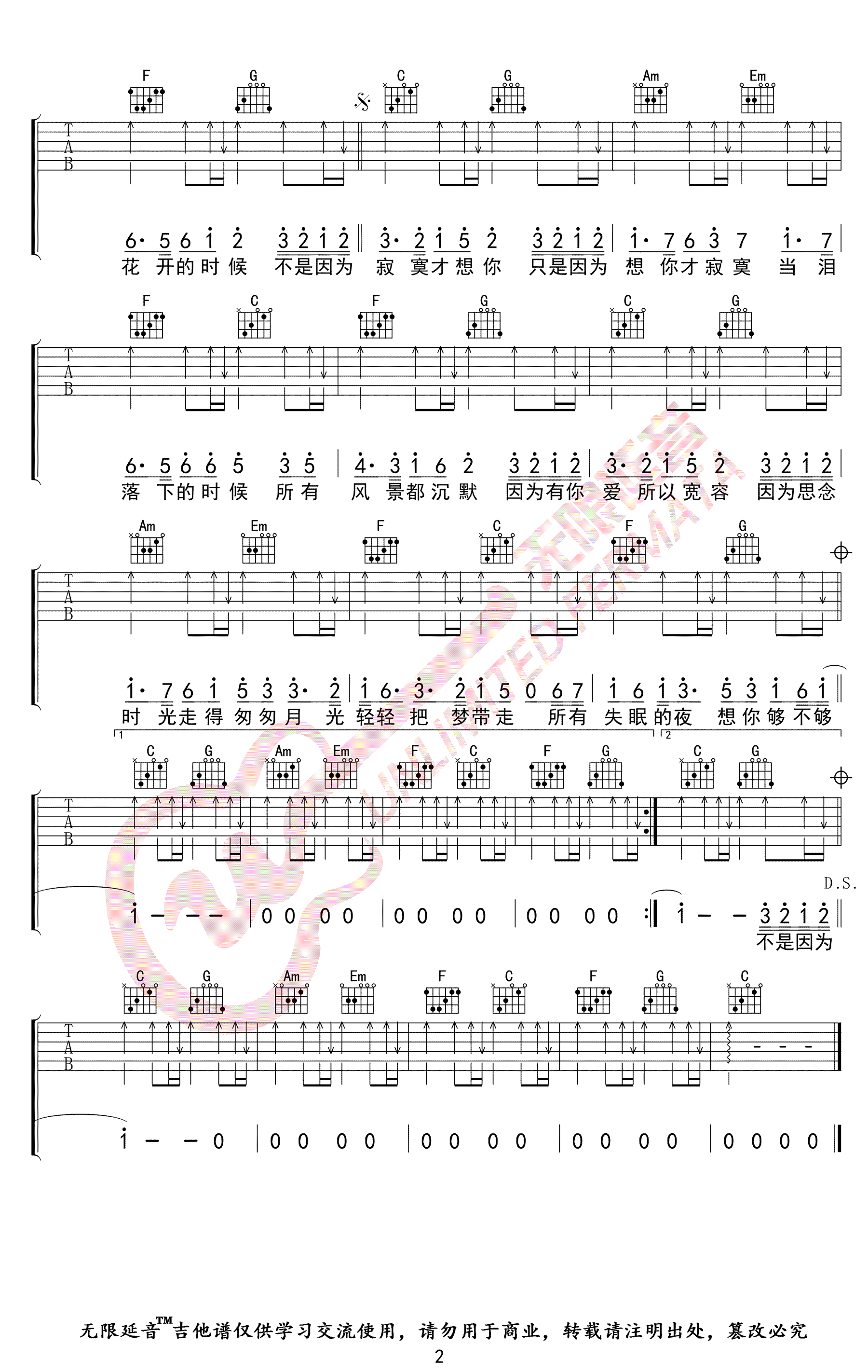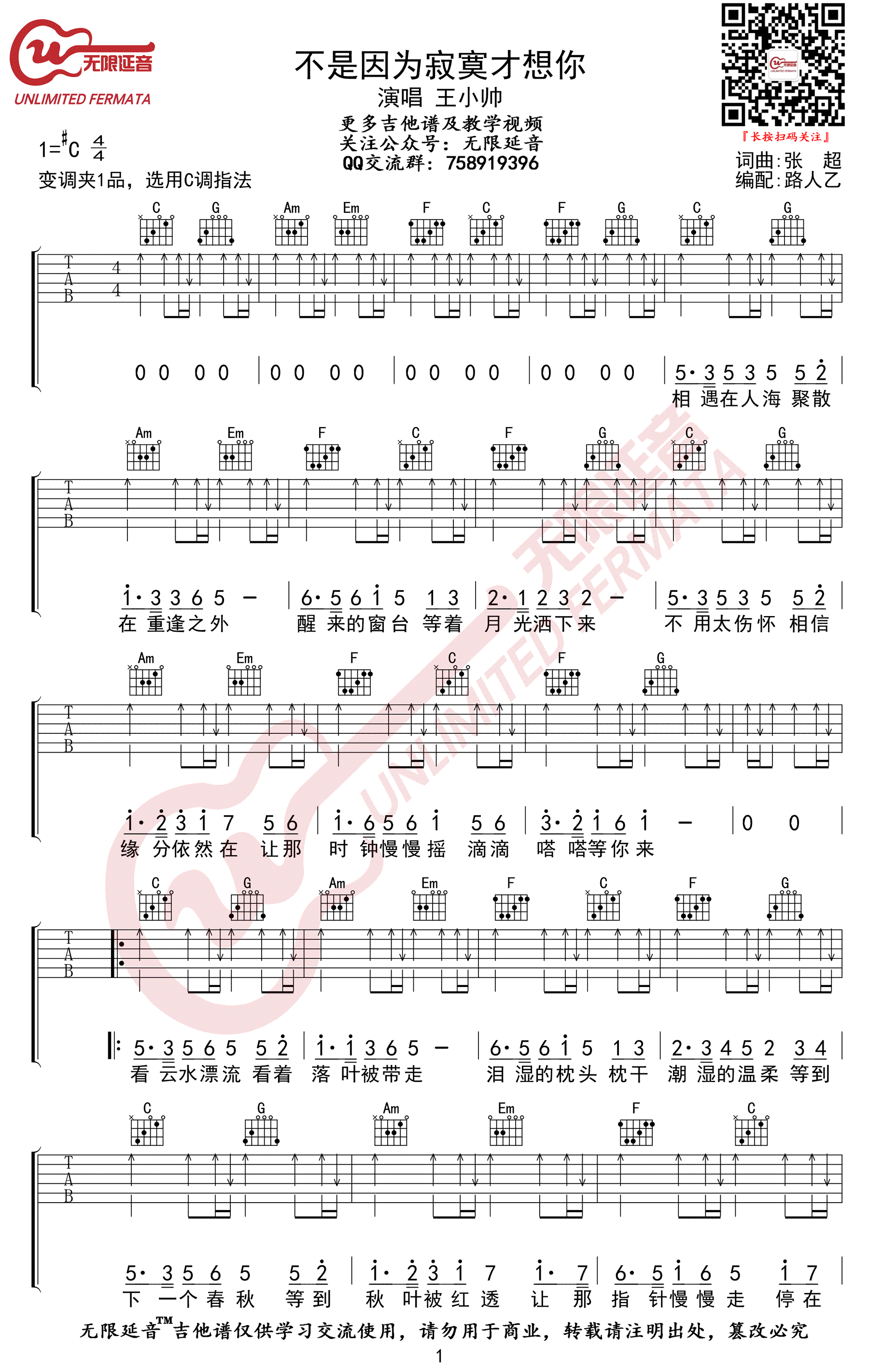不是因为寂寞才想你吉他谱_C调_王小帅_高清图片谱 时间:2019-11-09 来源:无限延音 点击:次 不是因为寂寞才想你吉他谱,王小帅翻唱版本,来自Y.R.Y的经典老歌,不是因为寂寞才想你六线谱,选用C调指法,变调夹夹一品。两张弹唱图片谱。无限延音编配出品,易唱网整理分享。 每个人,都有一个无法忘怀的人,或近或远,或醉或醒。想你,在每一个失眠的夜里,在每一首悲伤的歌里,在每一次回眸的落寞里,在每一回擦肩而过的梦里。