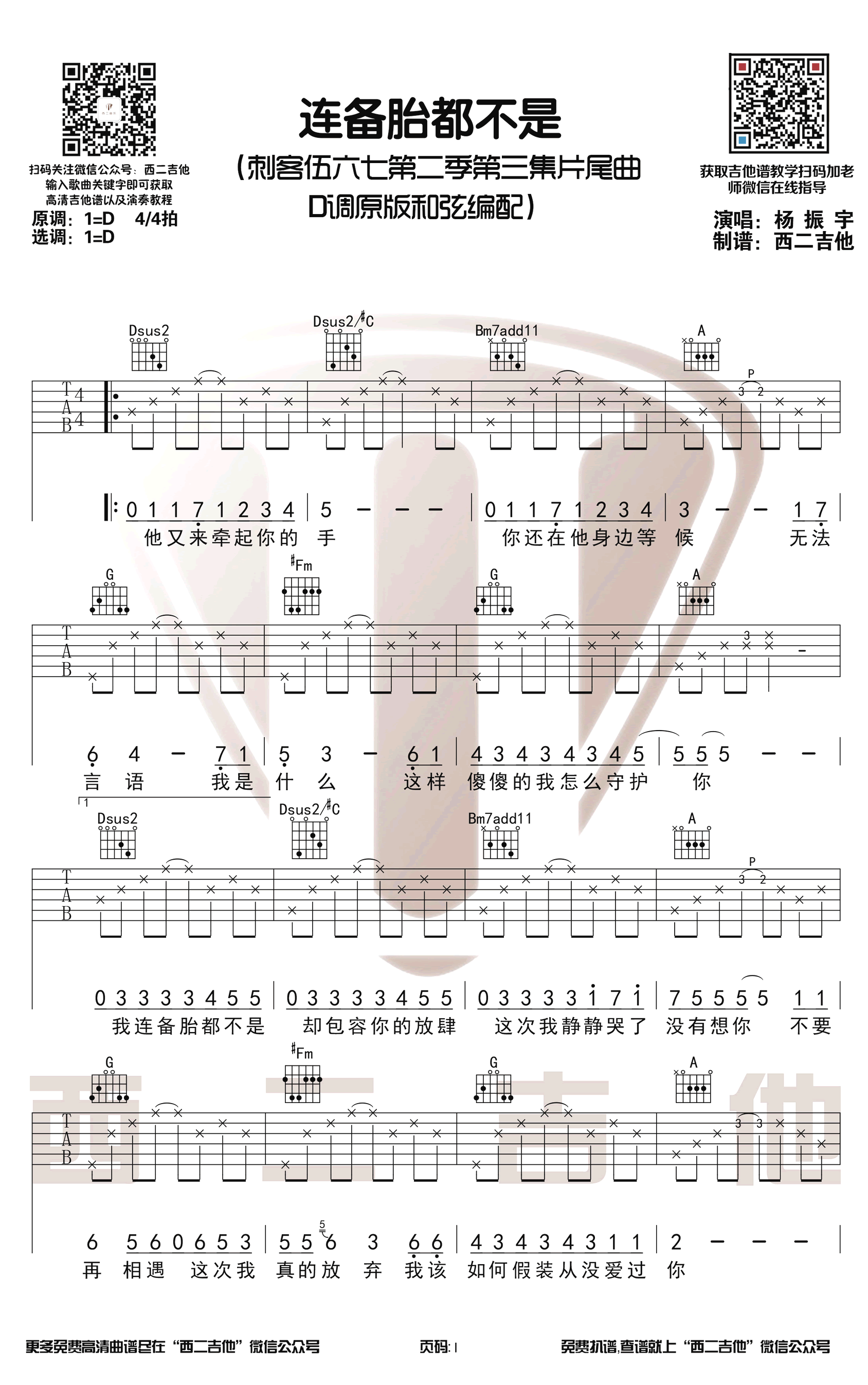 连备胎都不是吉他谱_D调原版_杨政宇_刺客伍六七2插曲 时间:2019-11-09 来源:西二吉他 点击:次 连备胎都不是吉他谱,杨政宇演唱,国产动画《刺客伍六七》第二季第三集插曲,连备胎都不是六线谱,D调原版和弦编配,西二吉他出品,易唱网更新分享。 集热血与搞笑为一体的热播国漫,一首引起粉丝的共鸣的神曲,曲调满是沧桑感,就像喵财暗恋喵小咪多年,因自卑不敢说出口,等学了绝世神功后终于鼓起勇气来表白时 ,却发现爱人又与情敌和好了,发现自己连备胎都不是,这是一个比“悲伤更悲伤的故事”。