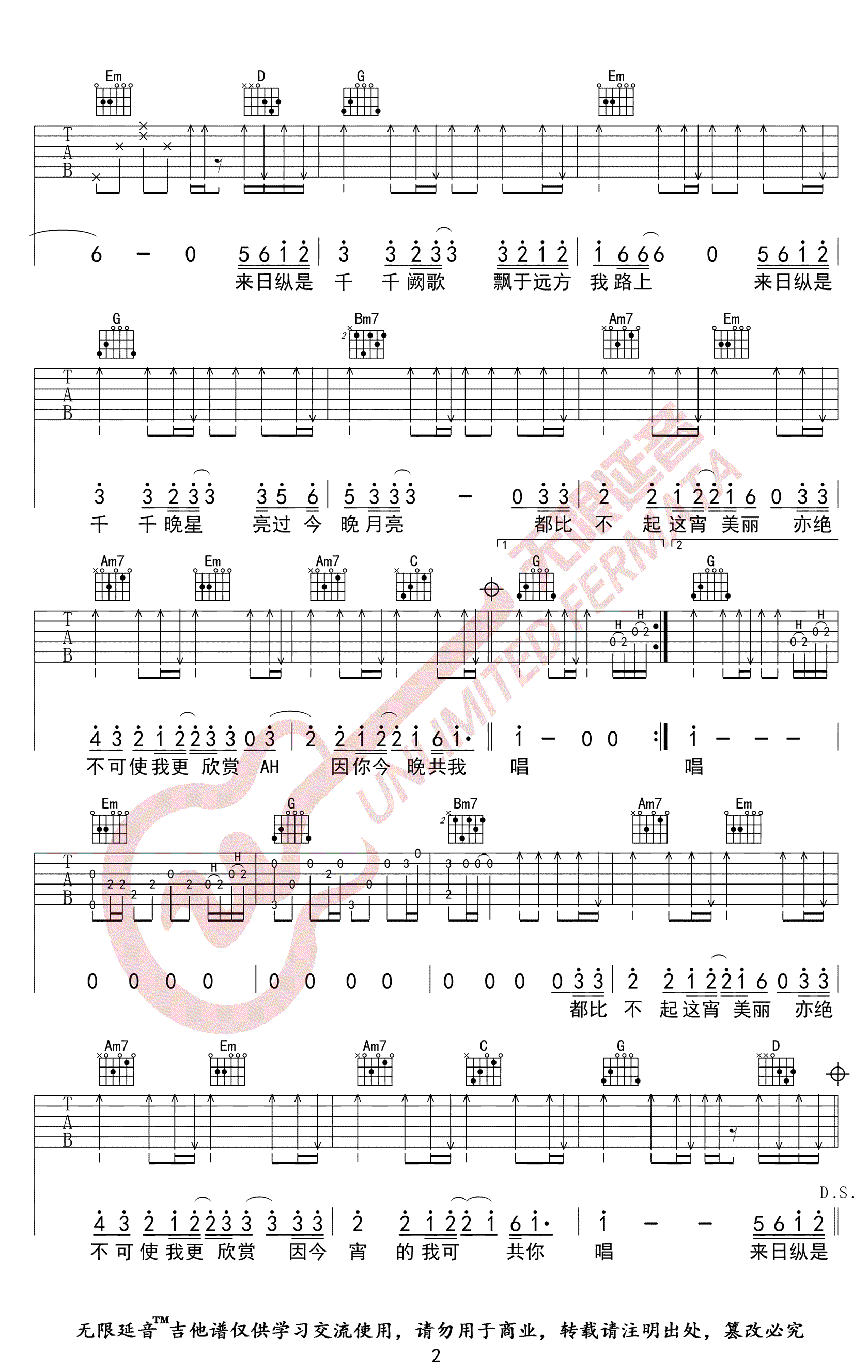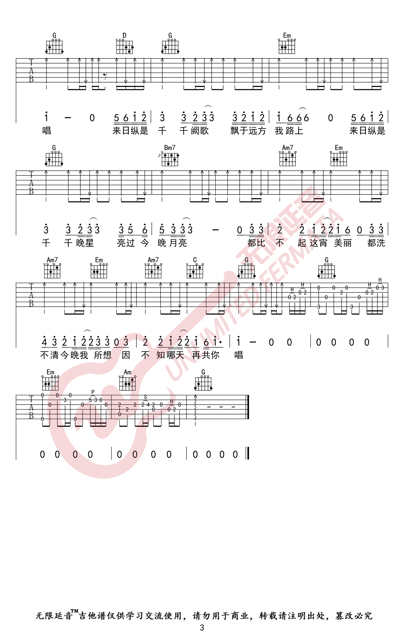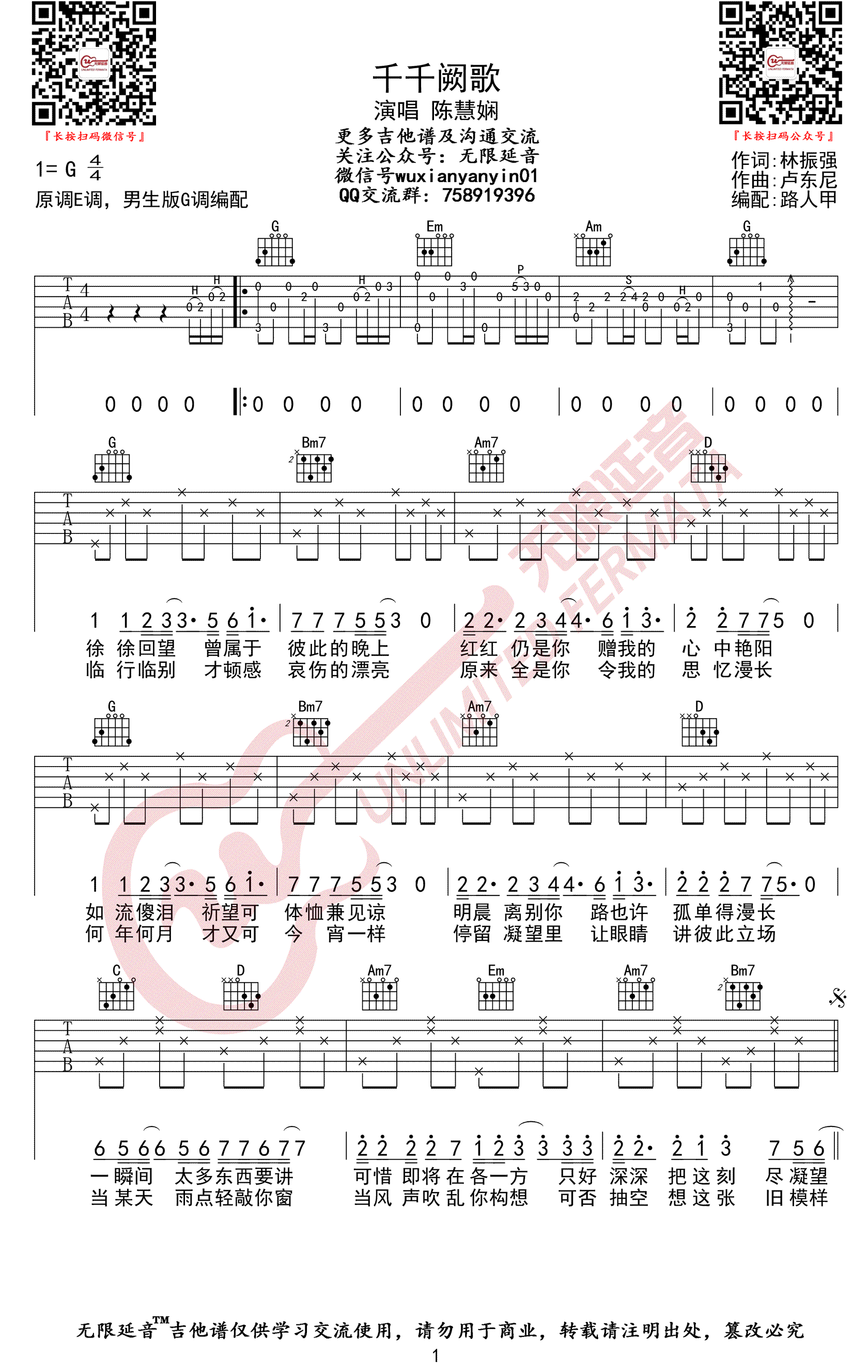 千千阙歌吉他谱_陈慧娴_G调男生版_弹唱六线谱 时间:2019-11-25 来源:无限延音 点击:次 《千千阙歌》吉他谱,陈慧娴演唱的一首经典粤语歌曲,千千阙歌六线谱,原调E,男生版G调指法编配。无限延音编配出品,易唱网吉他谱上传分享。 这是一首离别的歌,平淡中透着忧伤,温存了几代人的青春记忆,听到这首歌,总让人忆起那个徐徐回望,曾属于彼此的晚上。