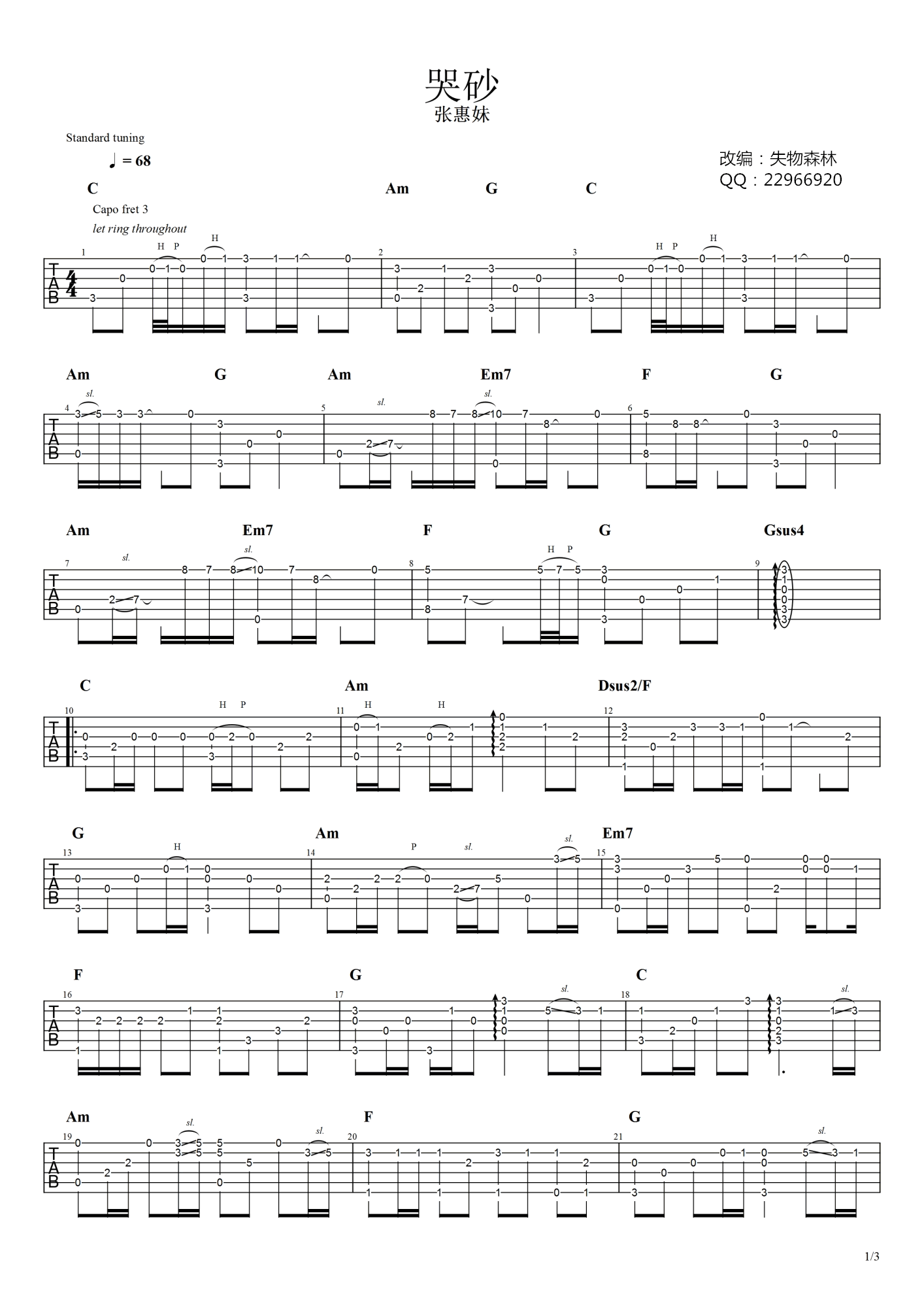 万博官方manbetx手机版-手机APP下载-易唱网echangwang.com 时间:2019-11-30 来源:失物森林 点击:次 哭砂指弹吉他谱,根据张惠妹的一首经典歌曲改编。哭砂吉他独奏谱,CAPO夹三品,三张高清图片谱,感谢失物森林老师编配分享,并带来《哭砂》指弹吉他演奏视频,喜欢这首歌曲的琴友们可以参照演示练习。 抓不住的爱情,有如指间沙,《哭砂》推出之后被那么多歌手衷爱翻唱,或许就是因为它道出了无数人心中的无奈和苦楚。时光有声,旋律永恒,让我们静静聆听这伤感舒缓的琴声。