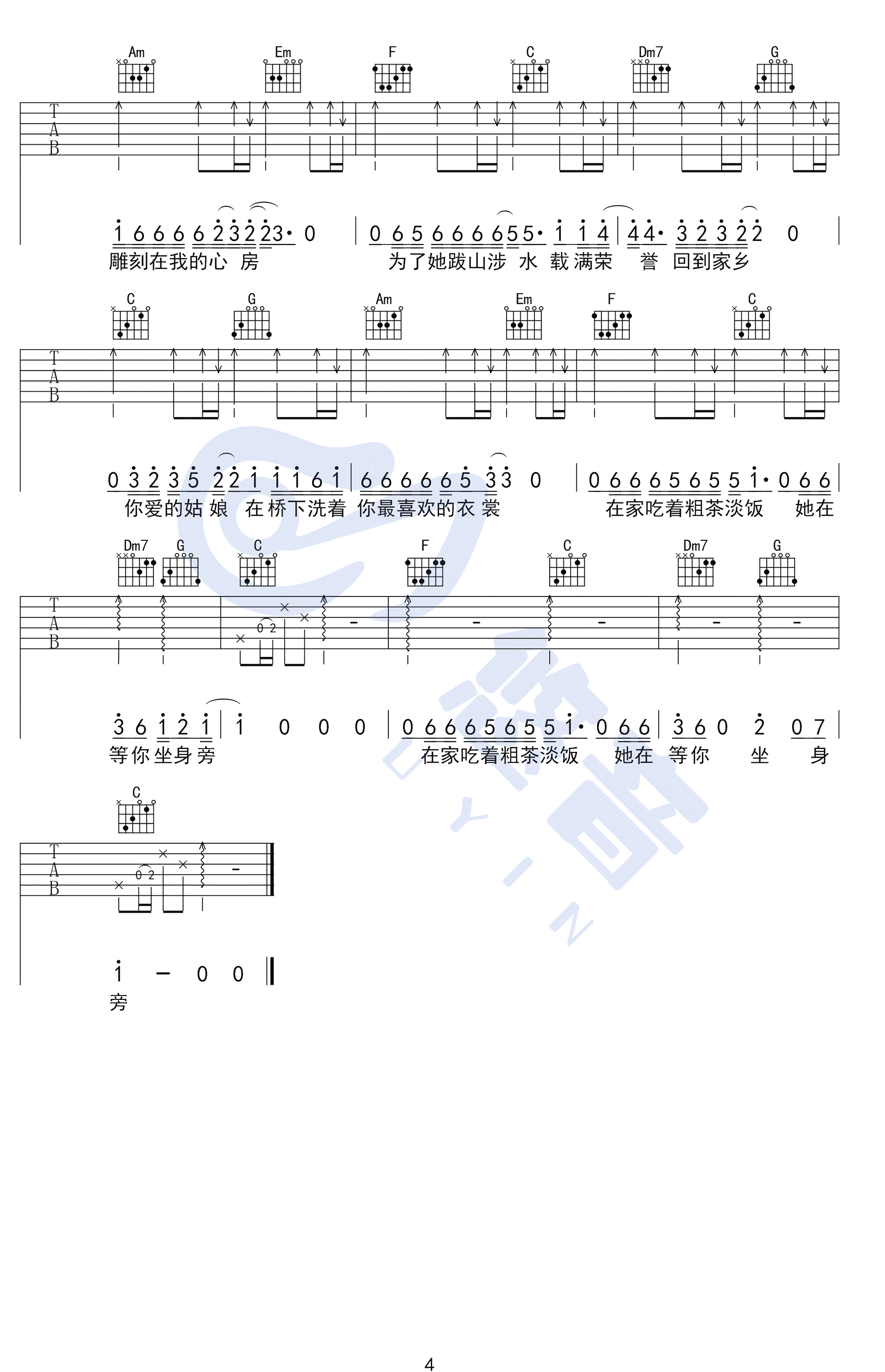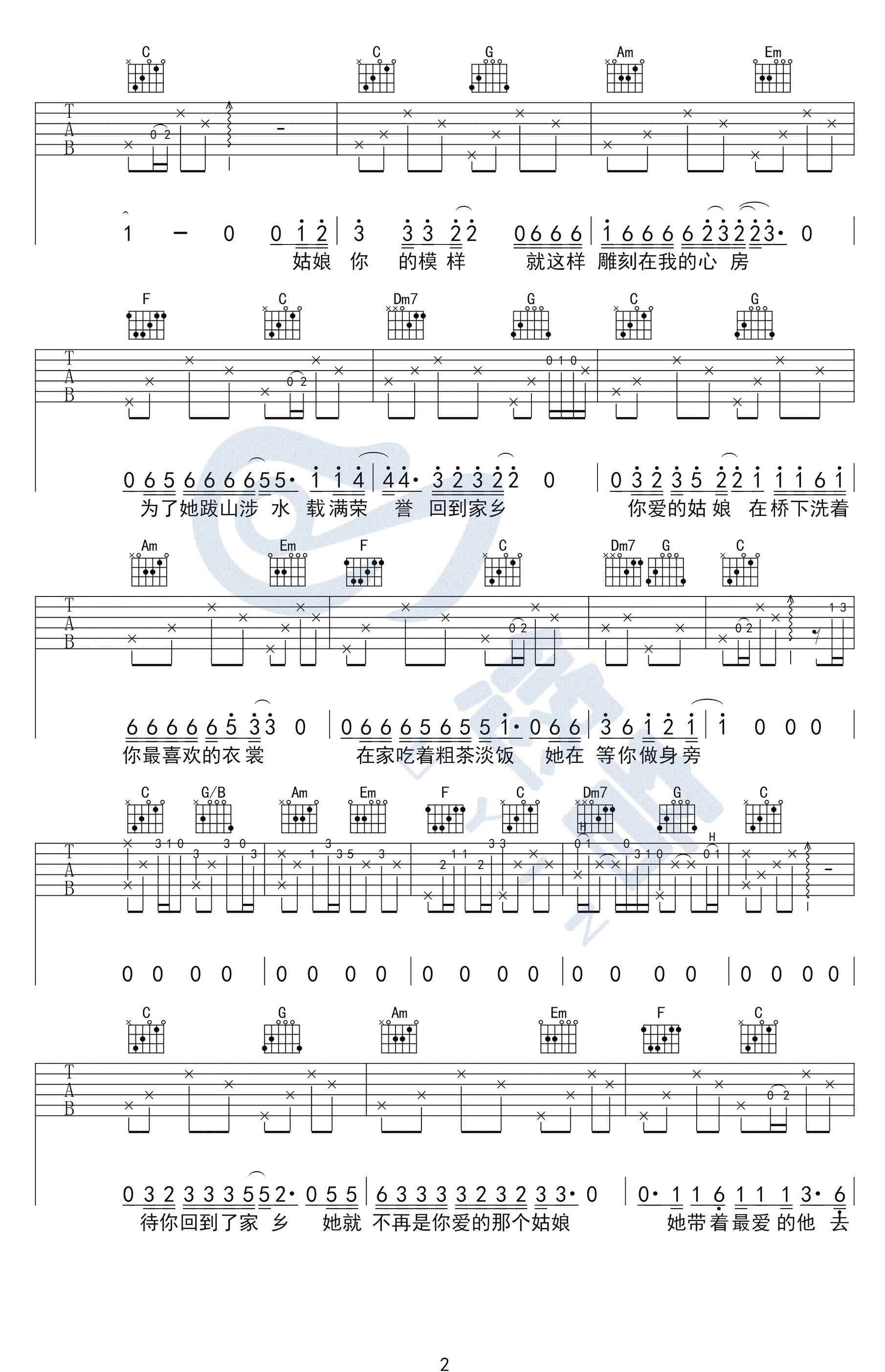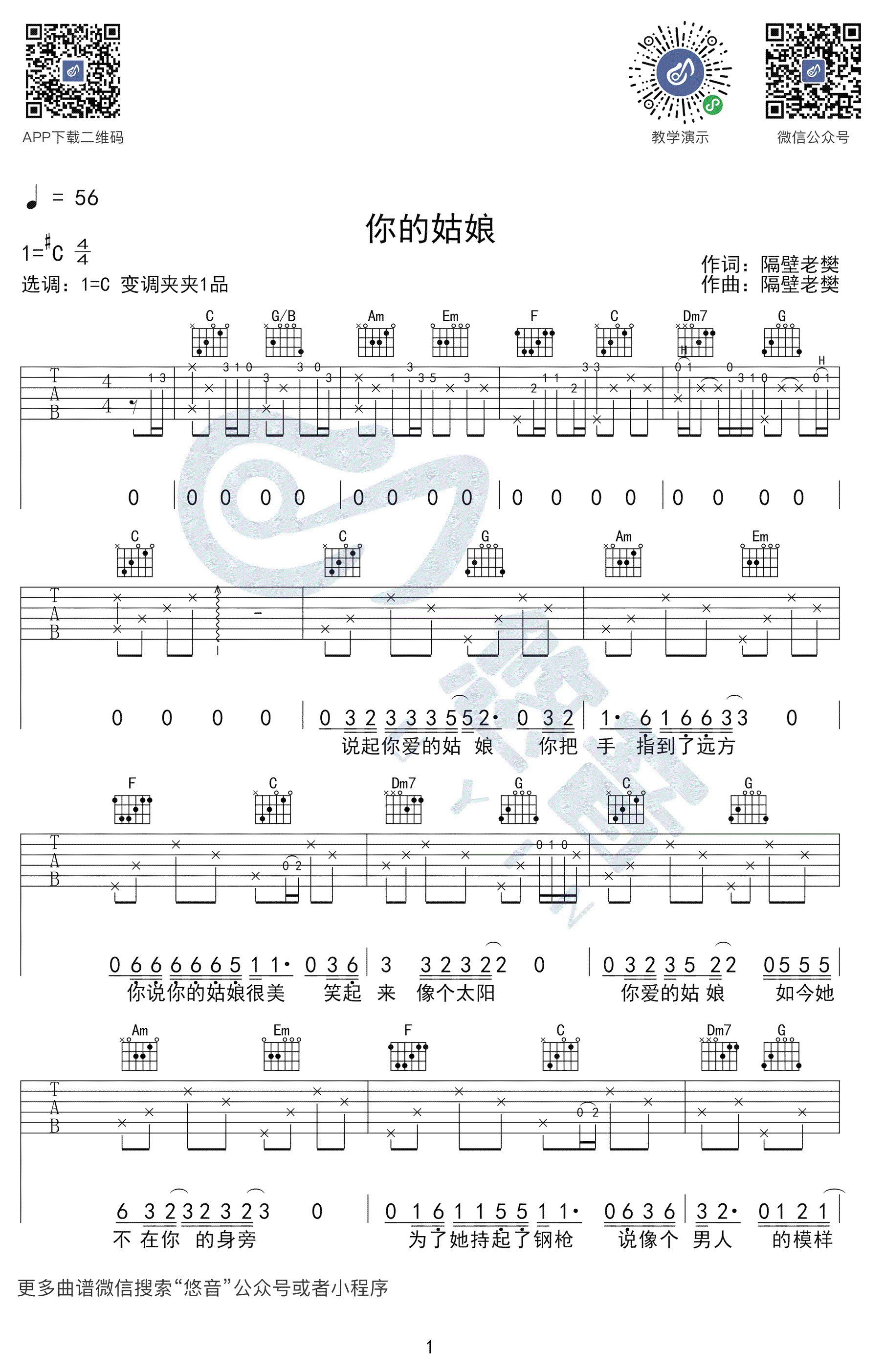 你的姑娘吉他谱_隔壁老樊_C调六线谱_弹唱演示视频 时间:2019-12-02 来源:悠音吉他 点击:次 《你的姑娘》吉他谱,隔壁老樊演唱的一首充满暗恋情愫的歌曲,C调指法,变调夹夹一品。你的姑娘吉他弹唱六线谱,完整版共四张图片谱。感谢悠音吉他编配出品,易唱网整理分享。 歌曲唱出每个男人心中的那个姑娘,千帆过尽茫茫人海,没人可以替代她的位置。一层层的推进表达出浓稠深沉的爱意,细腻委婉的情感。