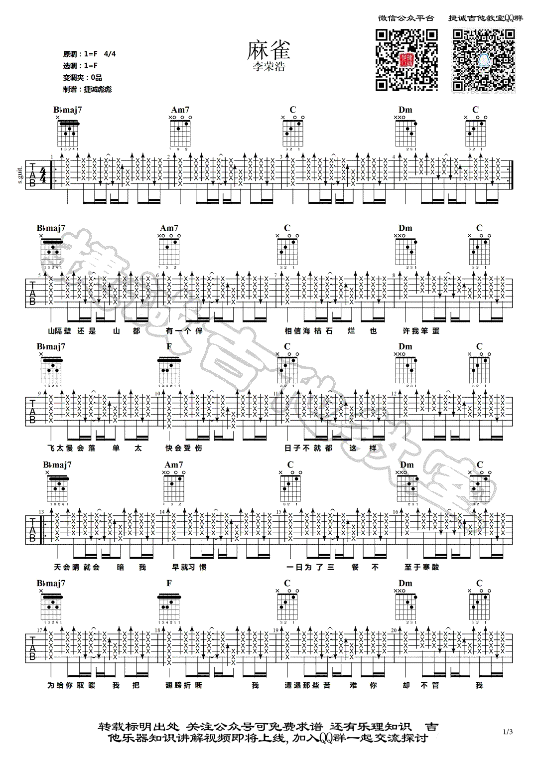 麻雀吉他谱_李荣浩_扫弦版_吉他教学视频 时间:2019-12-09 来源:捷诚吉他教室 点击:次 《麻雀》吉他谱,李荣浩演唱的新歌,F调和弦扫弦版编配,麻雀吉他弹唱谱,三张图片六线谱。捷诚吉他教室出品,易唱网整理上传。随谱附上吉他教学视频。 李荣浩的这首励志歌曲,没有华丽的词藻,也没有激进的高音,一切从心里而来,唱出每一个平凡人生的渺小和顽强,在经历波折起落后,依然会努力顽强的迎接每一个明天。