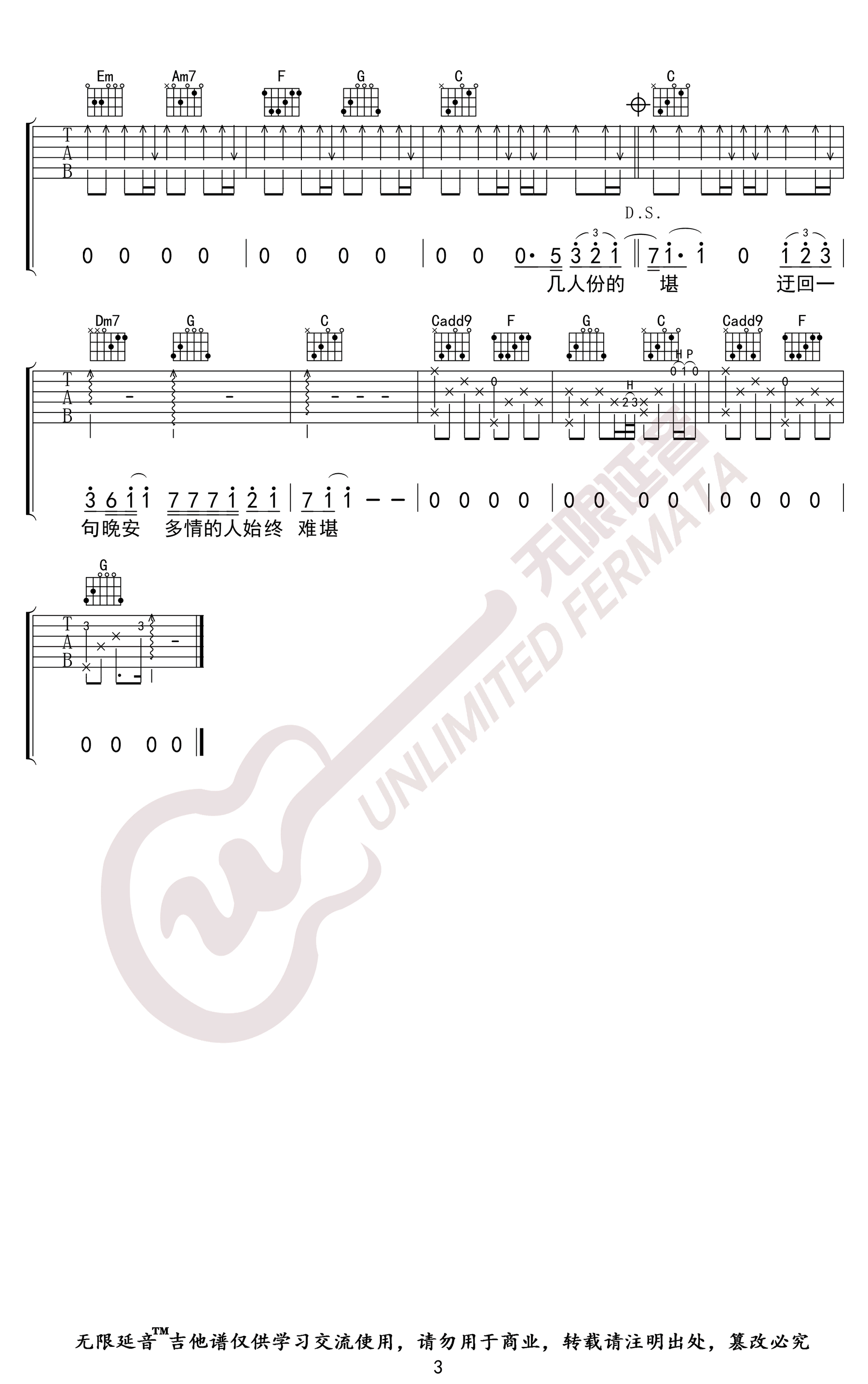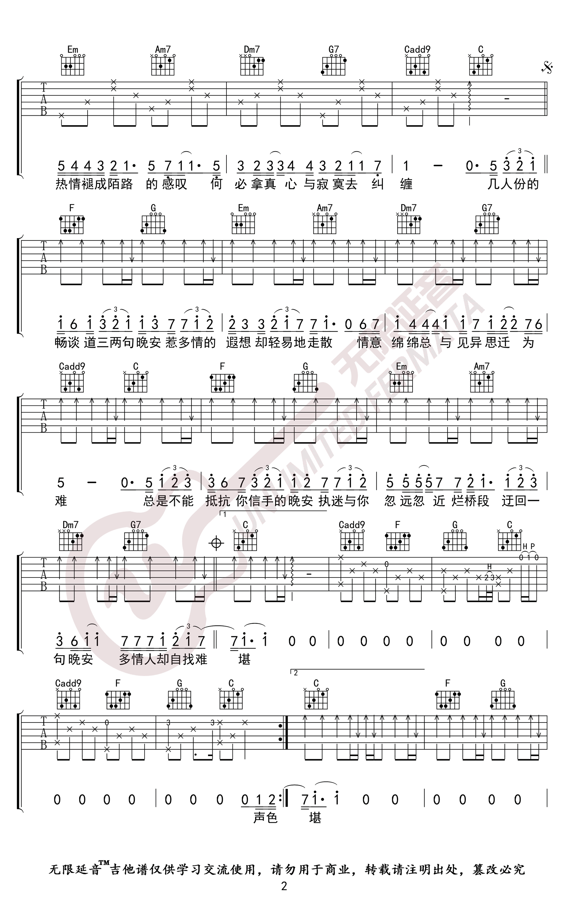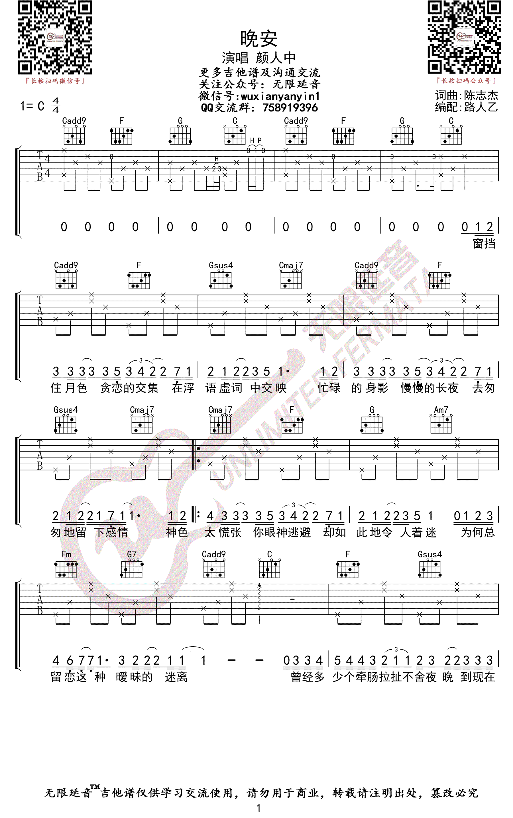 颜人中 晚安吉他谱_C调指法_高清图片谱 时间:2019-12-10 来源:无限延音 点击:次 晚安吉他谱,颜人中演唱的一首代表歌曲,晚安六线谱,C调指法编配,三张高清图片谱。无限延音编配出品,易唱网整理分享。 曲中信手拈来的晚安,意义却比它本身更加沉重。因为流传的晚安的拼音首写字母是我爱你的意思。磁性而充满故事的嗓音,轻轻安慰着每一个深夜中暧昧、暗恋、以及那些爱而不得的人们。我热爱这偶有的悲伤,也爱这莫名的沉静。