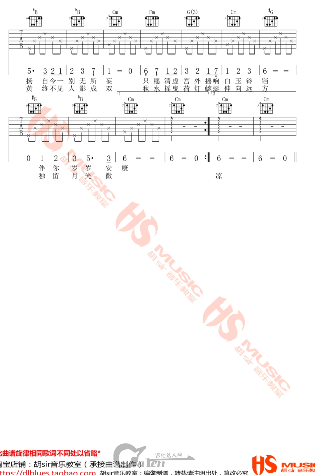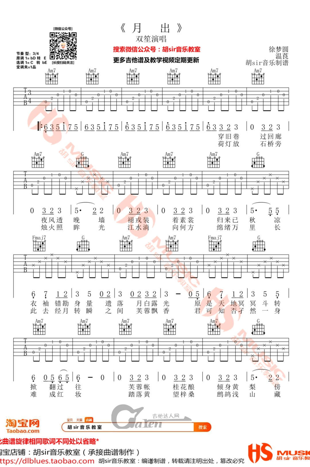 双笙《月出》吉他谱_C调弹唱谱_古风歌曲 时间:2019-12-15 来源:胡sir音乐教室 点击:次 《月出》吉他谱,双笙演唱的一首古风歌曲,原调bD转E,选调C转bE,变调夹夹一品。月出六线谱,三张弹唱图片谱。胡sir音乐教室编配出品,易唱网吉他谱更新上传。 古风音乐成为未来华语流行音乐的不可忽视的力量,《月出》直接引用了《诗经》中的特别贴切,悠扬婉转的歌声响起,脑海中浮现的是古代大家闺秀唱歌的娇态。