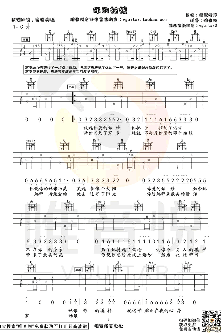 你的姑娘吉他谱_隔壁老樊_带原版前奏_吉他弹唱教学 时间:2019-12-15 来源:唯音悦 点击:次 《你的姑娘》吉他谱,隔壁老樊演唱的原创民谣歌曲,原调bD,选用C调指法,变调夹夹一品。你的姑娘六线谱,唯音悦编配,易唱网上传分享。随谱附上歌曲吉他弹唱教学视频,带超详细前奏讲解,喜欢的琴友们跟随老师的讲解示范学习。 很喜欢的一首歌,配上老樊的声线,使人深刻。越来自平凡的故事,往往越能体现细腻之美。人世间有太多的爱而不得,毕竟爱是细水长流,值得诊视收藏。