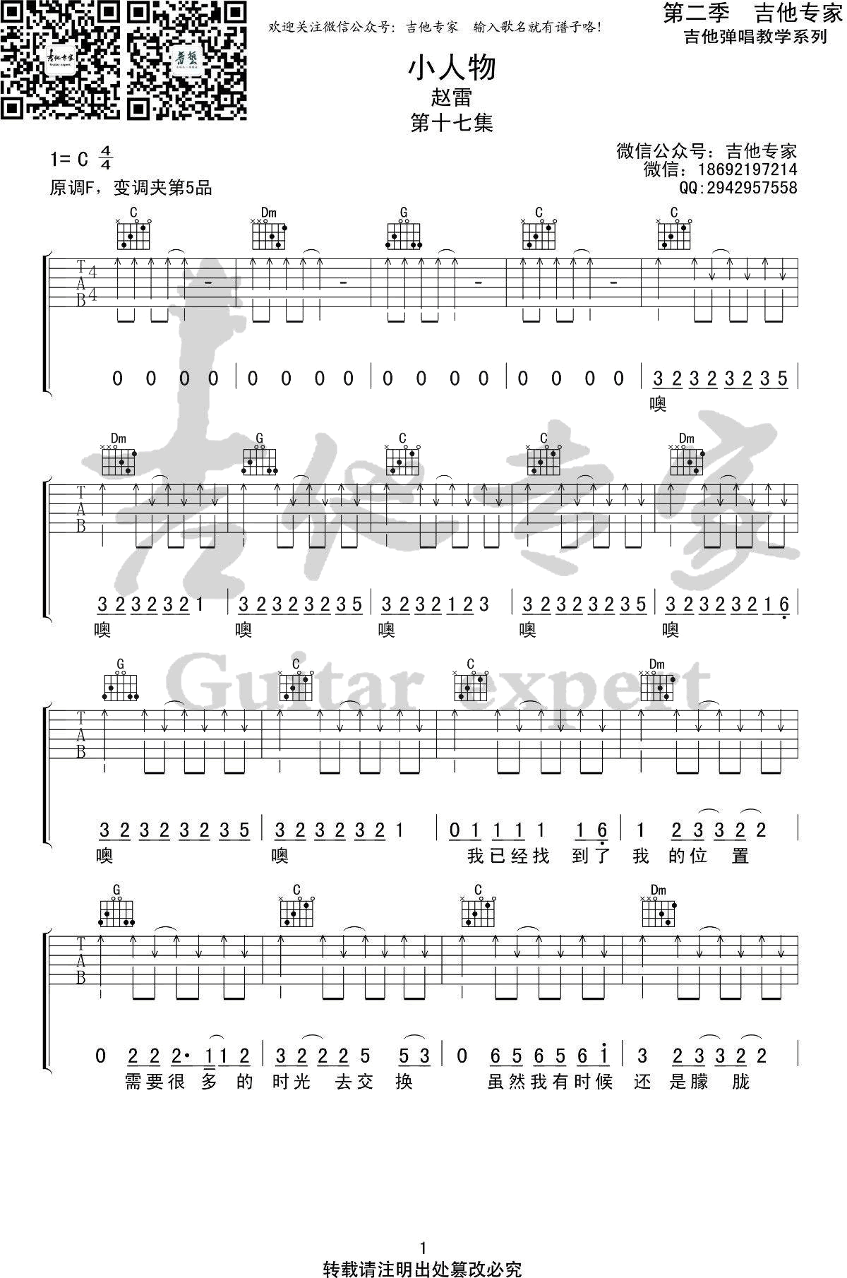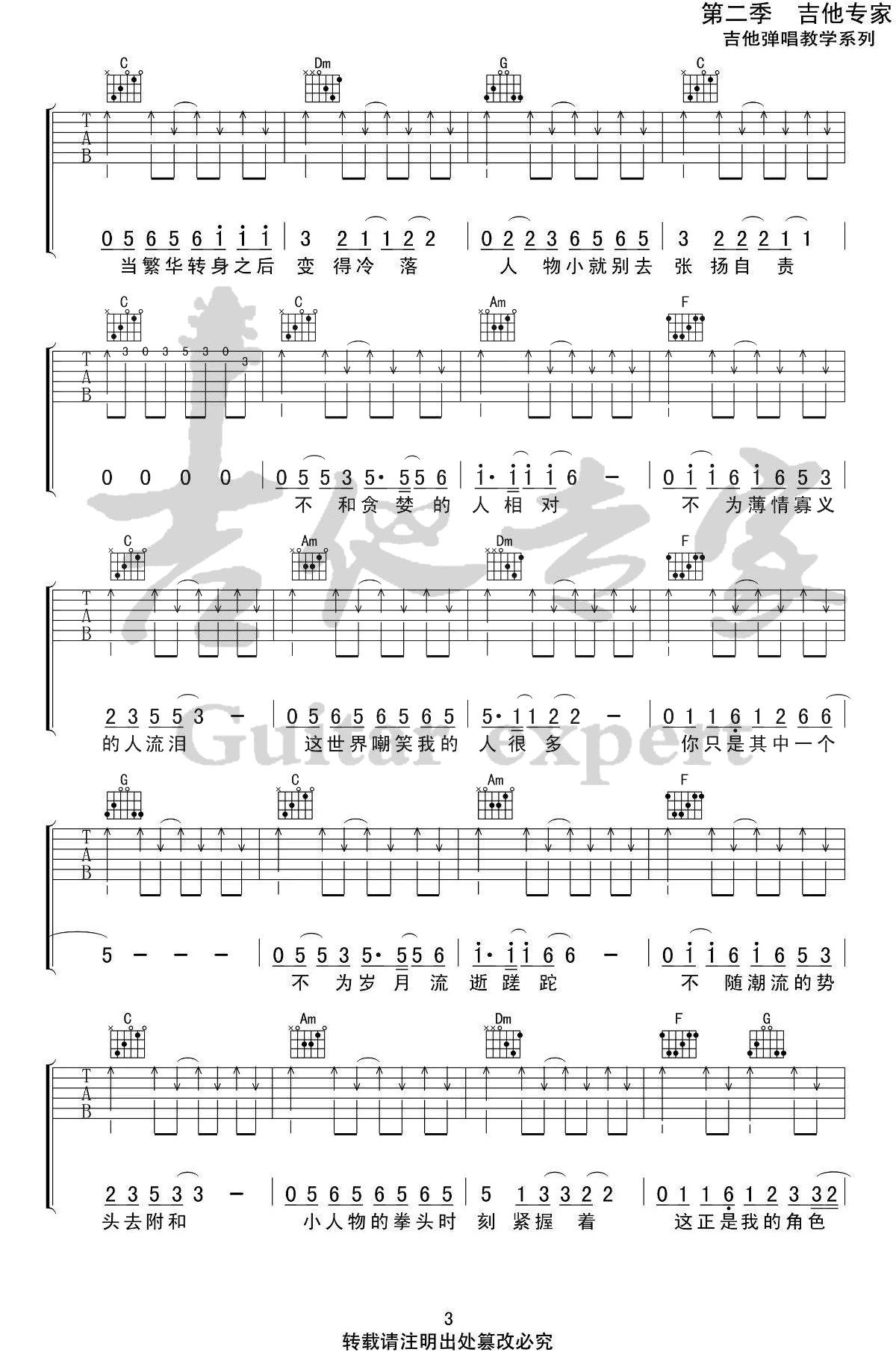 小人物吉他谱_赵雷_C调弹唱谱_完整版六线谱 时间:2019-12-20 来源:吉他专家 点击:次 《小人物》吉他谱,赵雷终于正式发布了这首新歌单曲的官方版本,还是熟悉的配方,还是熟悉的味道。小人物六线谱,原调F,变调夹夹五品,C调指法编配,感谢吉他专家分享出品,易唱网吉他谱整理上传。 人潮拥挤,在城市的人流里穿梭,大家都是芸芸众生。接受那些理想的落差,接受自己只不过是一个普普通通的平凡人,好好活着。活出属于小人物的那种精彩,也不失为一种幸福。