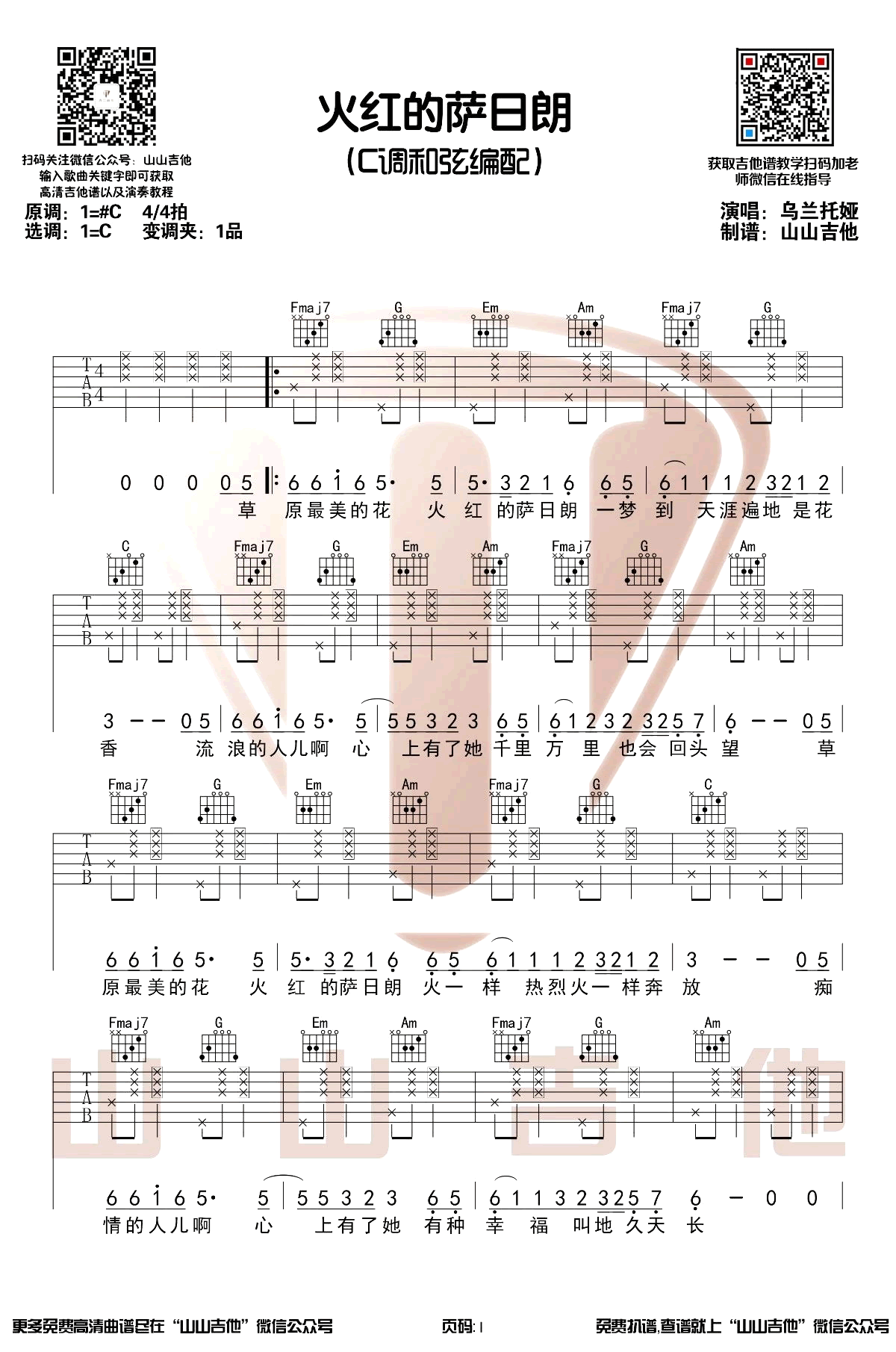 火红的萨日朗吉他谱_C调弹唱谱_要不要买菜_吉他演示视频 时间:2019-12-25 来源:山山吉他 点击:次 《火红的萨日朗》吉他谱,乌兰图雅演唱的一首草原牧歌,最近由要不要买菜翻唱而爆红网络。火红的萨日朗六线谱,C调和弦编配,山山吉他制谱分享,易唱网整理上传。 萨日朗是一种草原之花,颜色鲜红,就像火一样,这首歌曲以火红的萨日朗为名,象征着对美好生活的向往,正如歌词所说,绵延大道有多远,幸福生活有多长。火山老师也为大家录制了这首歌的吉他演奏版本,大家快来一起听听吧!