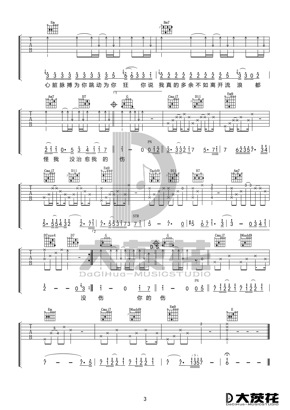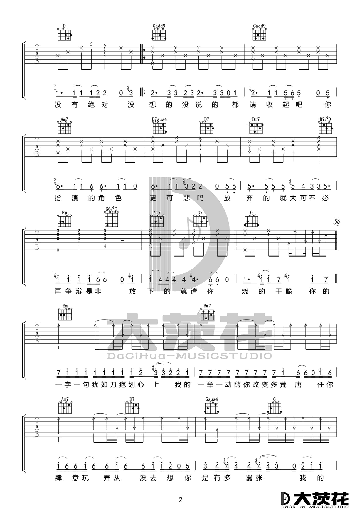 嚣张吉他谱_EN_G调_弹唱六线谱_高清版 时间:2019-12-27 来源:大茨花 点击:次 EN《嚣张》吉他谱,原调B,选调G,CAPO夹四品。嚣张吉他弹唱谱,三张图片六线谱。大茨花音乐工作室编配出品,易唱网上传分享。 一首好听的情歌,大概是因为卑微扎心的歌词引起了无数人的共鸣。歌曲唱出了一个人的喜欢,付出过的伤感,以及为爱做过的荒唐,明明很受伤却依然装着若无其事的悲哀。