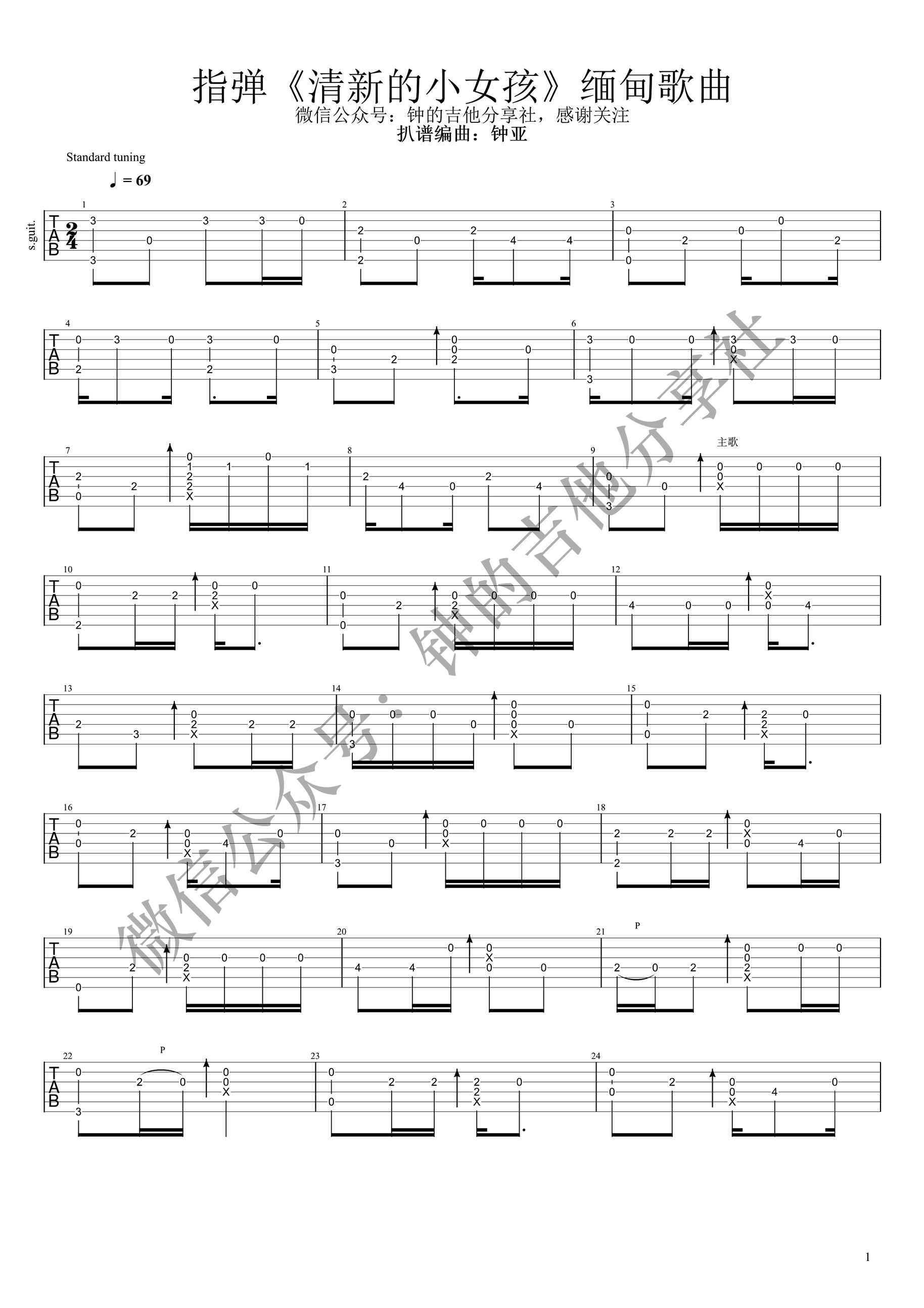 清新的小女孩指弹谱_缅甸歌曲_吉他独奏演示视频 时间:2020-01-07 来源:钟亚 点击:次 清新的小女孩指弹谱,缅甸歌曲改编,这首洗脑神曲被网友配上《牧马人》这电影火了。清新的小女孩吉他独奏谱,钟的吉他分享社出品,易唱网整理上传。 钟亚老师编配说明:加了和声,加了拍扫弦,加了一些击勾弦,曲子也弹熟了,录了视频,虽然没那么好听,不过做好一首还是不容易的。 G调的歌曲,G调指法低八度编配,G调各级和弦:G-Am-Bm-C-D-Em-#Fdim,全曲和弦走向:G-Dm-Em-Bm-C-G-Am-D,就别再问谱子为啥没和弦了。