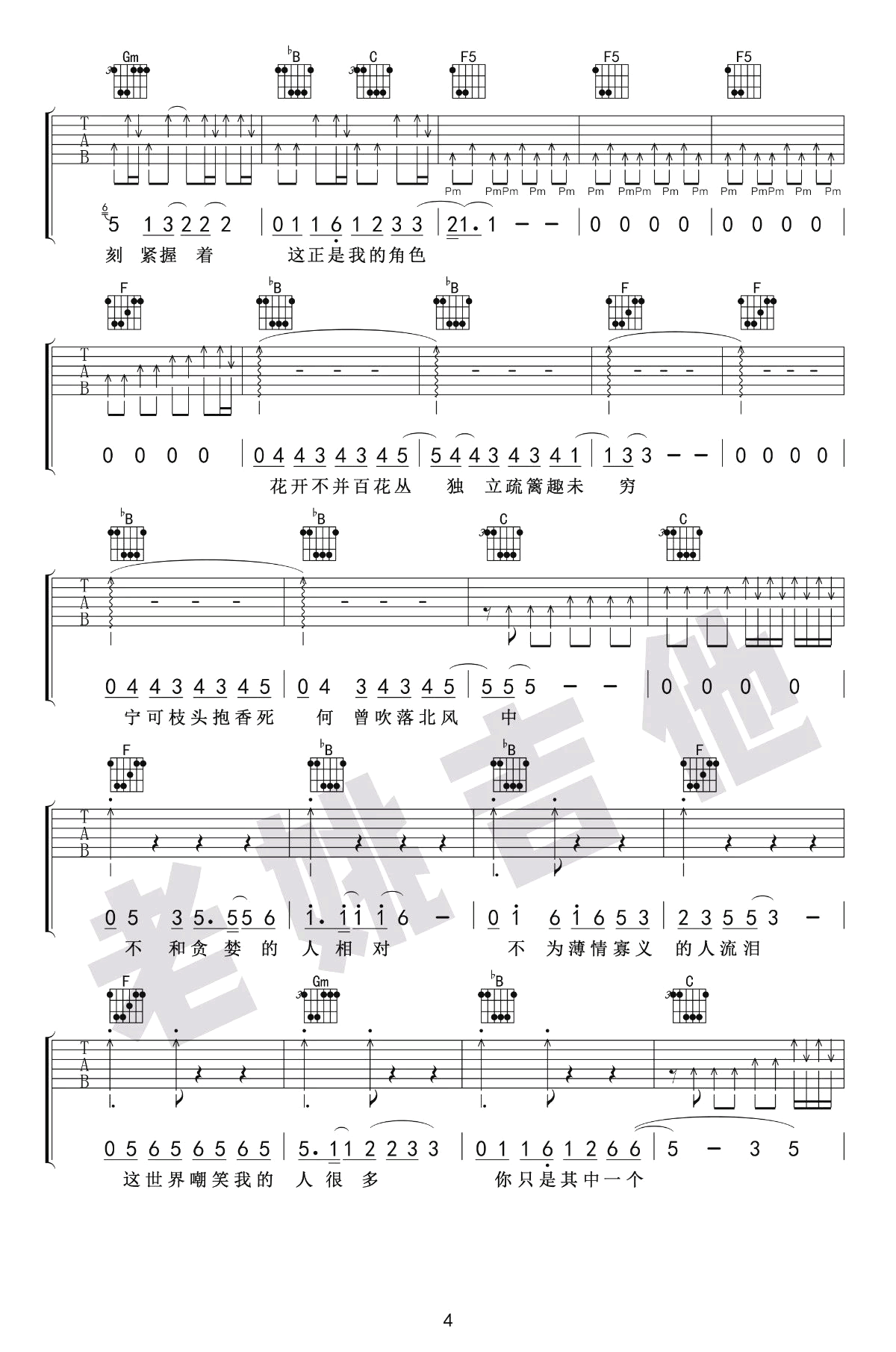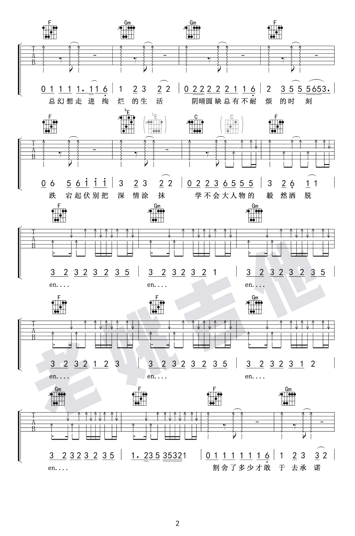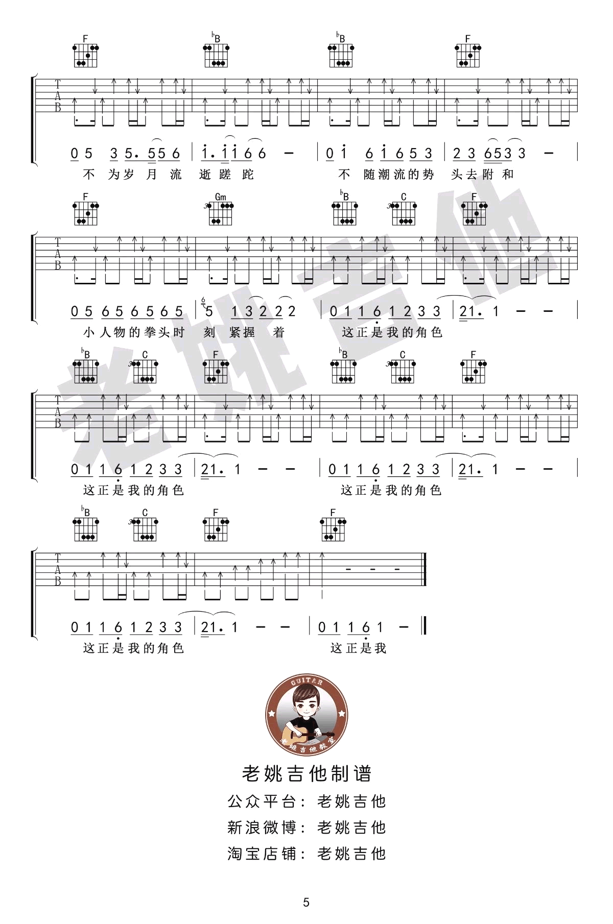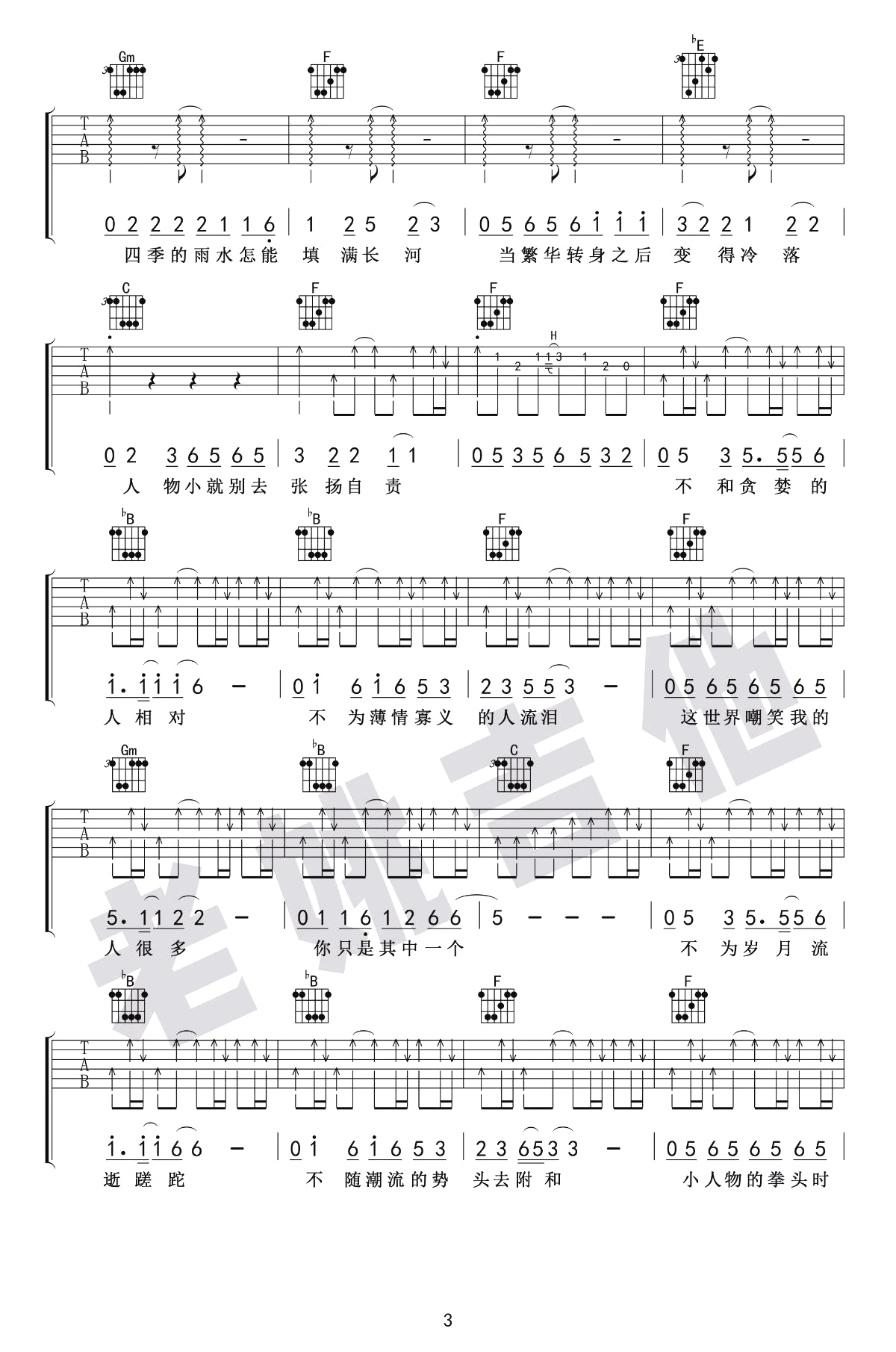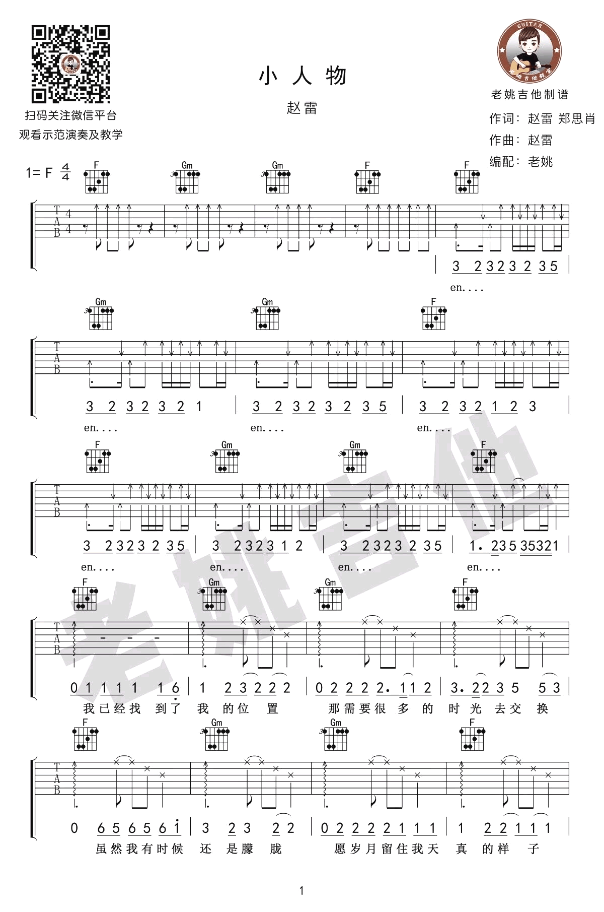 小人物吉他谱_赵雷_吉他弹唱+教学视频 时间:2020-01-29 来源:老姚吉他 点击:次 《小人物》吉他谱,赵雷演唱的一首民谣歌曲,小人物六线谱,完整版共五张图片谱例,老姚吉他编配出品,易唱网整理分享。随谱附上歌曲的吉他弹唱教学视频。 小时候,我们都有齐天大圣的梦,长大后,才知道也许“平凡”才是唯一的答案。宏图壮志有太多,活成大人物的有几个。愿听到这首歌的你我,感受到平凡中的倔强,不为平凡桎梏,活出自己的精气神。