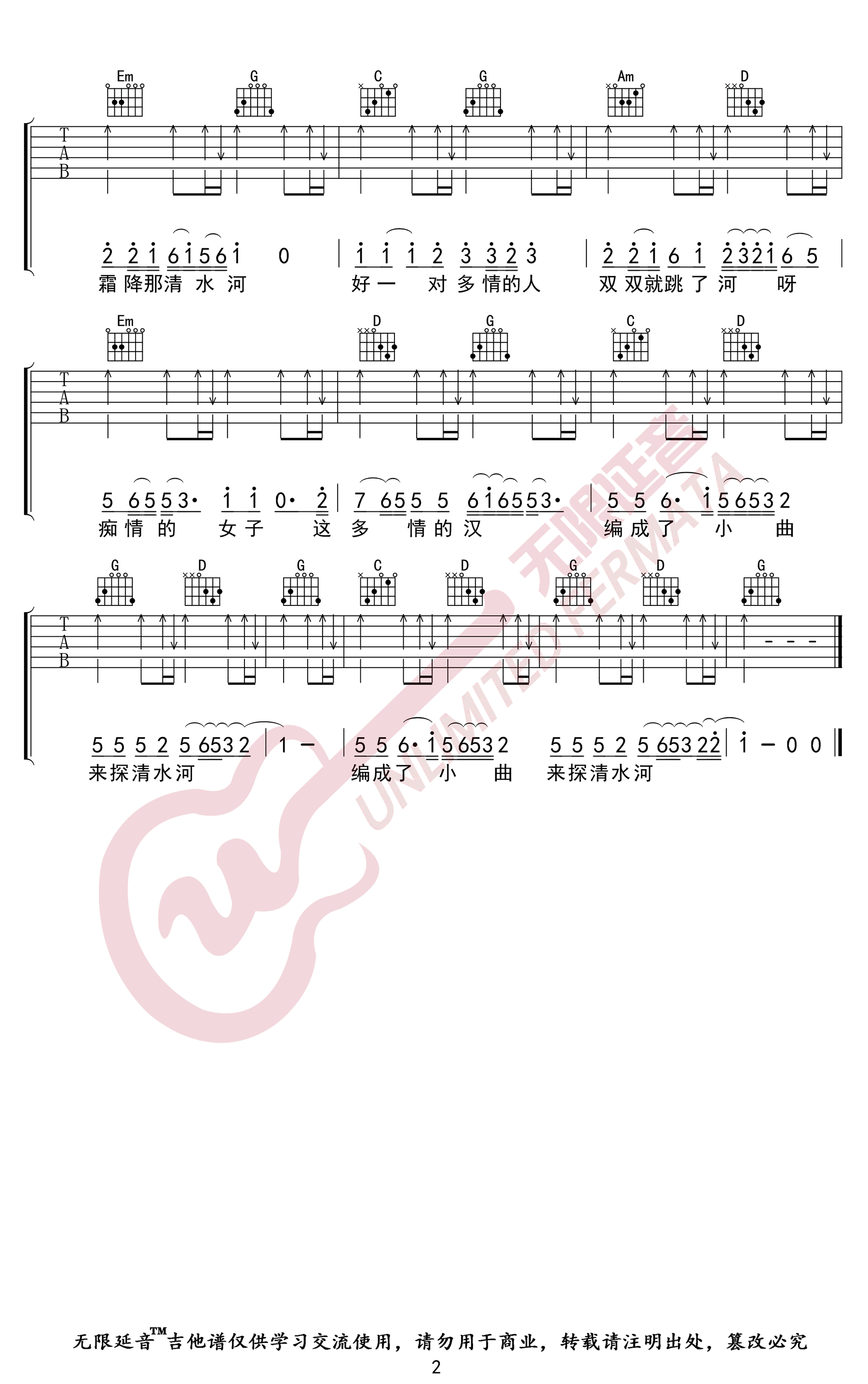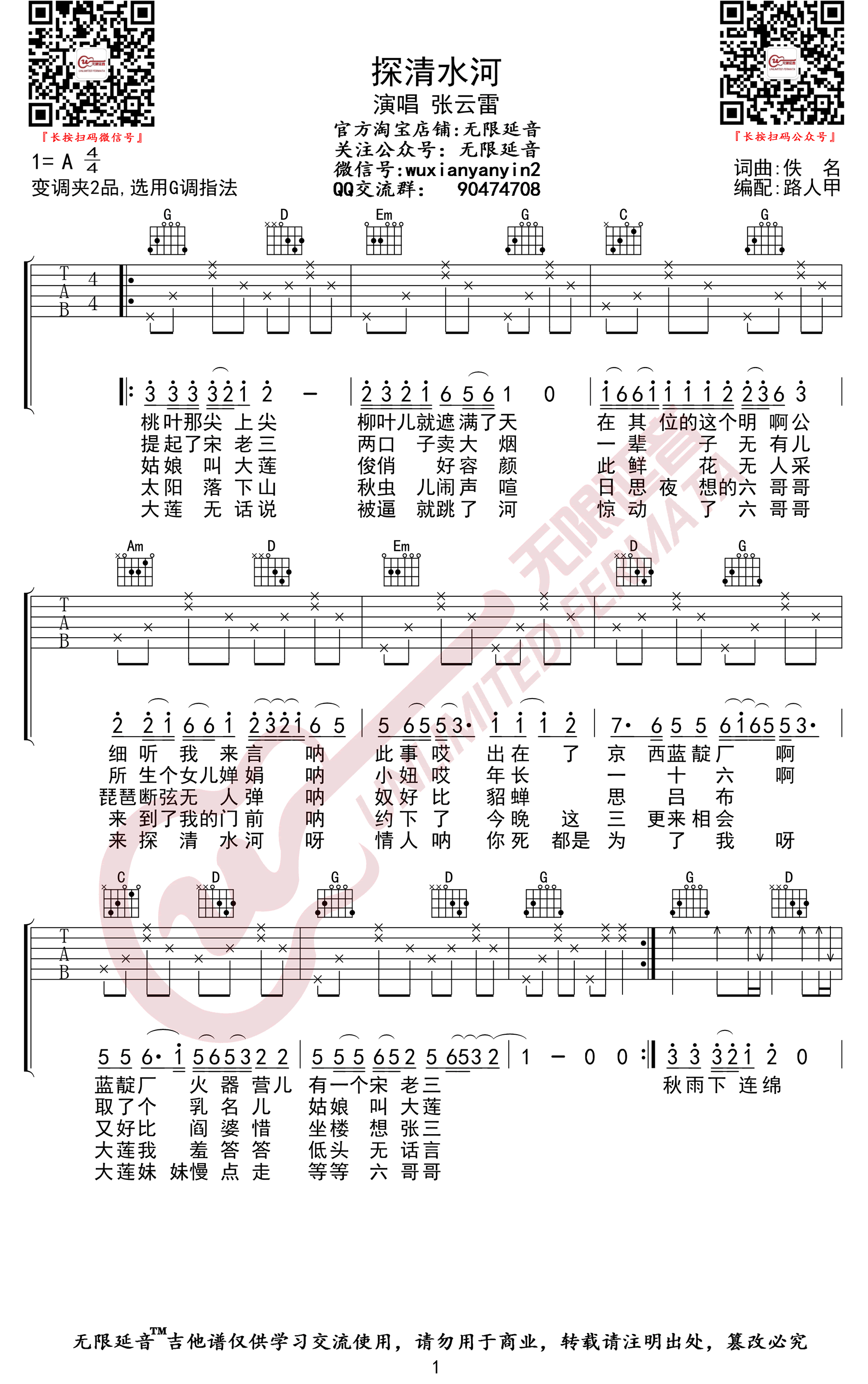 vwin德赢-手机APP下载-易唱网echangwang.com 时间:2020-02-28 来源:无限延音 点击:次 张云雷《探清水河》吉他谱,原调A,选用G调指法,变调夹夹第二品。一首传统的民国北京小调改编,探清水河六线谱,高清弹唱图片谱,无限延音编配,易唱网更新分享。 讲述一个类似“梁祝”的凄美爱情故事。不同于郭德纲的高耸入云,张云雷用流行唱法,非常细腻且动听的嗓音,一首曲调婉转的《探清水河》,唱醉了一众迷妹迷弟,抓住了观众的心。
