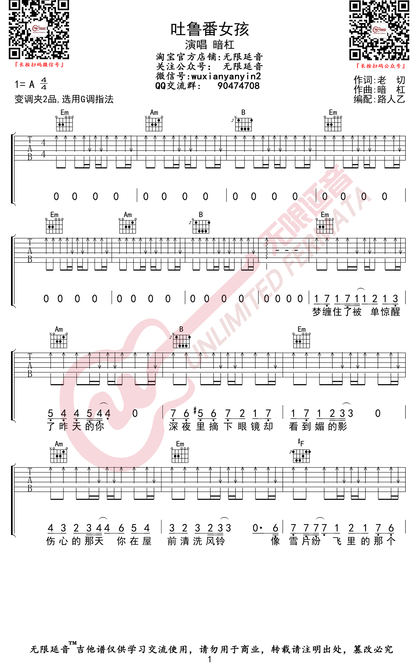 吐鲁番女孩吉他谱_暗杠_G调弹唱谱_高清版 时间:2020-03-21 来源:无限延音 点击:次 《吐鲁番女孩》吉他谱,暗杠演唱的一首节奏轻快的民谣歌曲,原调A,变调夹夹第二品,选用G调指法。吐鲁番女孩六线谱,两张高清弹唱图片谱。无限延音制谱分享,易唱网上传更新。 《吐鲁番女孩》最早收录于实体专辑《一念。》之中,还是熟悉的歌词,却是不一样的编曲。有人感觉节奏更快了,有人觉着时间稍短了,有人听着就饿了,有人想去浪了,有人想娶新疆姑娘了,有人思念家乡了……无论你是哪种感受,都是对这首歌爱的热烈的表现。