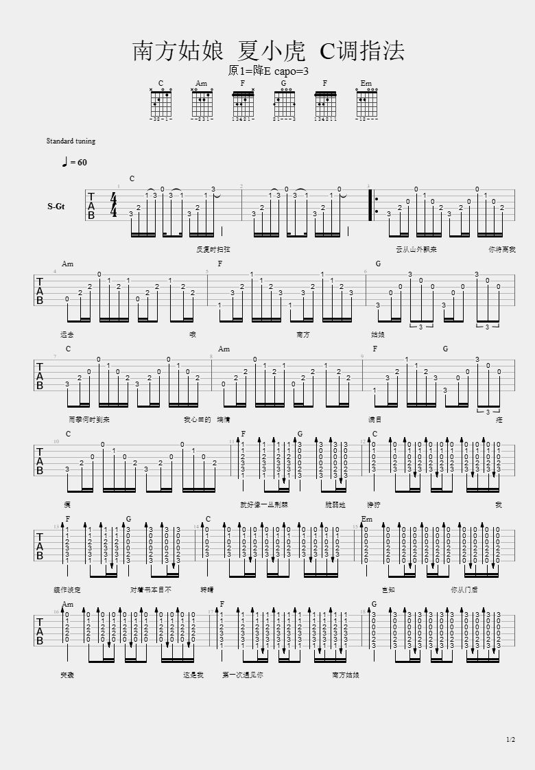 夏小虎《南方姑娘》吉他谱_C调指法_弹唱谱 时间:2020-03-30 来源:Liquor 点击:次 南方姑娘吉他谱,夏小虎版本,原调降E,capo夹三品,选用C调指法。南方姑娘六线谱,Liquor编配,易唱网上传更新。 她不是赵雷口中那个爱穿花裙子的南方姑娘,而是夏小虎心中那个喜欢在雨中狂奔的南方姑娘。