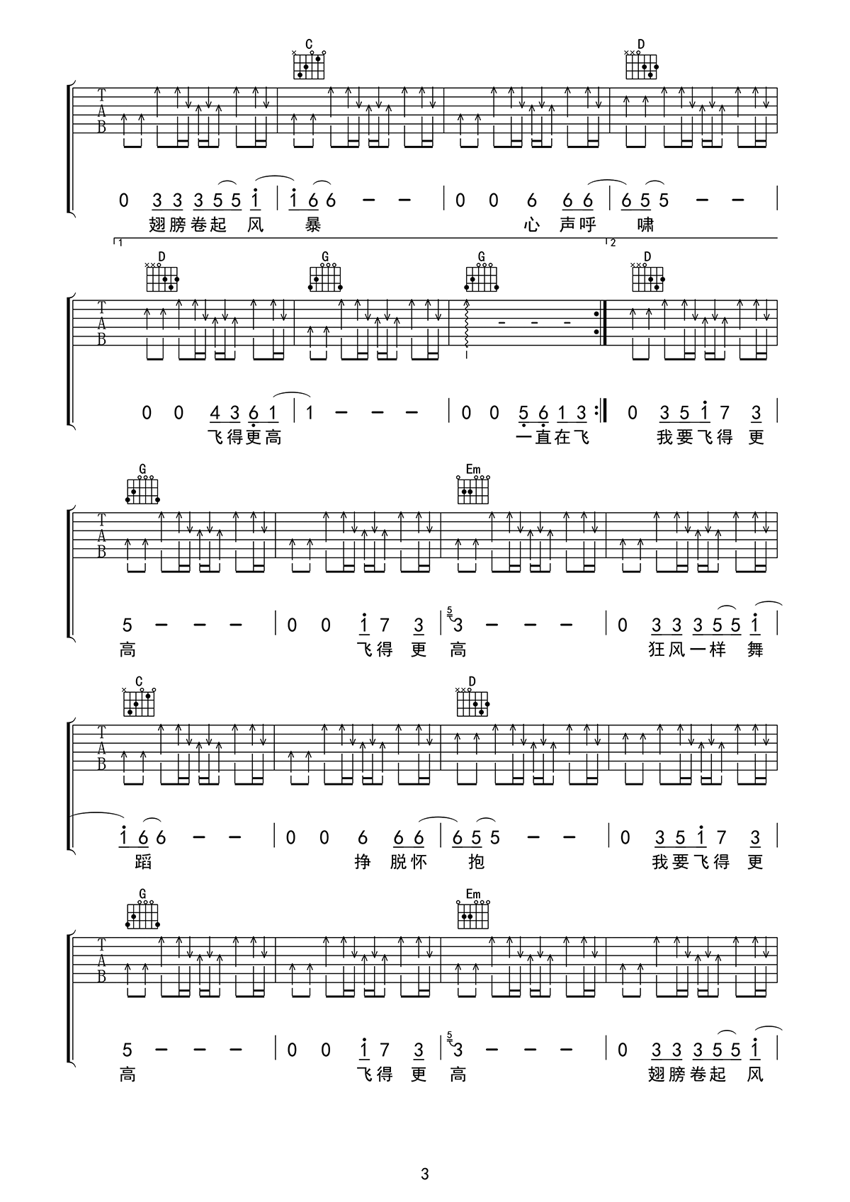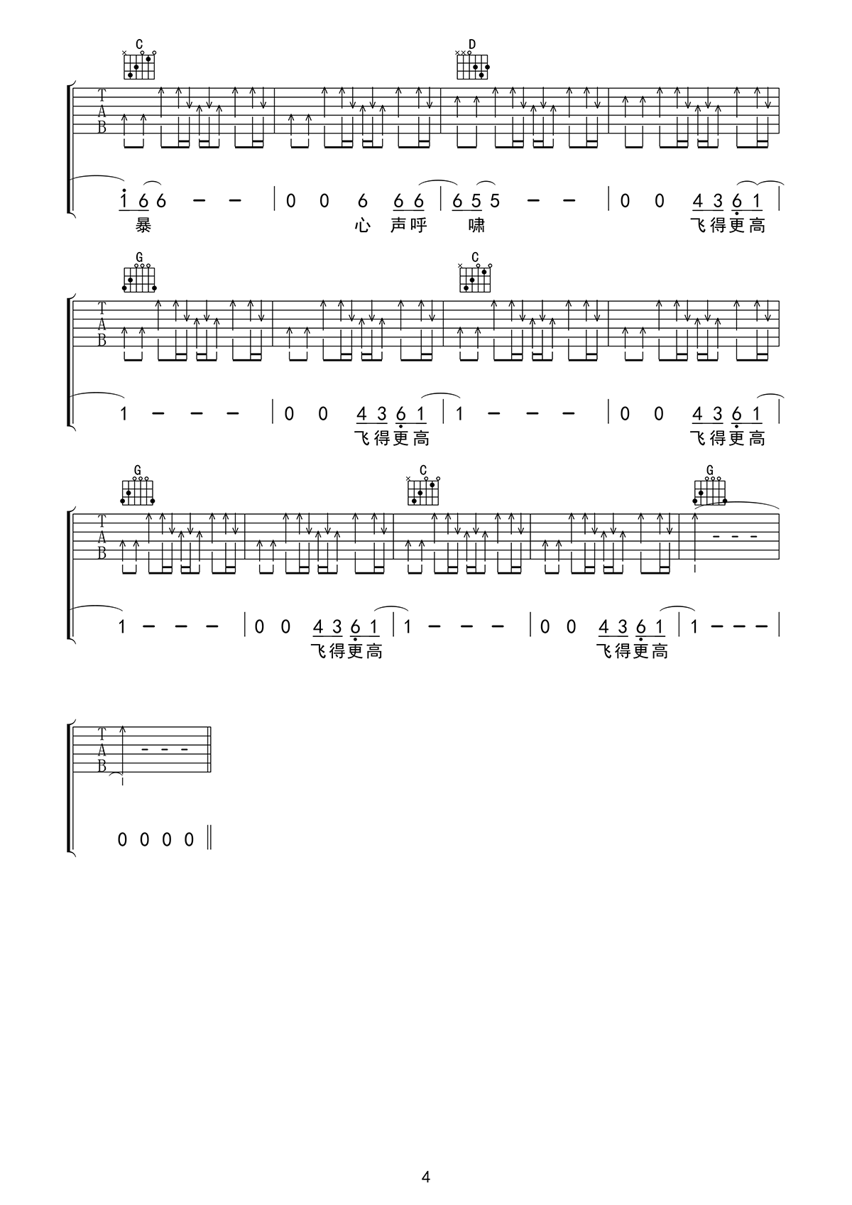 LD乐动体育官方-手机APP下载-易唱网echangwang.com 时间:2017-09-14 来源:王超 点击:次 飞得更高吉他谱,汪峰的一首代表歌曲,飞得更高六线谱,高清图片谱,G调指法,曲谱适合吉他初学者练习拨片扫弦。感谢王超的编配和分享,易唱网整理分享。 汪峰的经典励志歌曲,来自歌曲灵魂深处对于理想与现实间的彷徨;对于冲破牢笼,挣脱束缚的欲望到如今依然震撼人心。以音乐为径,给予人强大的精神力量,温暖的心灵归宿。