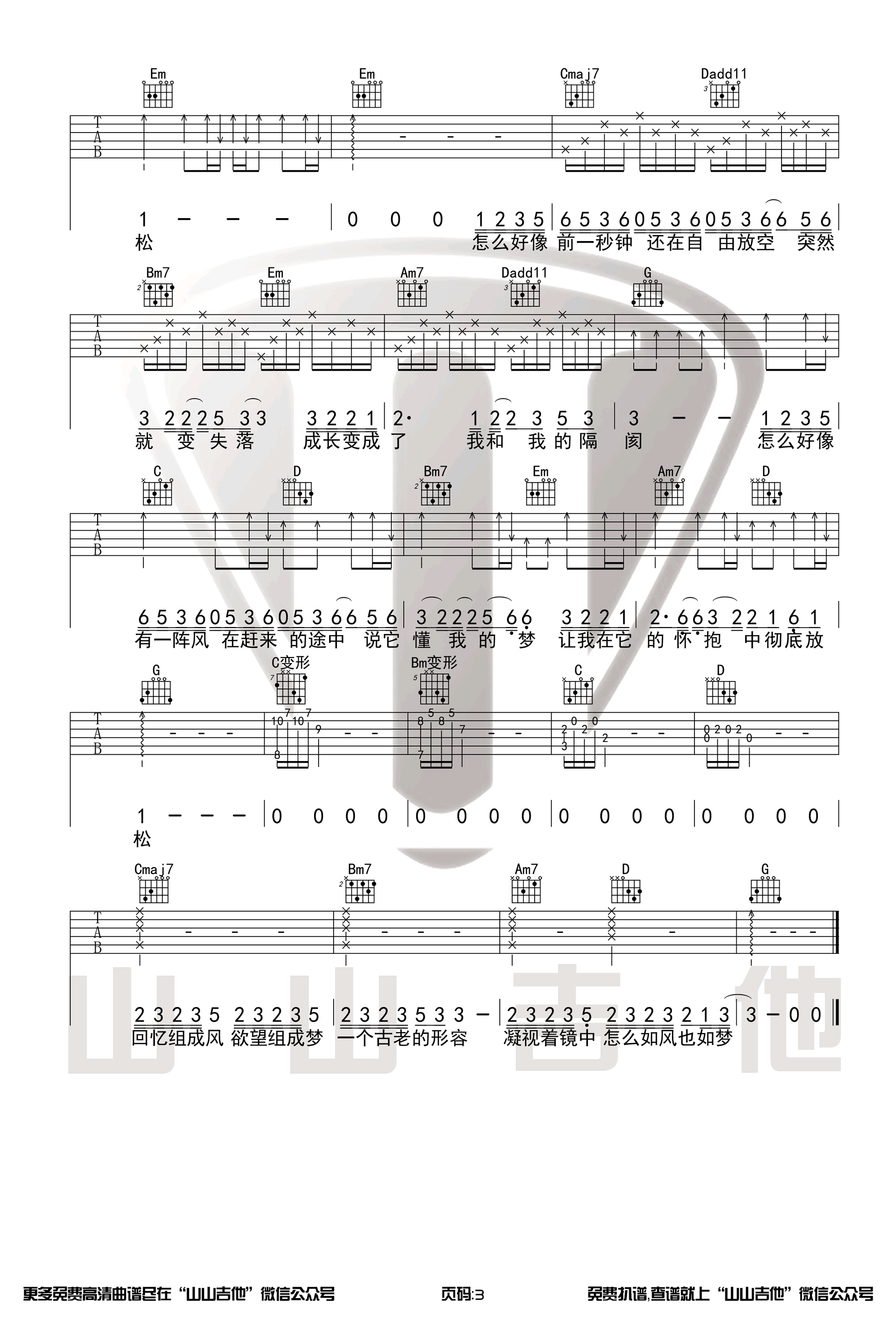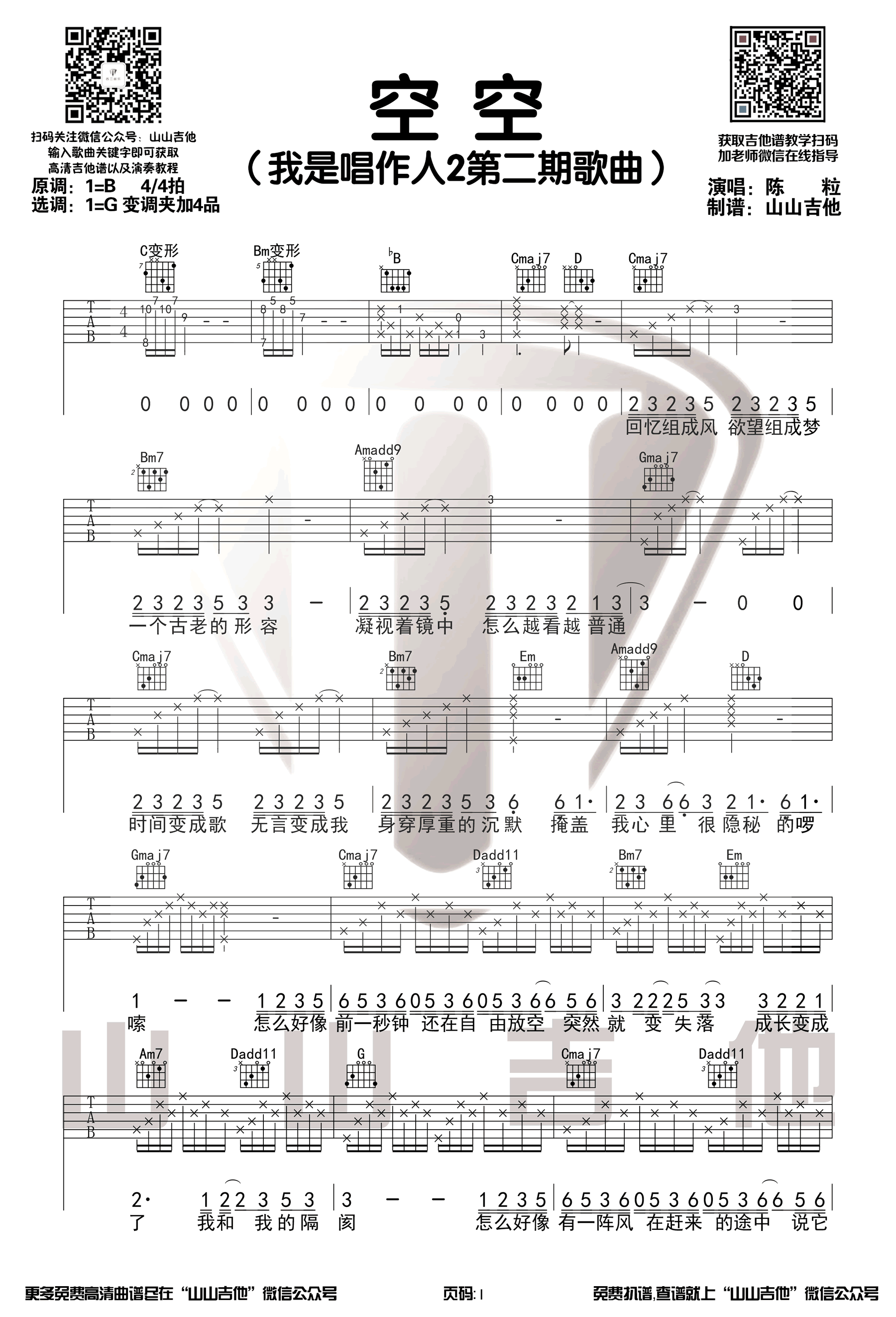 陈粒《空空》吉他谱_G调原版_吉他弹唱演示视频 时间:2020-05-14 来源:山山吉他 点击:次 《空空》吉他谱,陈粒演唱,原创音乐的节目《我是唱作人》中的一首歌曲。空空六线谱,选用G调指法编配,变调夹夹第四品,三张弹唱图片谱,感谢山山吉他出品,易唱网更新上传。 这首歌一经演唱就收获了众多网友的喜爱,今天我们就带来了这首歌的原版吉他谱。山山老师为大家录制了演示视频,喜欢这首歌的朋友们可以拿起吉他谱练起来啦~
