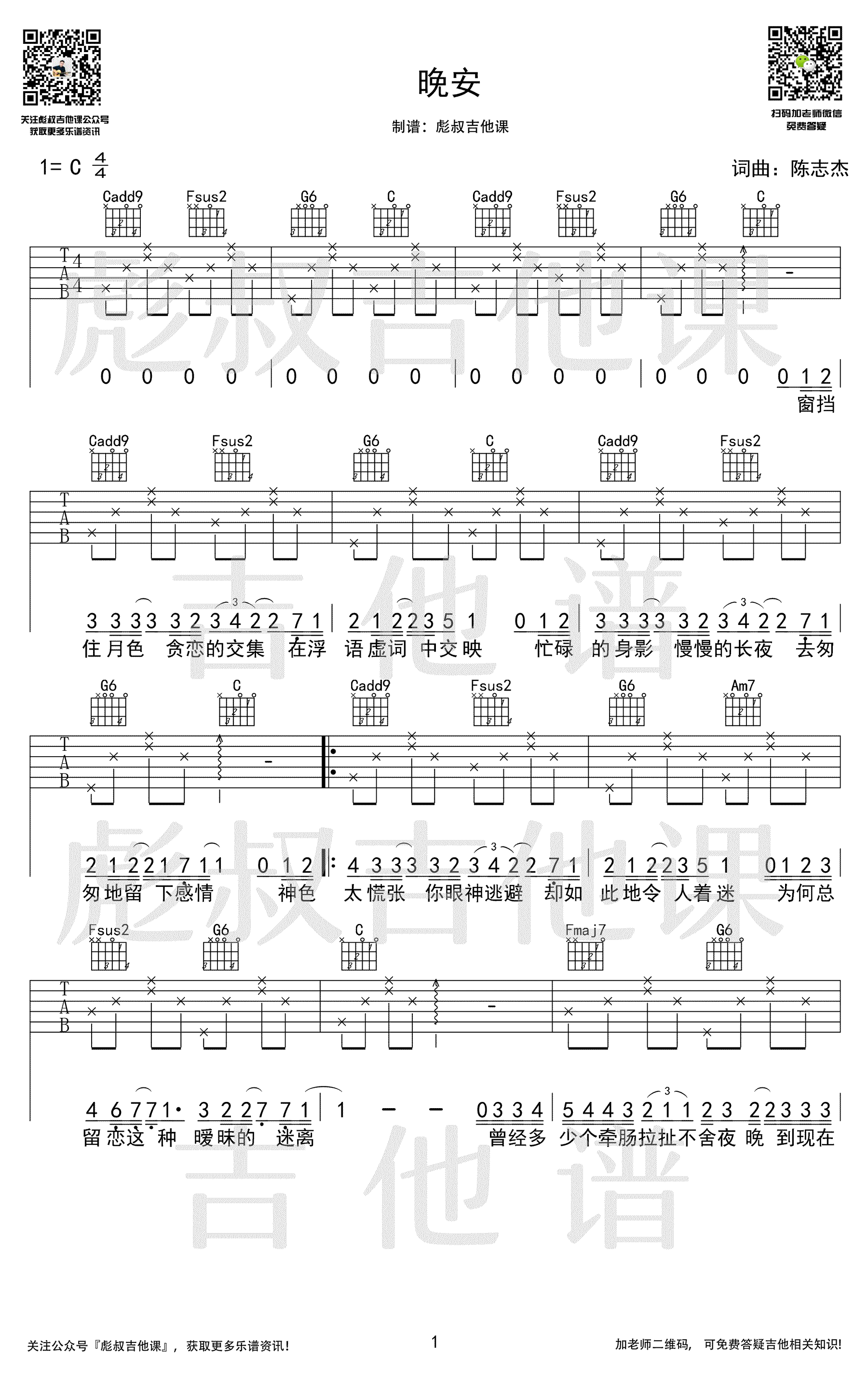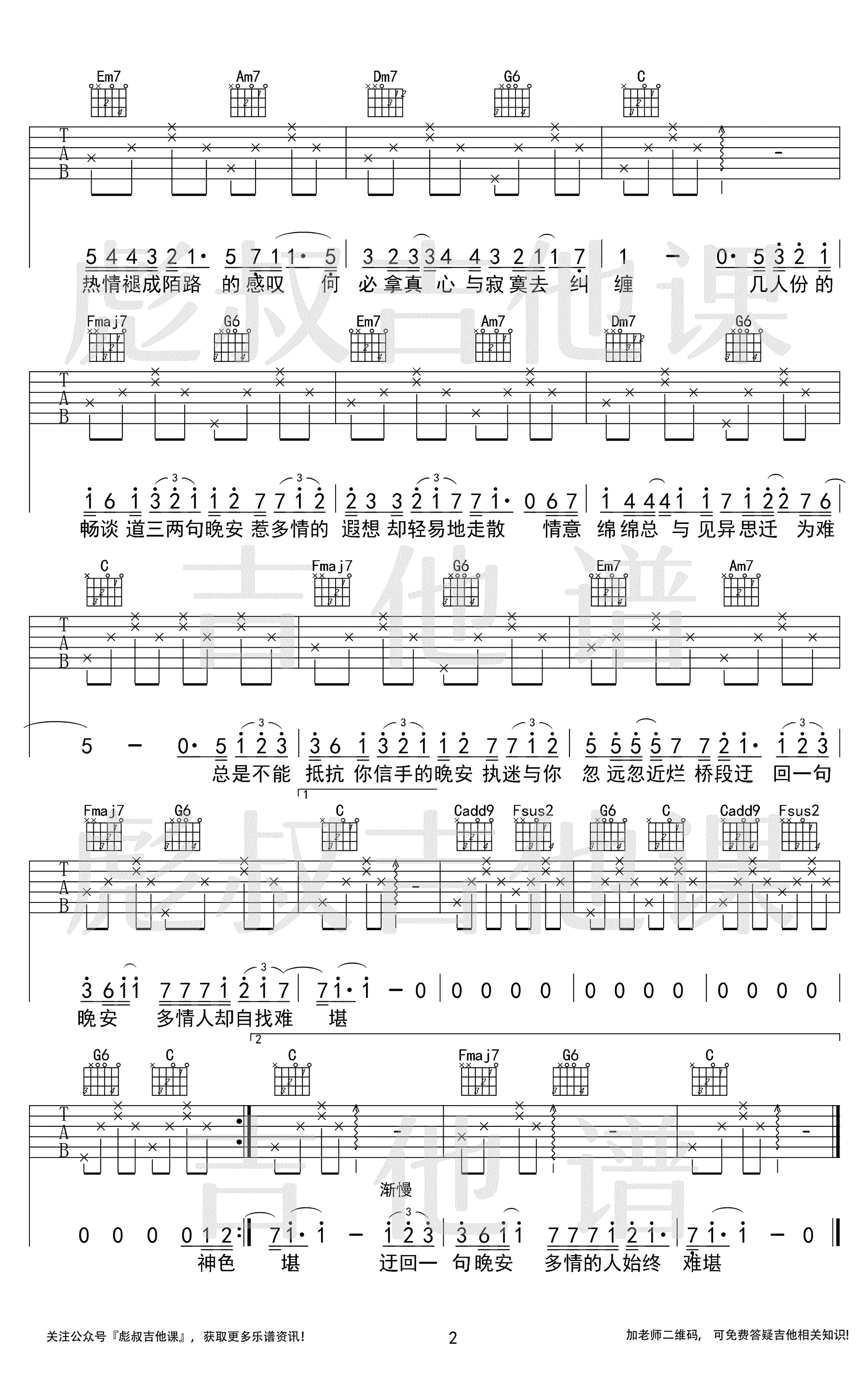 《晚安》吉他谱_颜人中_C调简单版_弹唱谱 时间:2020-06-06 来源:彪叔吉他课 点击:次 《晚安》吉他谱,颜人中的一首代表歌曲,晚安六线谱,C调简单版,彪叔吉他课编配制谱,易唱网更新上传。 你也在等那一句晚安,和那一个有可能的夜晚吗?在听这首歌曲时,脑海中想到了谁呢?愿屏幕前那些所有的喜欢和讨厌都不用遮掩,愿你每天都能跟喜欢的人讲一大堆废话,也能互道晚安。
