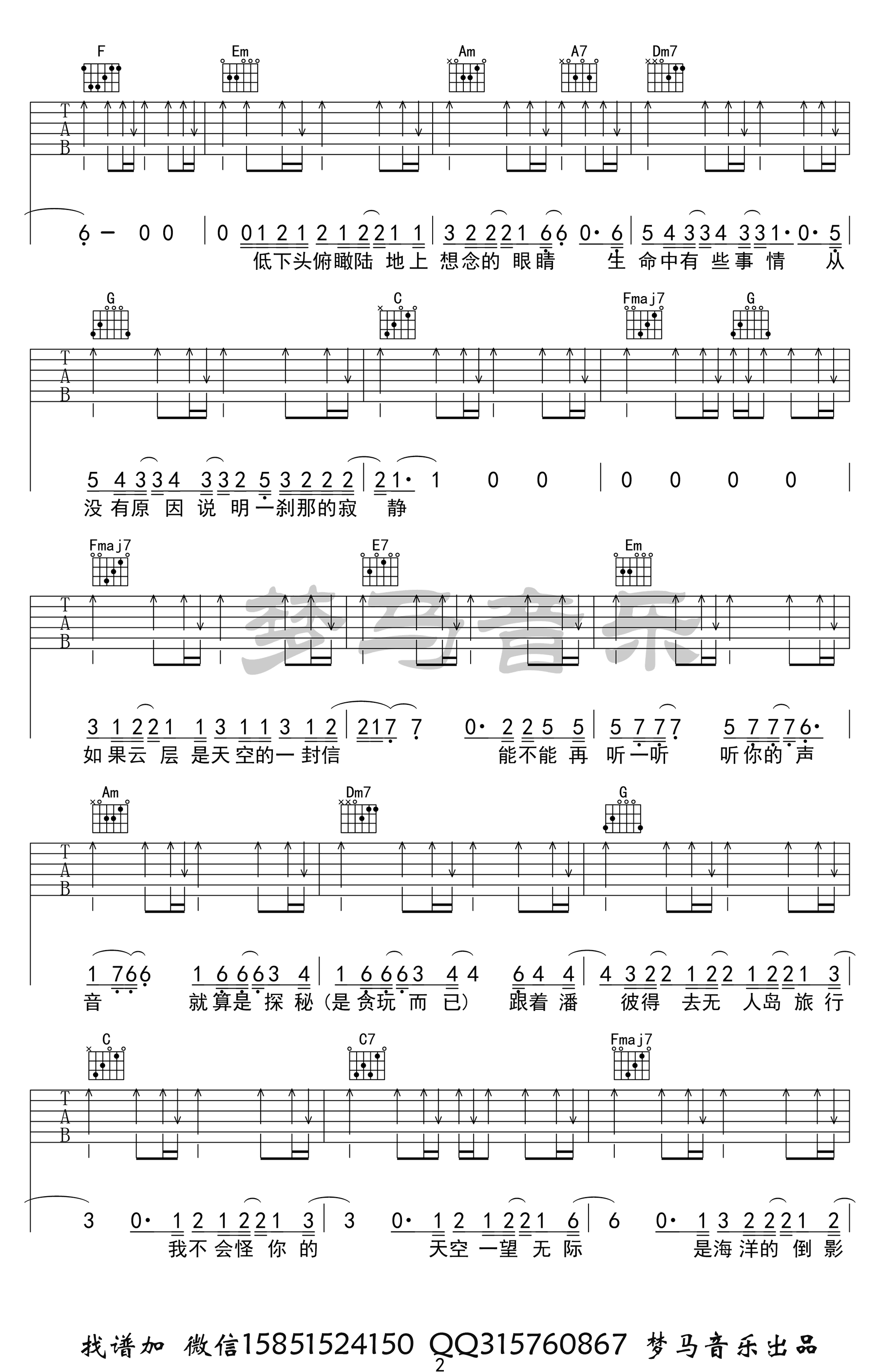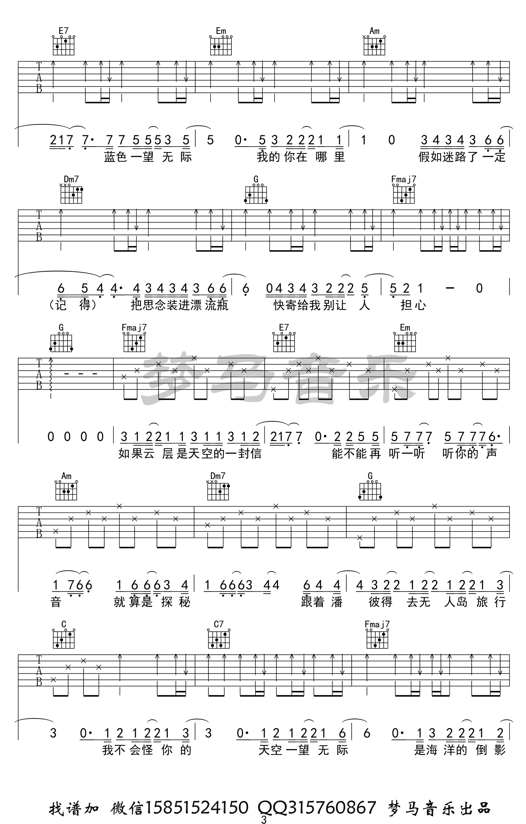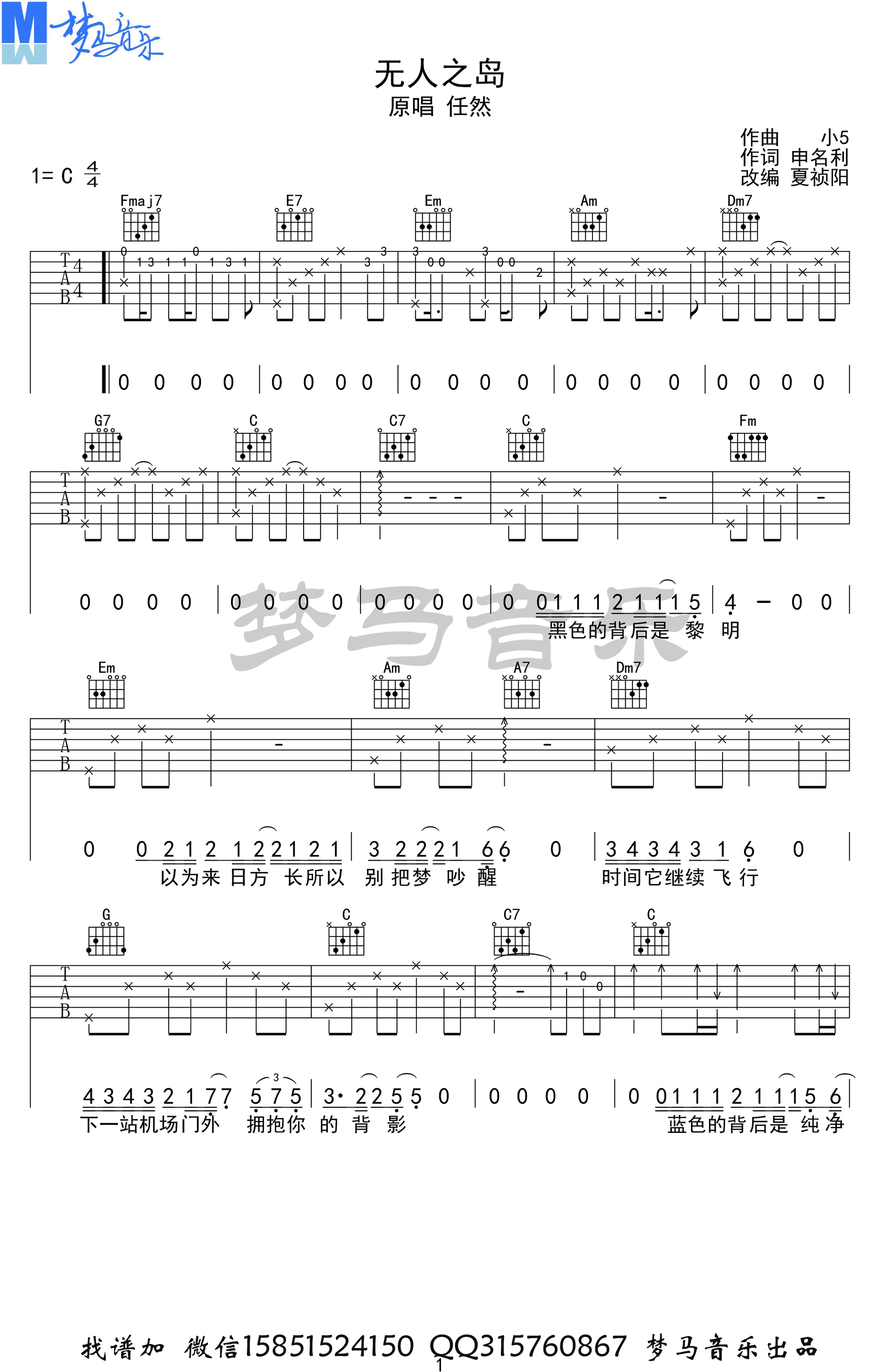 无人之岛吉他谱_任然_C调_高清图片谱 时间:2020-07-01 来源:梦马音乐 点击:次 《无人之岛》吉他谱,任然的一首网络热门歌曲,温柔的歌声,释怀酸涩的感情。无人之岛六线谱,C调指法,完整高清版共四张图片谱例。梦马音乐编配制谱,易唱网整理上传。 有些记忆,即使过了很久,也不敢触碰;有些人,即使不常见,但会刻在心里;有些感动,只有翻阅后才知道,如果云层是天空的一封信,我能不能听到你的声音?