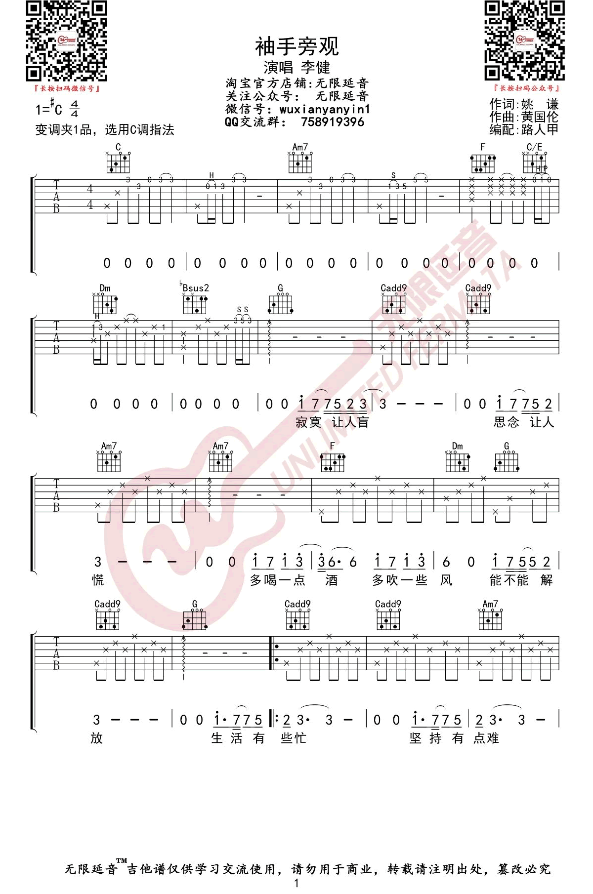 袖手旁观吉他谱_李健_C调指法_弹唱谱 时间:2020-07-06 来源:无限延音 点击:次 《袖手旁观》吉他谱,李健《我是歌手》节目演唱版本,袖手旁观六线谱,选用C调指法,变调夹夹一品。三张弹唱图片谱,无限延音制谱分享,易唱网上传更新。 欲忘不能,欲爱亦不能。如水蔓延的思念,无以言喻的心痛。这首齐秦原唱的经典情歌,经由曾一鸣、林志炫、李健、张宇、张碧晨等一众歌手翻唱,注入了不同的色彩和情感。