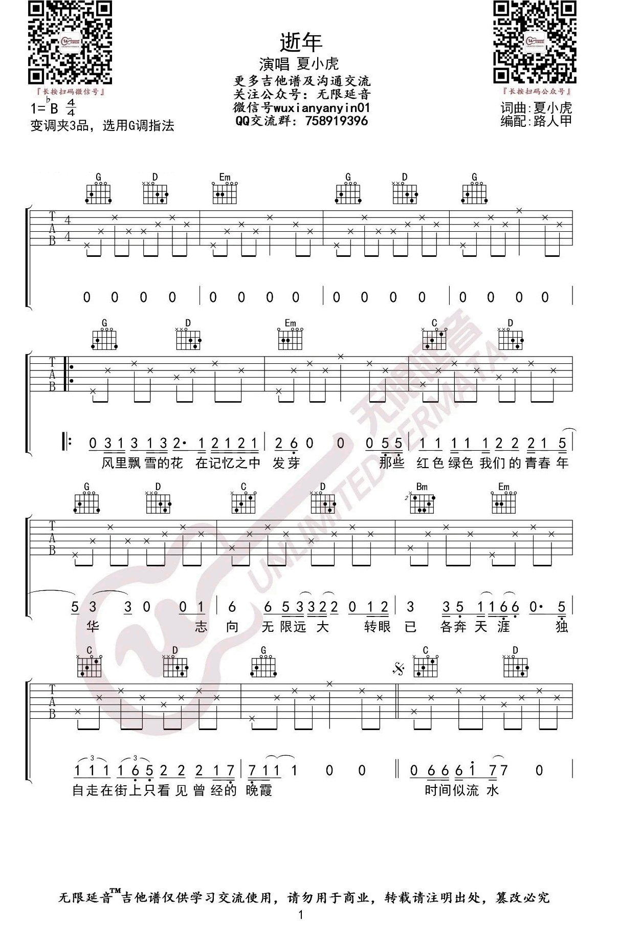 夏小虎《逝年》吉他谱_G调指法_弹唱六线谱 时间:2020-07-31 来源:无限延音 点击:次 《逝年》吉他谱,夏小虎演唱的一首民谣歌曲,逝年吉他弹唱谱,原调降B,变调夹夹第三品,选用G调指法。无限延音制谱分享,易唱网上传更新。 一把吉他,整首歌的分解和弦,简单的歌词,却道出了每个人那段青葱岁月的回忆。曾经那间教室坐着的那一群人,曾经最好的哥们,曾经心中的她。说好的一生一起走,却发现,有些时候,我们就连那一声再见都无法实现。
