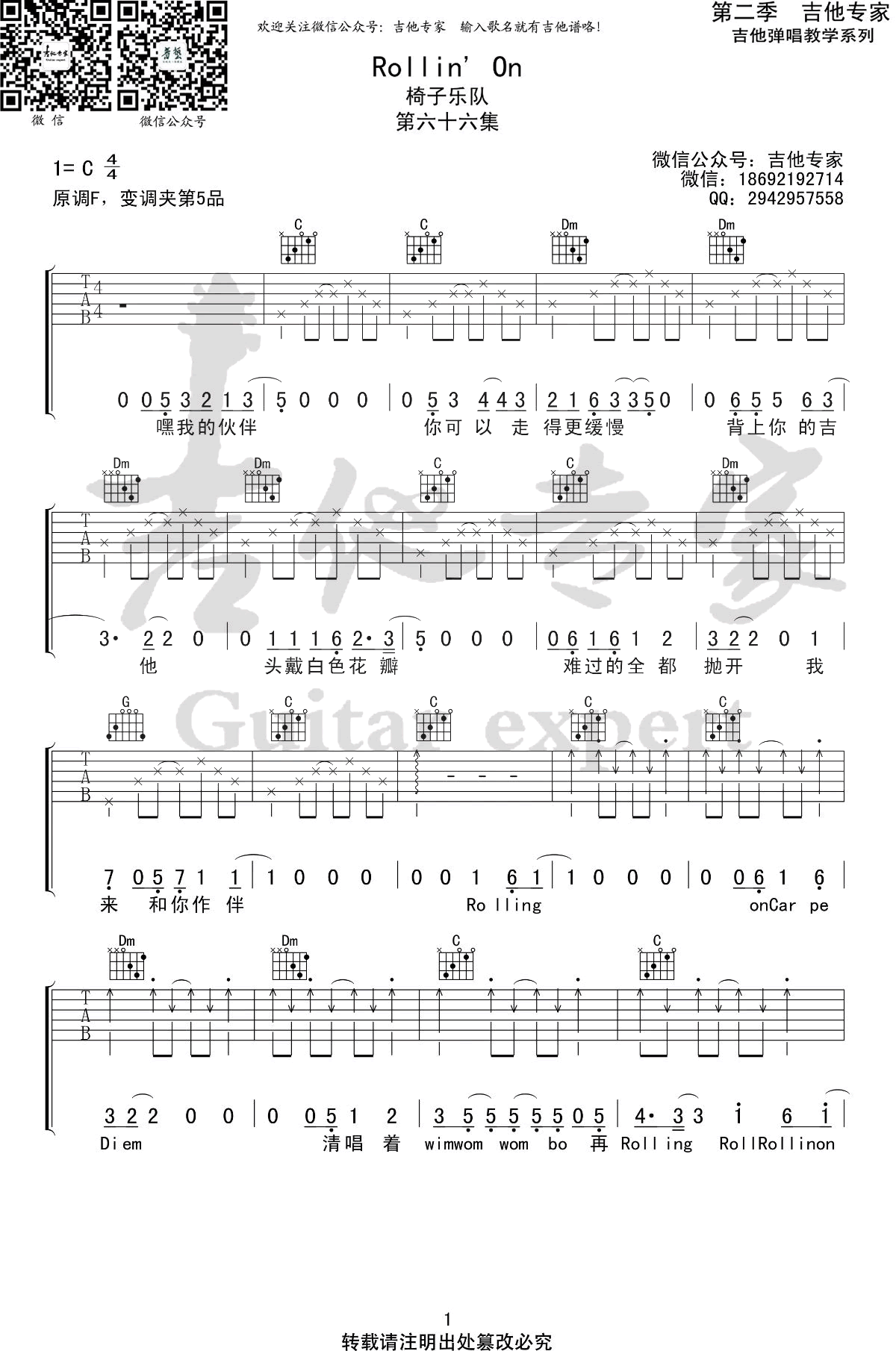 Rollin' On吉他谱_椅子乐团_C调简单版_乐队的夏天 时间:2020-08-08 来源:吉他专家 点击:次 《Rollin' On》吉他谱,来自台湾独立民谣乐队的椅子乐团的一首歌曲,Rollin' On六线谱,C调简单版,三张弹唱图片谱,吉他专家编配出品,易唱网更新上传。 《乐队的夏天》第三期播出后,椅子乐团演唱的这首《Rollin'on》晋升为不少乐迷的晚安小夜曲,温暖舒适又不失力量的歌词更是疗愈了乐迷受伤的心灵,给予大家伙伴般的温暖。