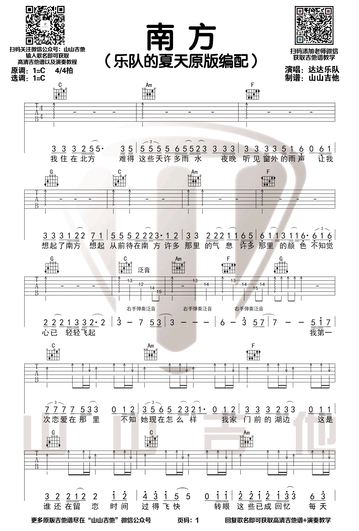 南方吉他谱_达达乐队_C调弹唱谱_乐队的夏天原版 时间:2020-08-12 来源:山山吉他 点击:次 《南方》吉他谱,达达乐队的一首经典代表歌曲,南方六线谱,C调,乐队的夏天原版编配,山山吉他出品,易唱网整理上传。 《乐队的夏天2》节目中,达达乐队作为压轴乐队出场,凭借一首经典歌曲《南方》成为了当场节目得票最高的乐队,在那个编曲和声走向还热衷于1 6 4 5 的年代,这首歌曲无疑是上乘的佳作,歌词很朴实但是却能引起强烈的共鸣,情感的过渡也非常的流畅,最终让听者跟着乐队一起陷入到这首歌曲里面去。