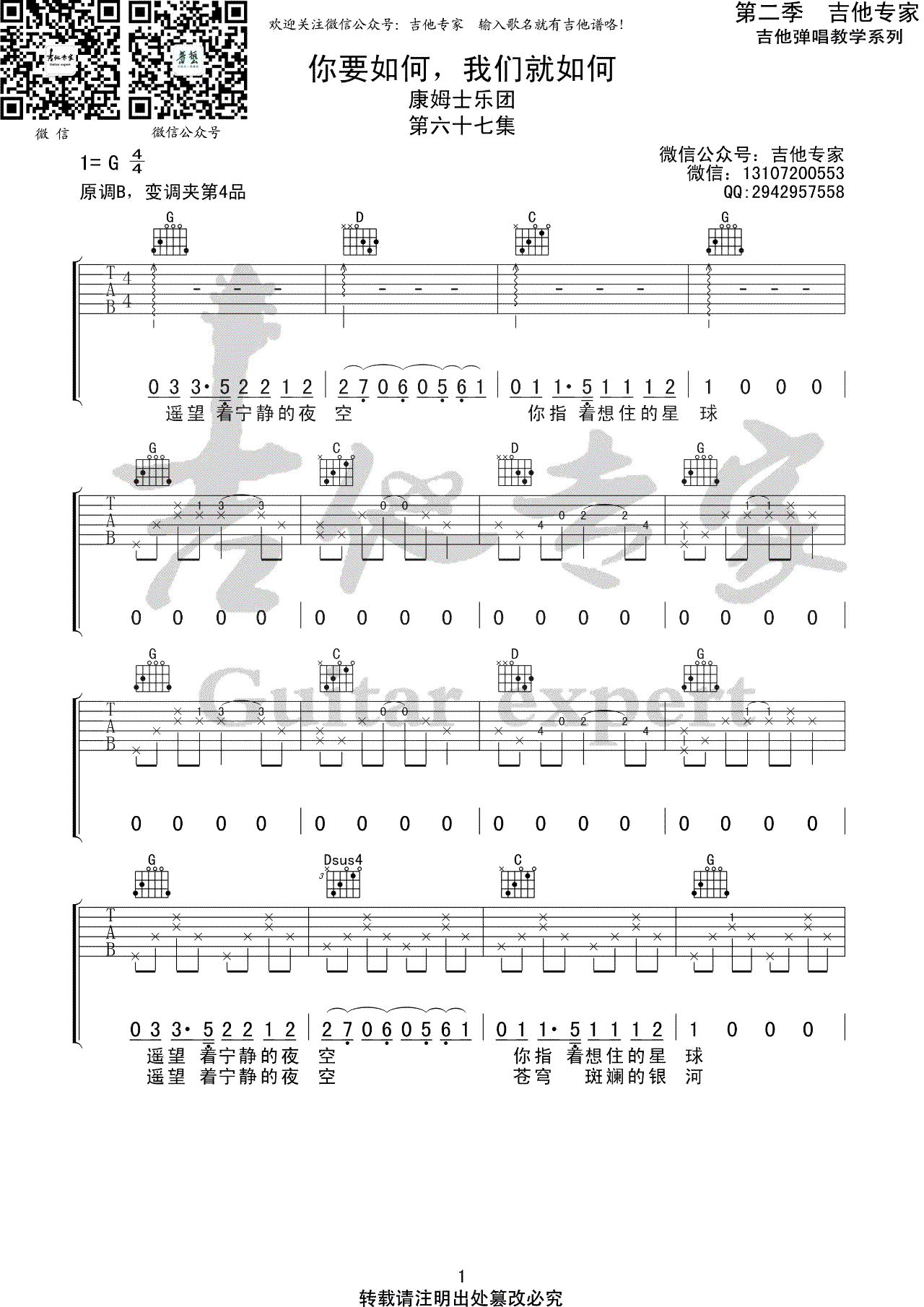 你要如何我们就如何吉他谱_康姆士乐团_G调弹唱谱 时间:2020-08-13 来源:吉他专家 点击:次 《你要如何我们就如何》吉他谱,康姆士乐团《乐队的夏天》节目演唱,你要如何,我们就如何六线谱,原调B,变调夹夹第四品,选用G调指法。共四张弹唱图片谱,吉他专家编配出品,欢迎来易唱网www.echangwang.com关注最新吉他谱。 我们在白天迷失,在夜里寻回,在每个寂静的时刻反覆咀嚼,什么是值得留下的?我们与从前的自己道别,但依然信仰爱,信仰希望。“你要如何,我们就如何” 是这期乐夏最喜欢的一首歌。