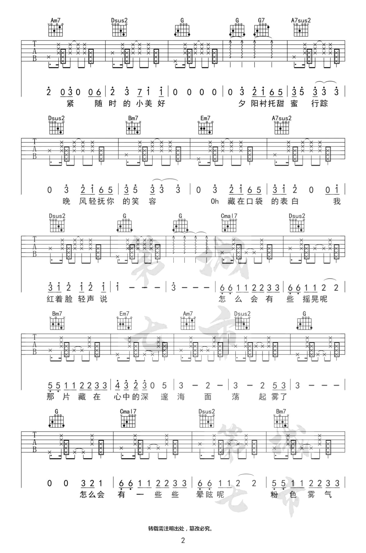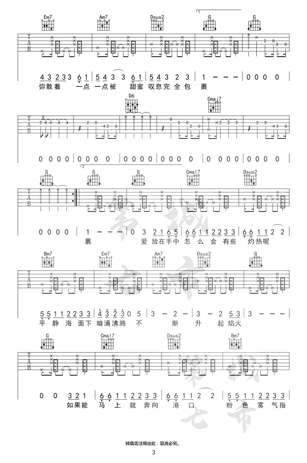 粉雾海吉他谱_易烊千玺_C调弹唱谱_完整版 时间:2020-08-23 来源:第七城市 点击:次 《粉雾海》吉他谱,易烊千玺的一首梦幻唯美的新歌单曲,粉雾海六线谱,原调A选用G调指法,变调夹夹第二品,完整版共四张图片谱。第七城市编配出品,易唱网www.echangwang.com整理上传。 千玺慵懒呢喃式的歌声,吟唱出少年忐忑而甜蜜的心情。简单坚定,就像每一个成长的我们,内心始终保留着一份美好,就仿佛那片梦幻的粉雾海,是我们在现实世界里的Neverland。