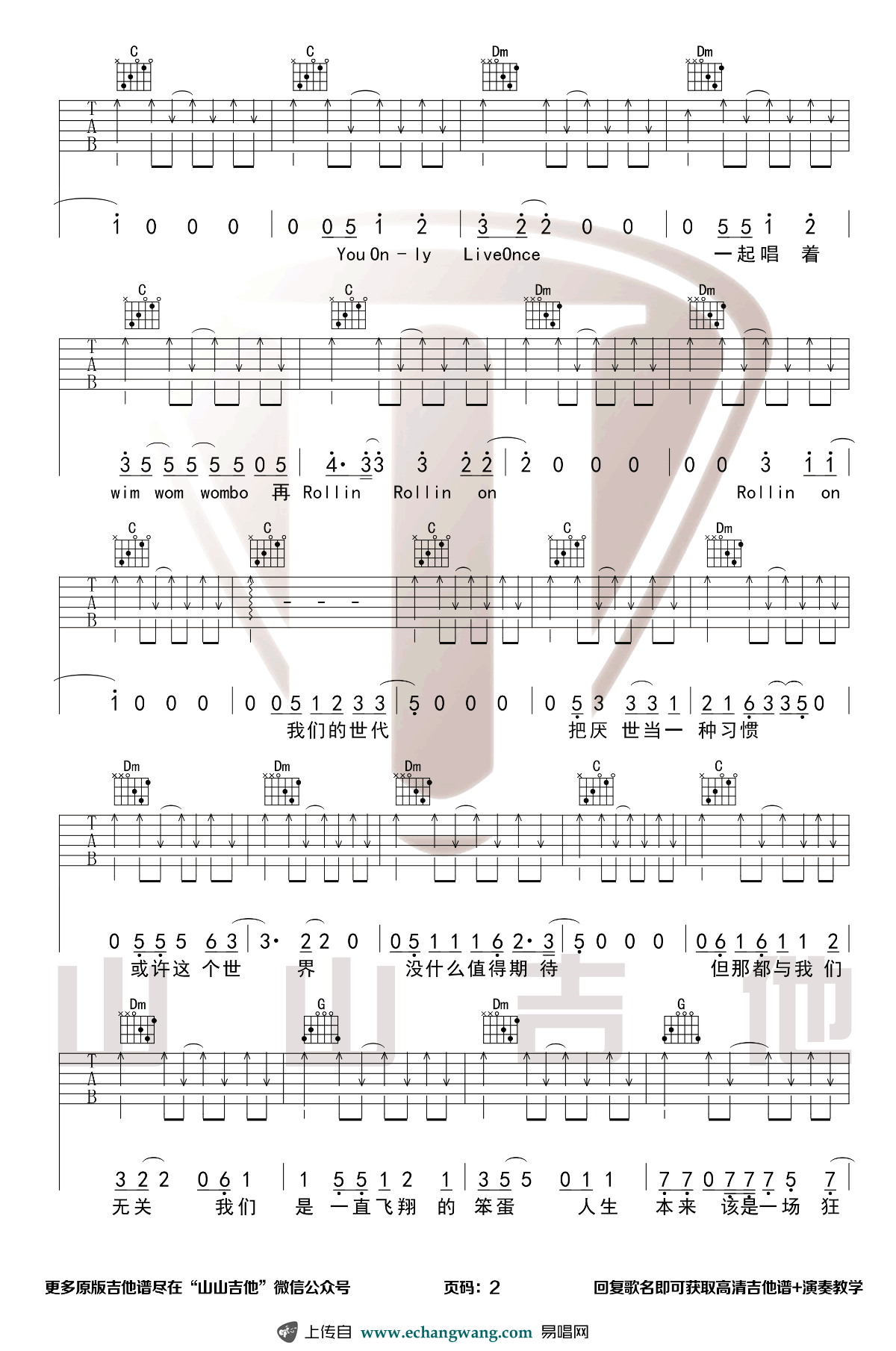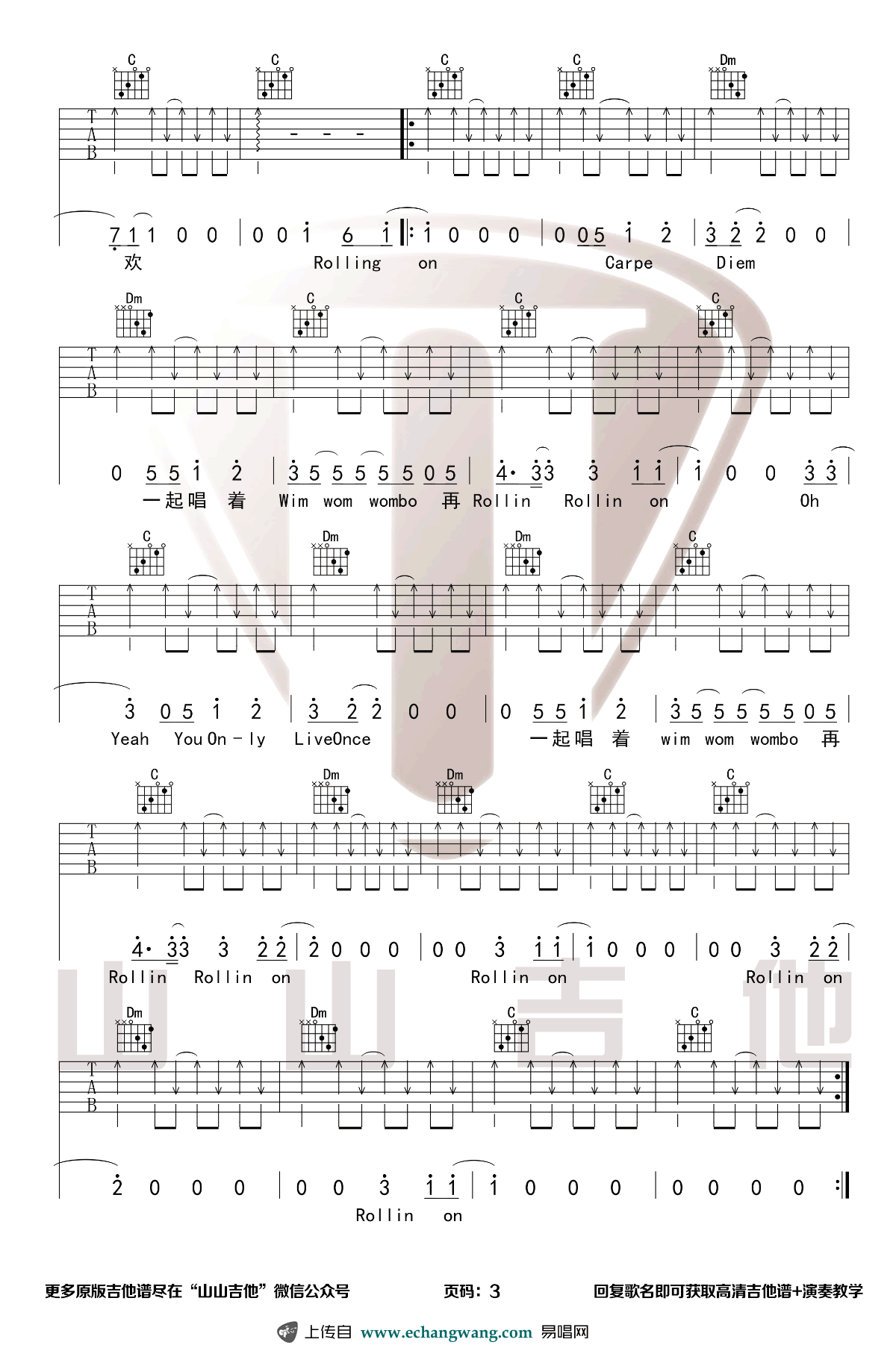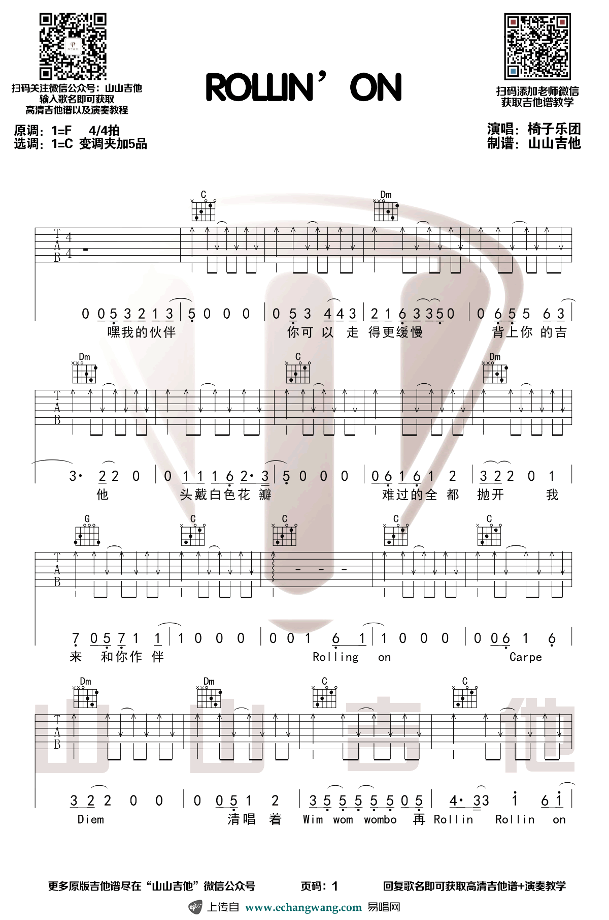 Rollin'on吉他谱_椅子乐团_G调_弹唱演示视频 时间:2020-08-25 来源:山山吉他 点击:次 《Rollin'on》吉他谱,椅子乐团在《乐队的夏天》节目中演唱的一首歌曲,Rollin'on六线谱,原调F,选调C,变调夹夹五品。山山吉他编配制谱,易唱 网echangwang.com上传更新。 台湾椅子乐团这首《Rollin'on》充满了温暖气息,让人可以安静的坐下来听,其实这首歌曲的和弦走向也编配的非常巧妙,山山老师为大家录制了这首歌曲的演示视频,喜欢这首歌的朋友可以拿着吉他谱练起来啦~