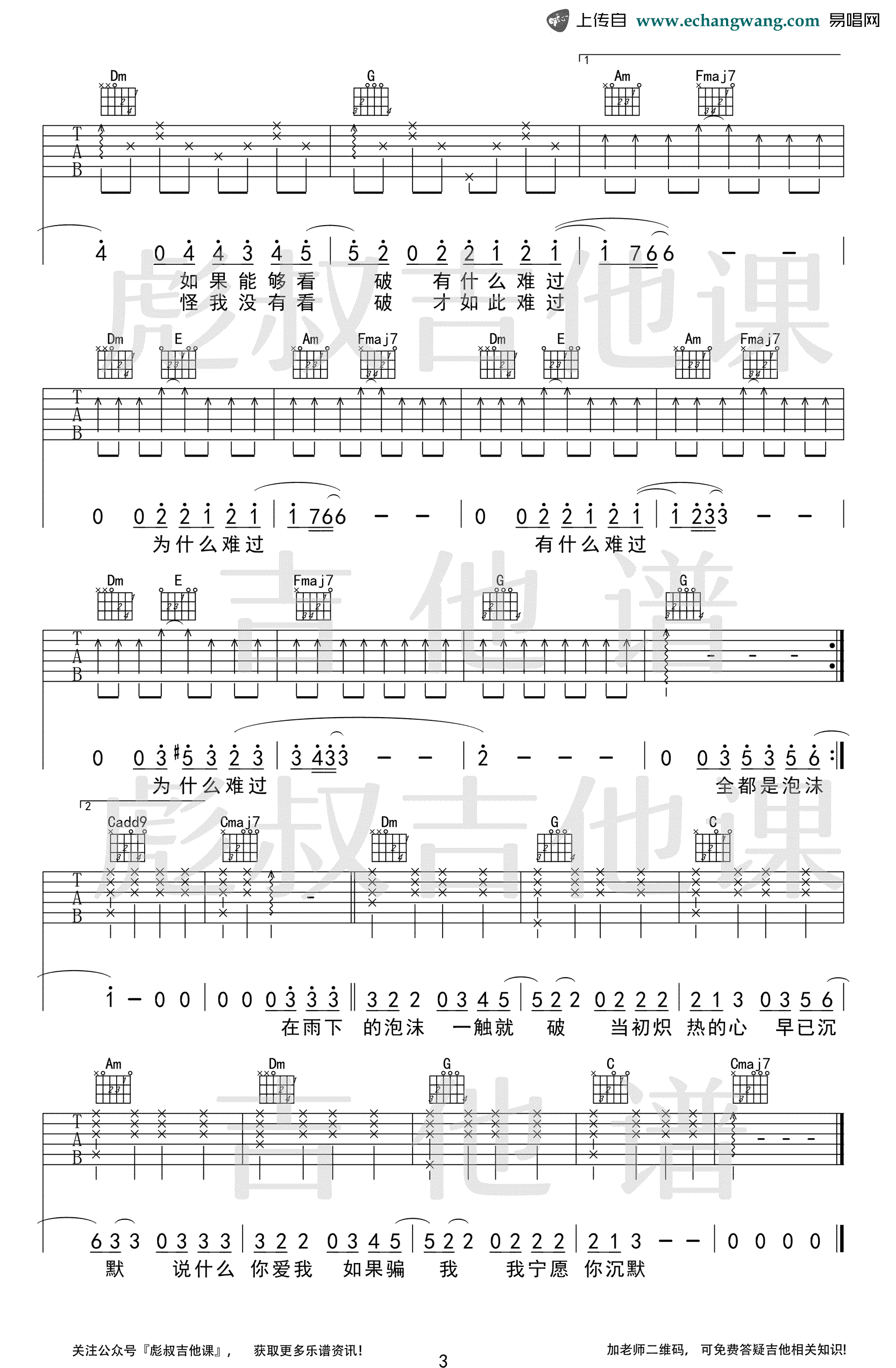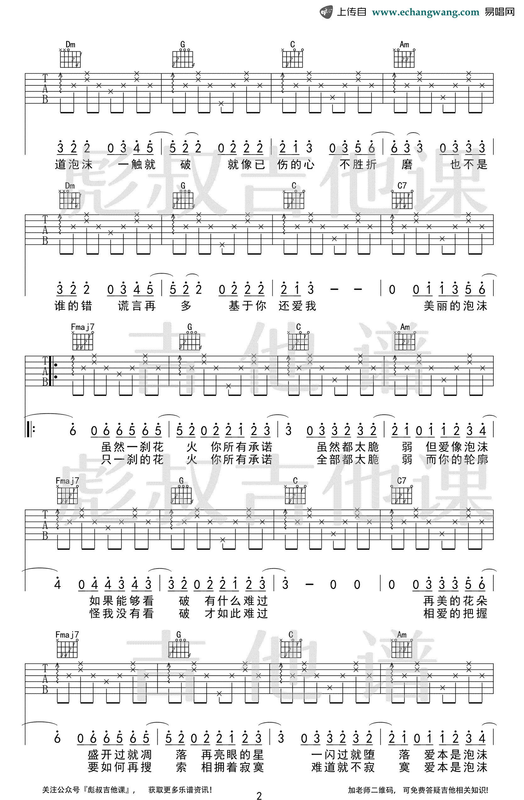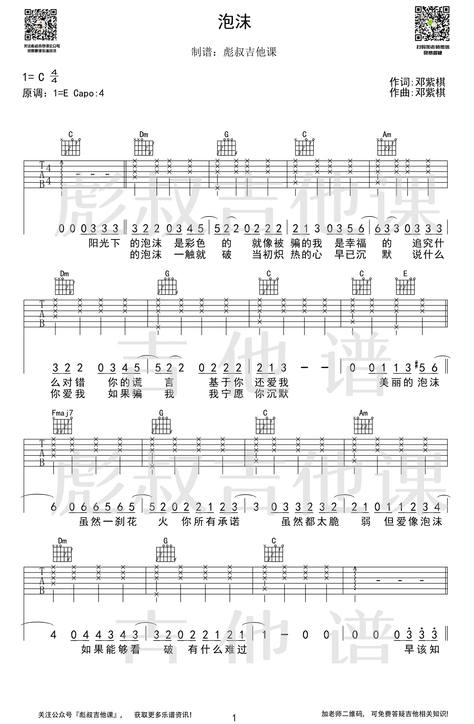 邓紫棋《泡沫》吉他谱_C调指法_弹唱六线谱 时间:2020-08-29 来源:彪叔吉他课 点击:次 《泡沫》吉他谱,邓紫棋演唱的一首代表歌曲,原调E选调C,Capo夹四品。泡沫六线谱,高清弹唱图片谱共三张谱例。彪叔吉他课编配出品,易唱吉他谱网更新上传。 当年一首伤感情歌《泡沫》让人记住了这位金鱼女孩邓紫棋,浸透着落寞回忆的旋律、每一个音符都能唤醒我们内心的那段美丽却易碎的情感。闭上双眼,让我们沉浸在歌声里,弹出属于自己的忧伤和美好。