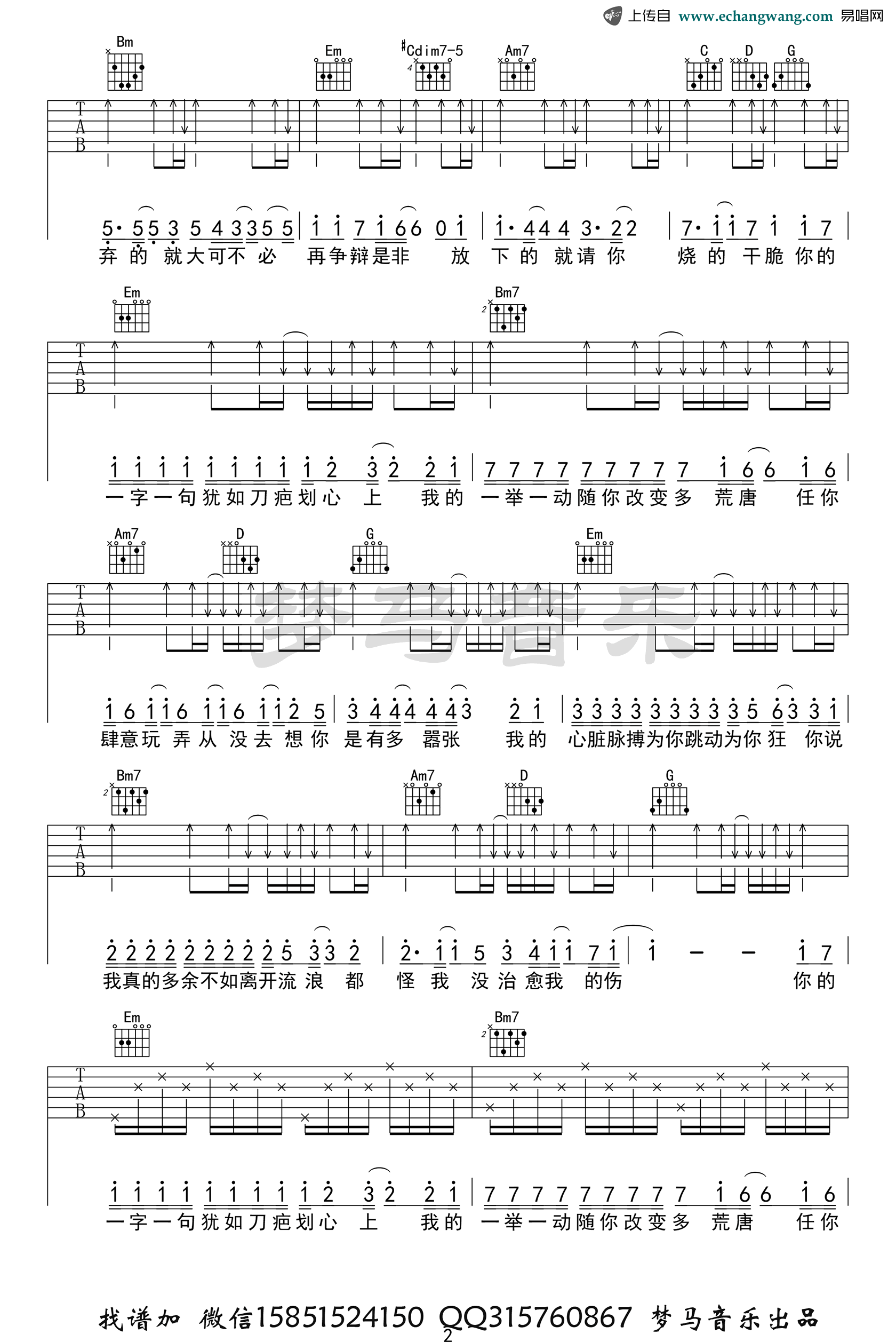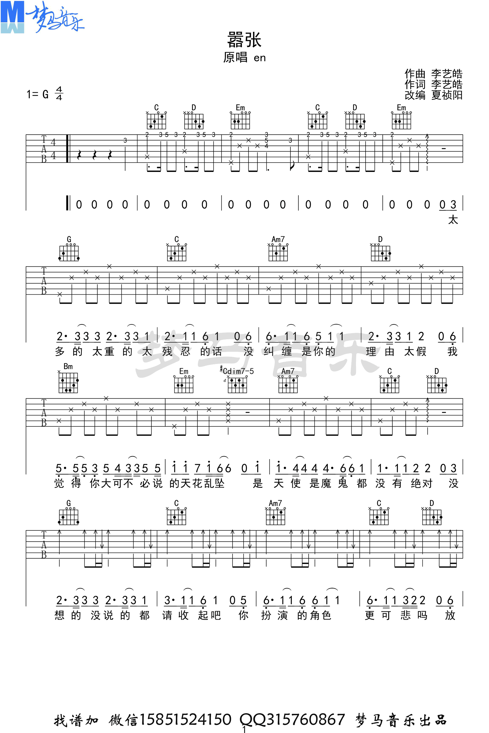 EN《嚣张》吉他谱_G调弹唱谱_高清版 时间:2020-09-04 来源:梦马音乐 点击:次 《嚣张》吉他谱,EN演唱的一首网络热门歌曲,嚣张吉他弹唱谱,G调编配,六线谱三张高清图片,梦马音乐制谱出品,易唱网更新上传。 吉他部分难度也不大,就是副歌对歌手气息的要求比较高,如果气息不够,一定要找好换气的点。