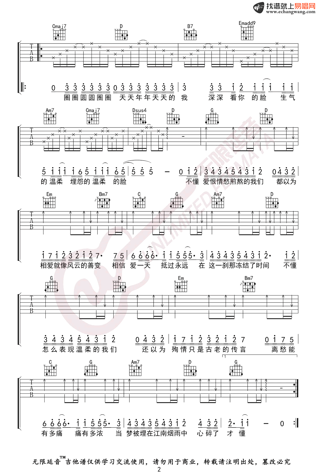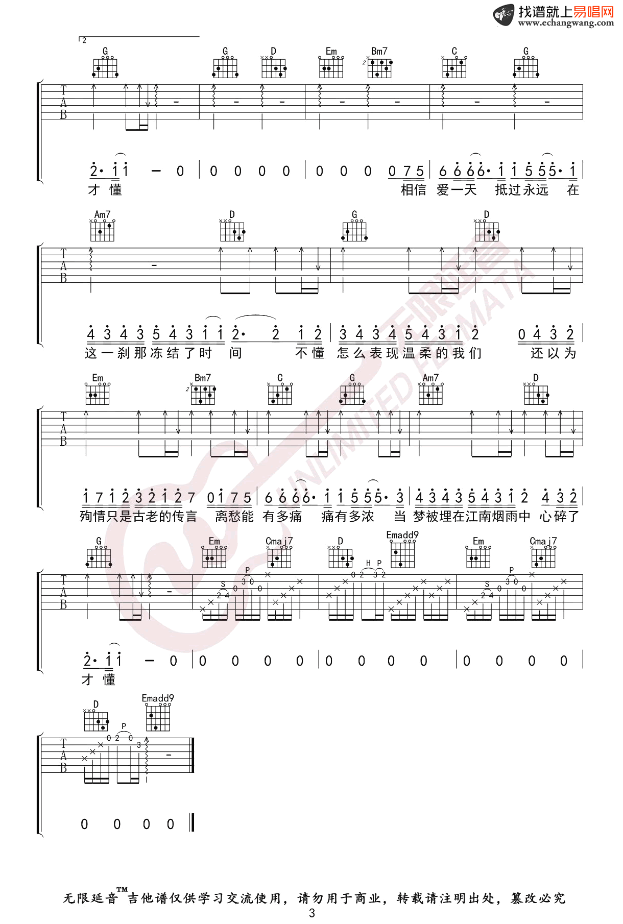 江南吉他谱_林俊杰_G调指法_弹唱图片谱 时间:2020-09-21 来源:无限延音 点击:次 《江南》吉他谱,林俊杰的一首经典代表歌曲,江南吉他弹唱谱,原调降B,曲谱选用G调指法来编配,琴友们选择变调夹夹第三品。感谢无限延音制谱分享,易唱网更新上传。 这首老歌距今发行不觉间已经十六年了,不知曾经古老烟雨江南殉情的传言,还是多少人的旧时回忆?JJ唱述的故事总是忧伤动人,而唯美温柔中,却始终带着一份坚定,一不小心就戳中我们内心最柔软的地方。