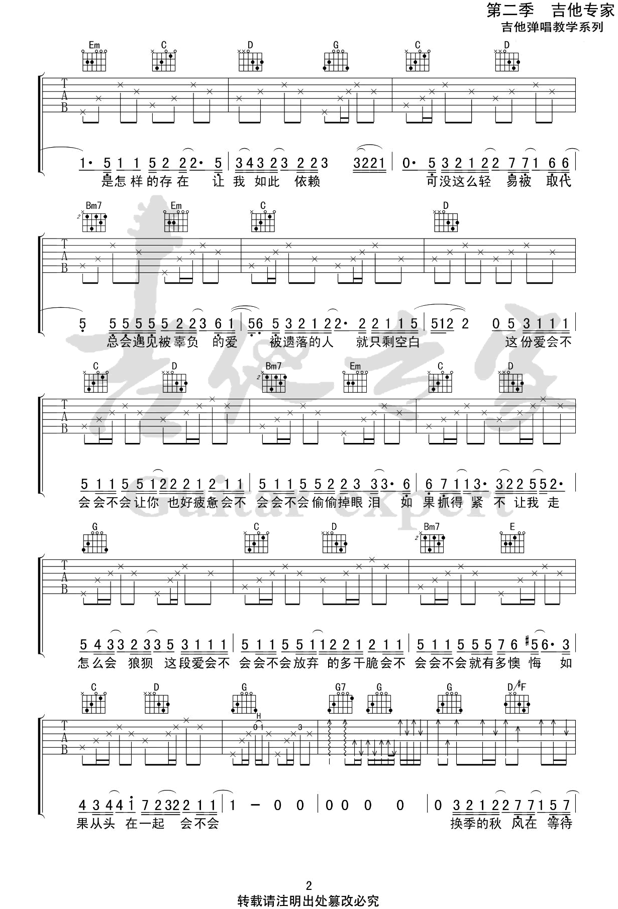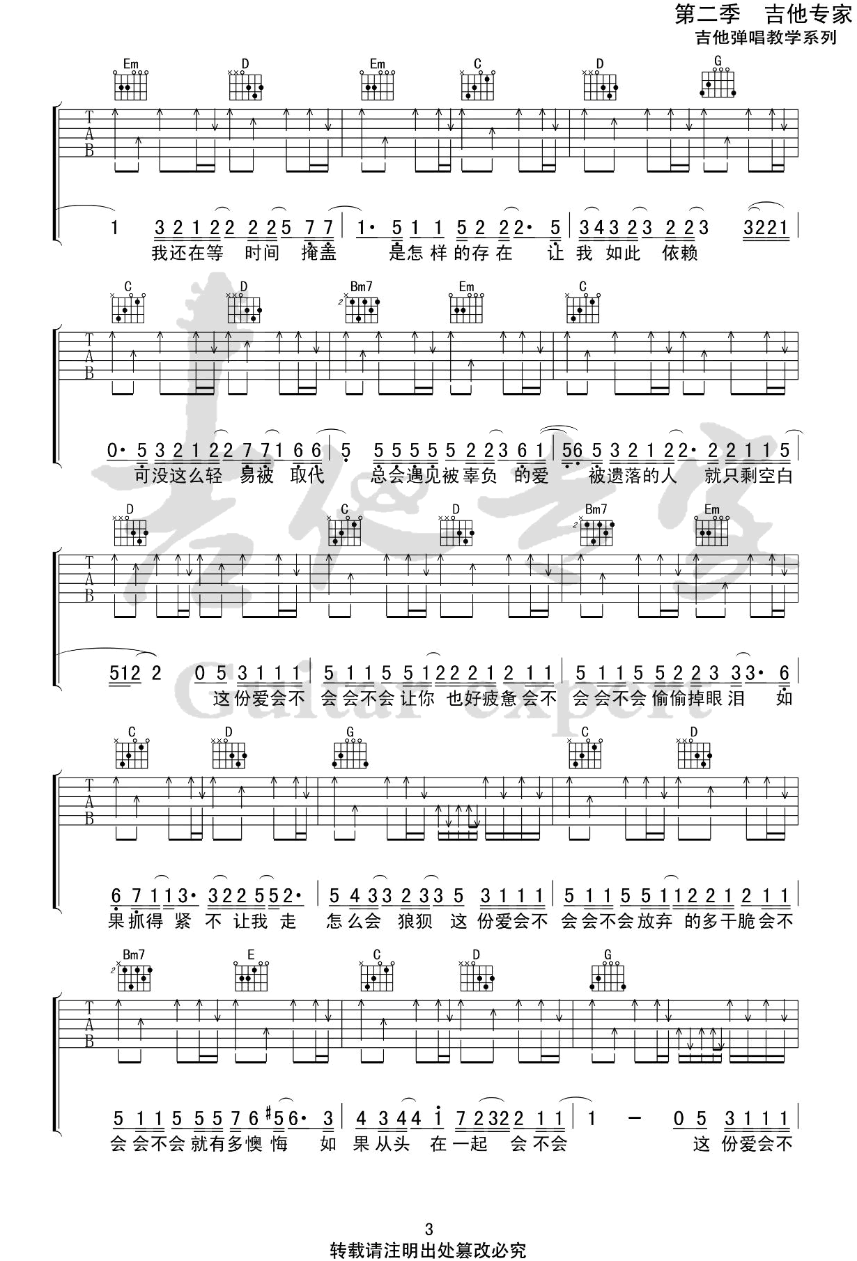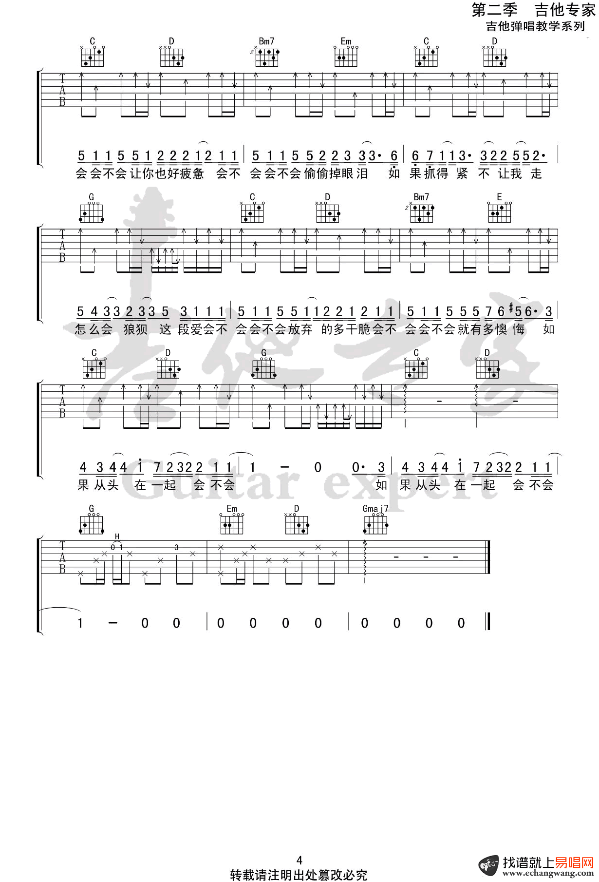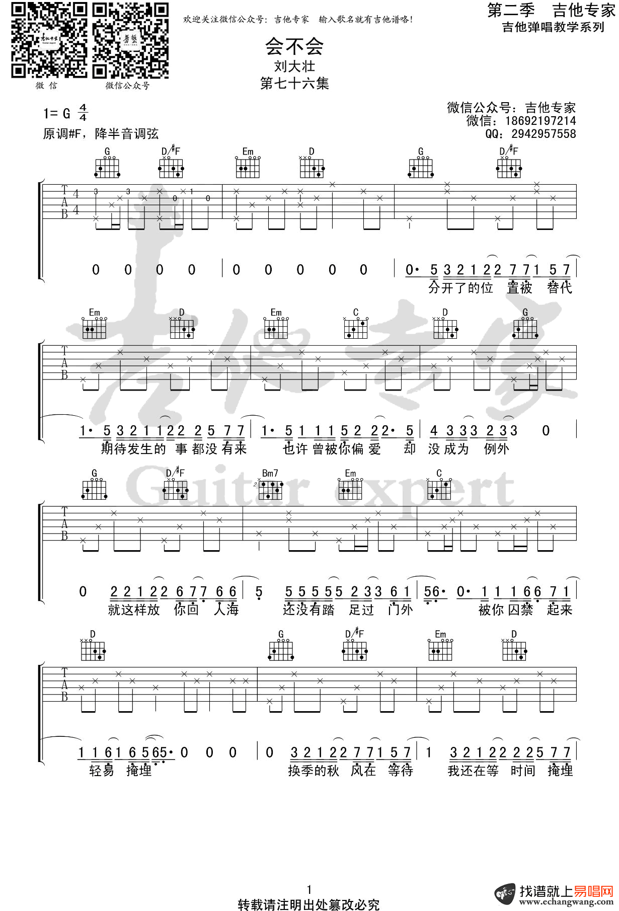 会不会吉他谱_刘大壮_G调_弹唱谱_原版六线谱 时间:2020-09-29 来源:吉他专家 点击:次 刘大壮《会不会》吉他谱,一首网络热门歌曲,会不会吉他弹唱谱,原调升F,选用G调指法,降半音调弦。完整编配共四张图片六线谱,吉他专家分享,易唱网吉他谱更新上传。 抖音最近的一首热门新歌,网易云音乐榜位居前列,会不会吉他版,喜欢这首歌曲的琴友们不可错过。